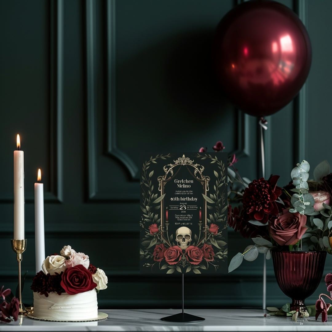 Invite a touch of dark elegance to your celebration with our Gothic Vintage Birthday Invitation. This striking invitation features a dark green background adorned with deep red roses, gold accents, and a dramatic skull motif. Perfect for those who appreciate gothic and vintage aesthetics, this invitation sets the tone for a uniquely memorable event.