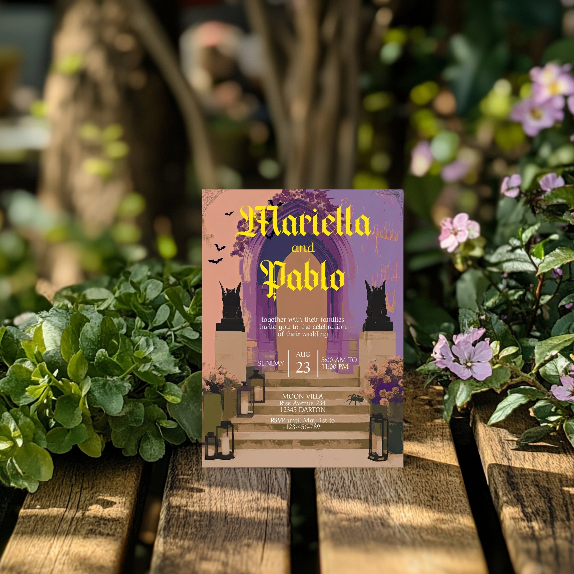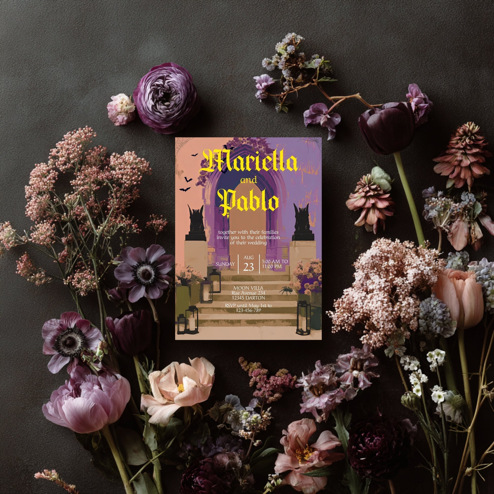 Dare to be different with this stunning gothic wedding invitation—perfect for moody romantics and lovers of the mysterious. Featuring gothic archways, watchful gargoyles, and romantic lantern-lit steps, this digital invitation sets the stage for a darkly elegant celebration. Multiple color options and full customization make it easy to match your wedding's unique aesthetic.