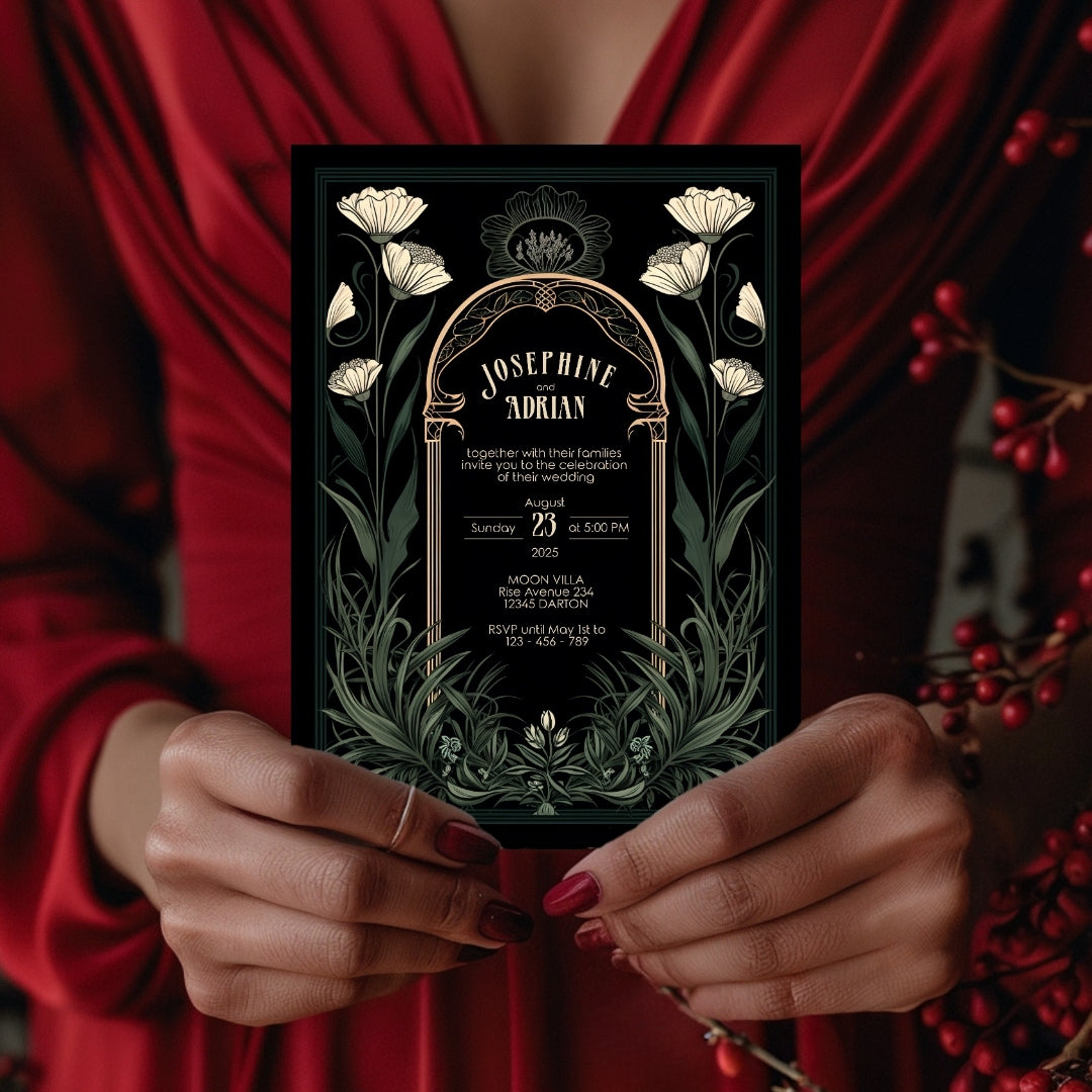 This Gothic art deco inspired botanical invitation merges the elegance of the roaring twenties with the intricate beauty of a botanical garden. Its floral arches, botanical motifs, and dark color palette, including deep greens and blacks, create a moody and dramatic aesthetic, perfect for weddings, birthdays, anniversaries, or any special occasion that calls for an elegant touch. Fully customizable with Corjl, the template offers seamless editing for various events. Download, print at home or professionally, or share digitally, making it a versatile and elegant solution for your event planning needs.