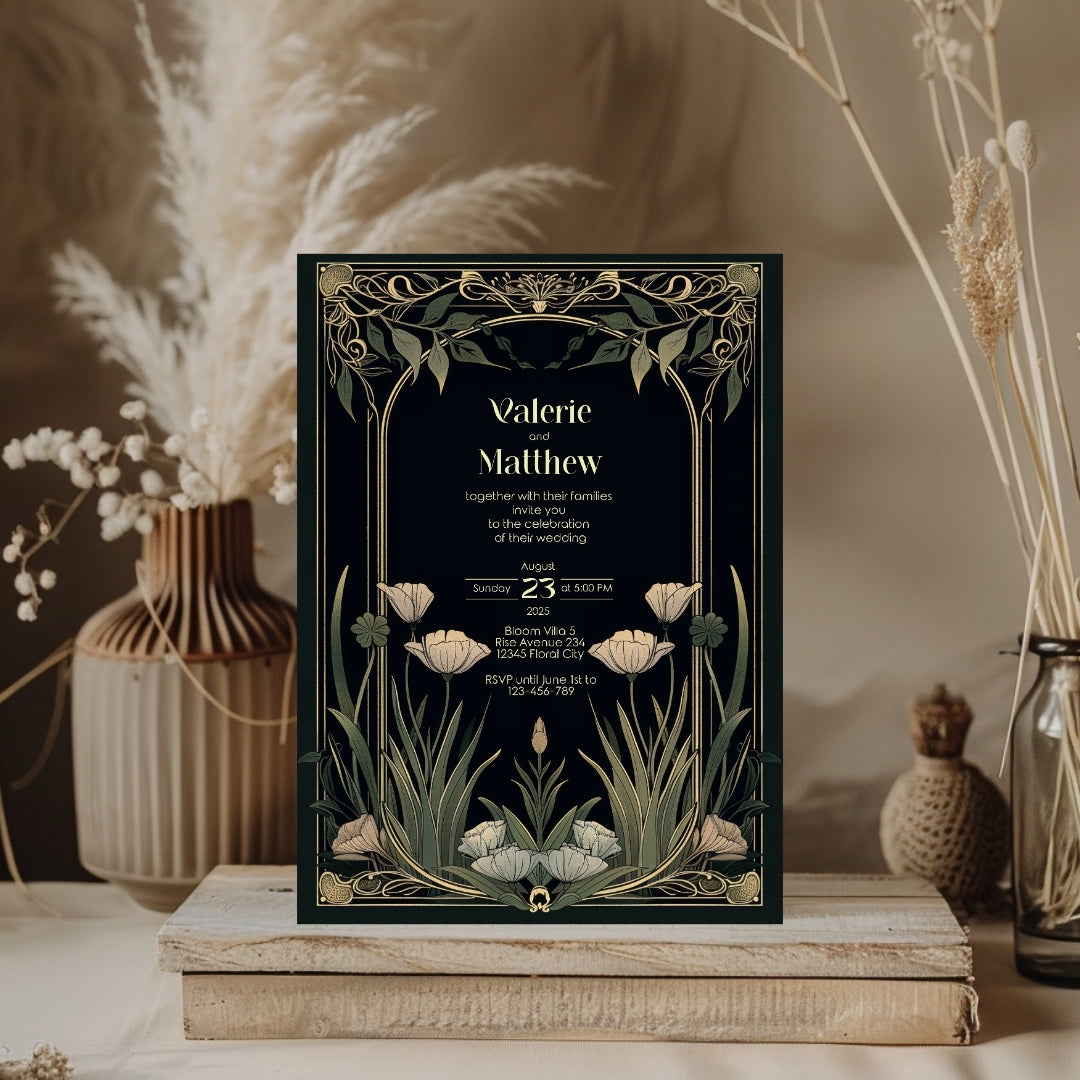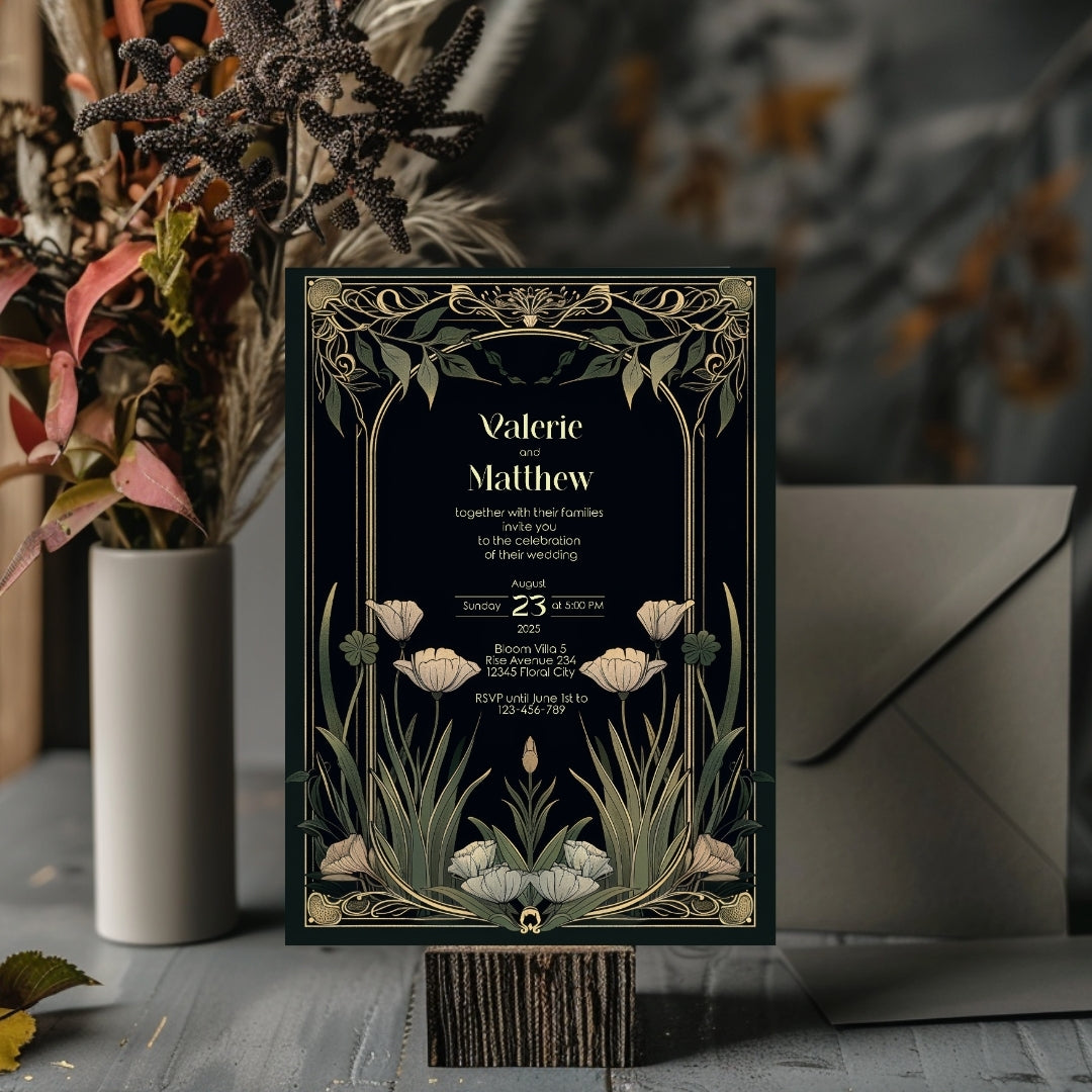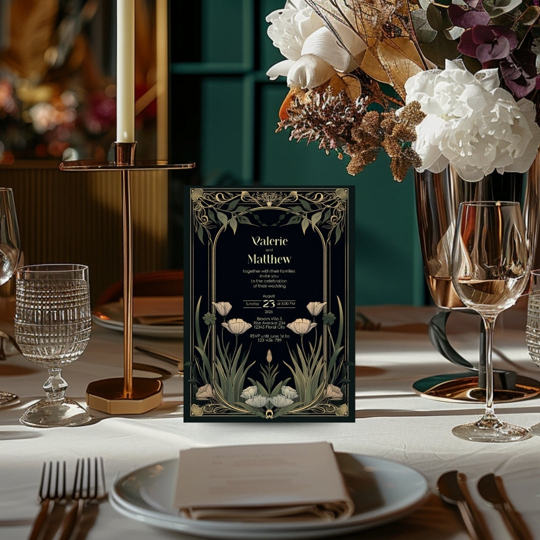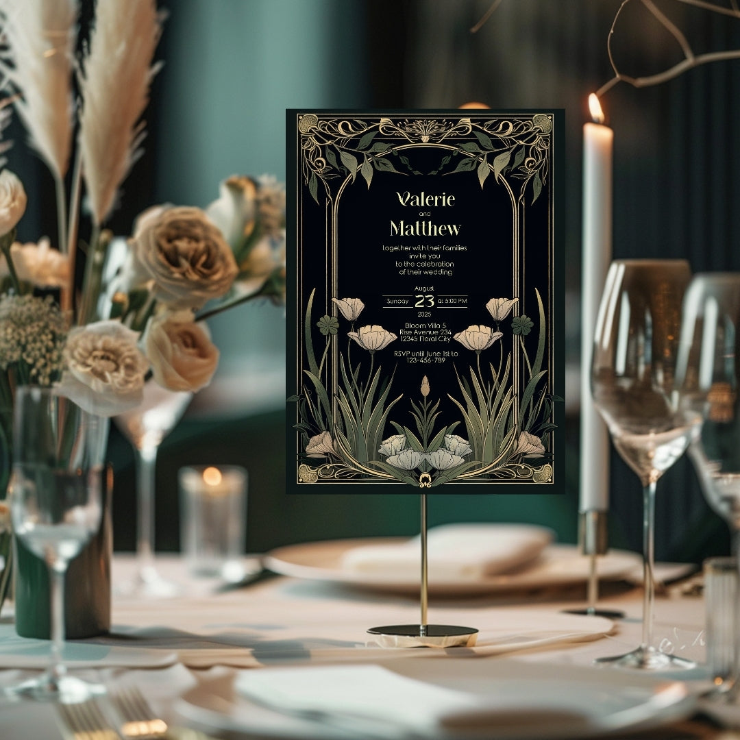 Step into the grandeur of yesteryear with our Classic Art Deco Invitation Template, designed to imbue your upcoming event with the timeless elegance of the 1920s. The sleek, dark background sets a dramatic stage for the gold-accented arches and the delicate beauty of white tulips, creating a stunning contrast that exudes sophistication. Perfect for a vintage-themed wedding, an artful anniversary celebration, or a birthday bash with a twist of old-school glamour, this template is versatile and breathtaking. With instant access to edit and personalize via Corjl, you can tailor every detail to your liking, ensuring your invitations are as unique as your event. Invite your guests to partake in the charm and splendor of an unforgettable celebration with this beautifully designed digital invitation.