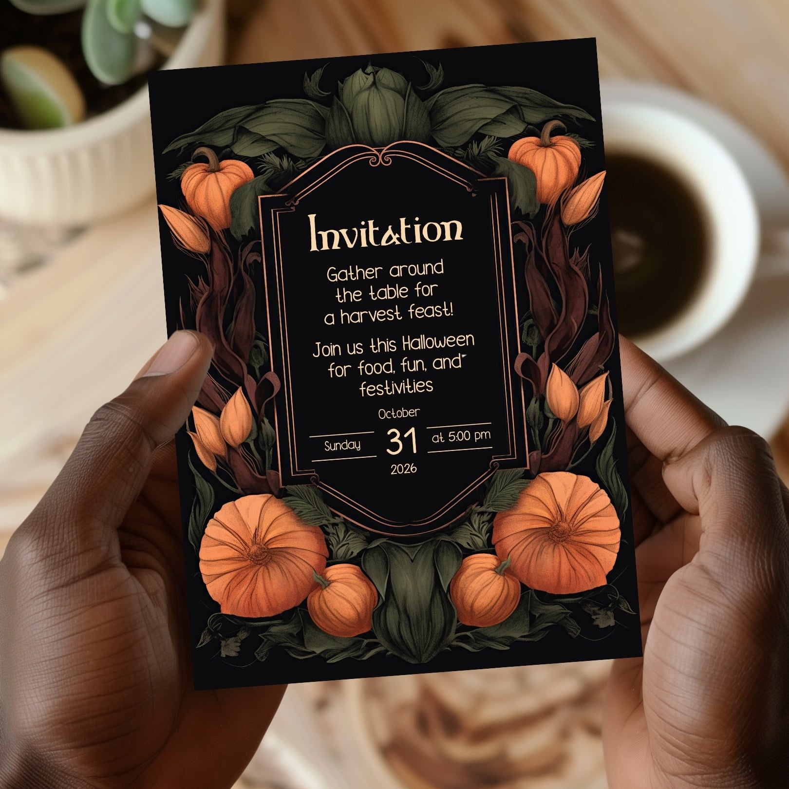 ✔️𝙎𝙩𝙪𝙣𝙣𝙞𝙣𝙜 𝘿𝙚𝙨𝙞𝙜𝙣: This invitation blends the themes of autumn and gothic elegance, showcasing detailed pumpkins and florals framed by lush leaves. The deep black background enhances the warm, rich colors, making this invitation a perfect choice for a Halloween event with a cozy, seasonal theme.