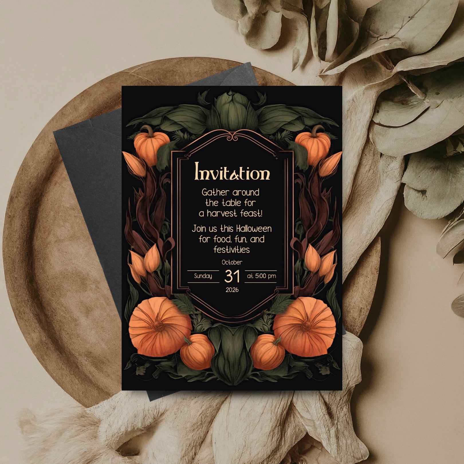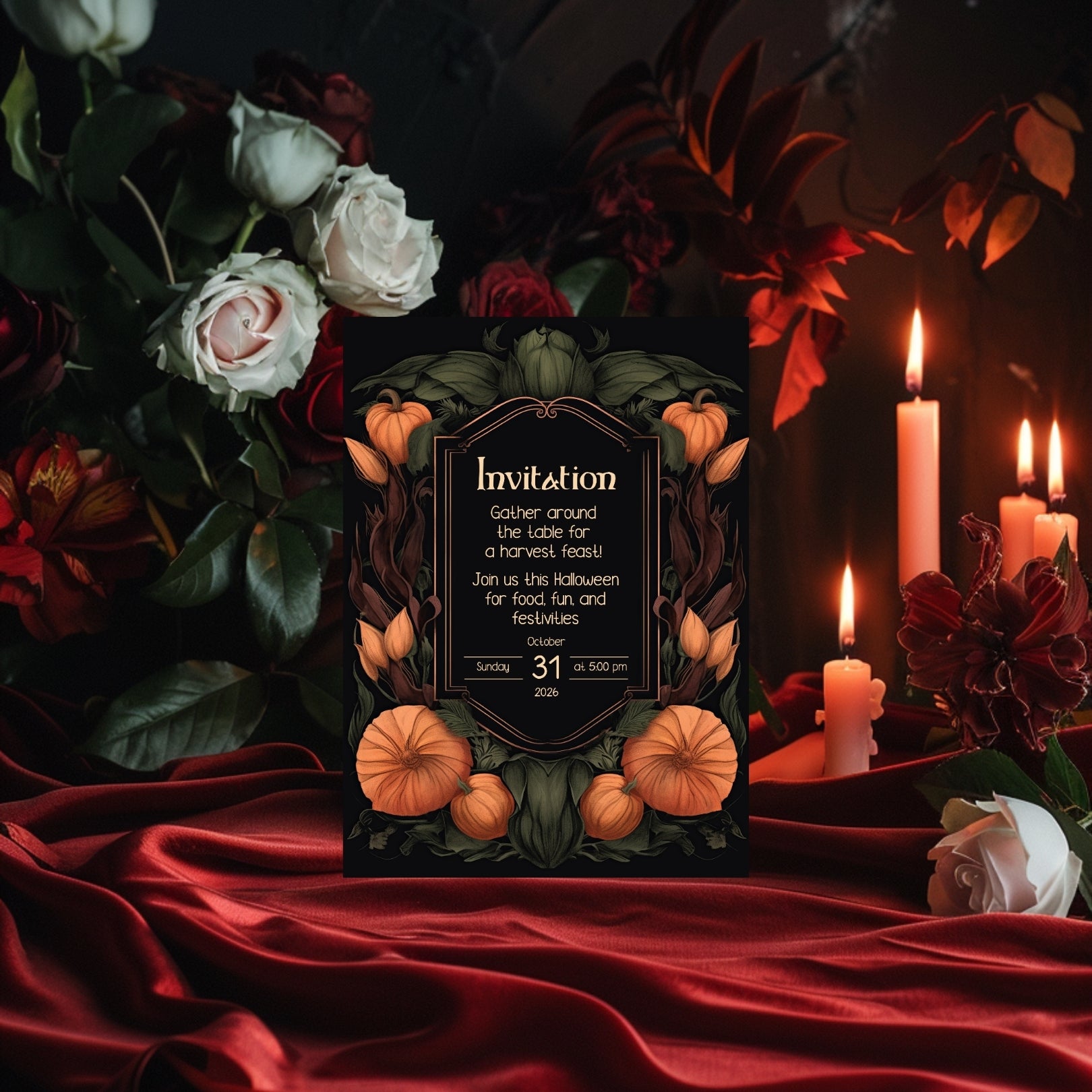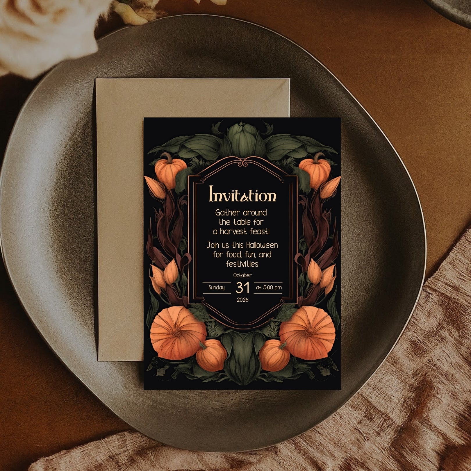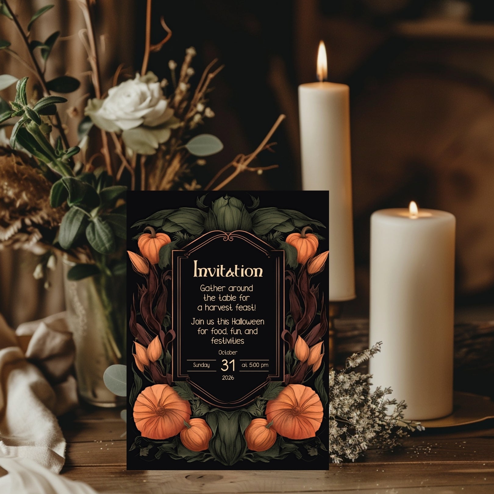 Harvest Gothic Halloween Invitation - Pumpkin and Floral Autumn Feast Design