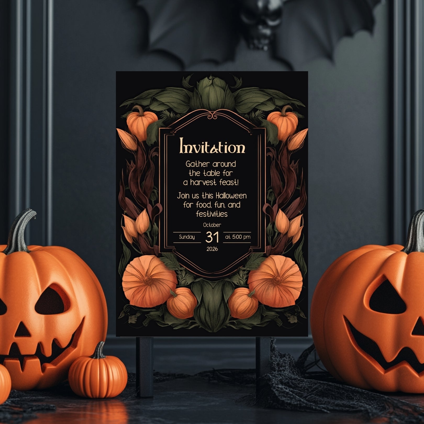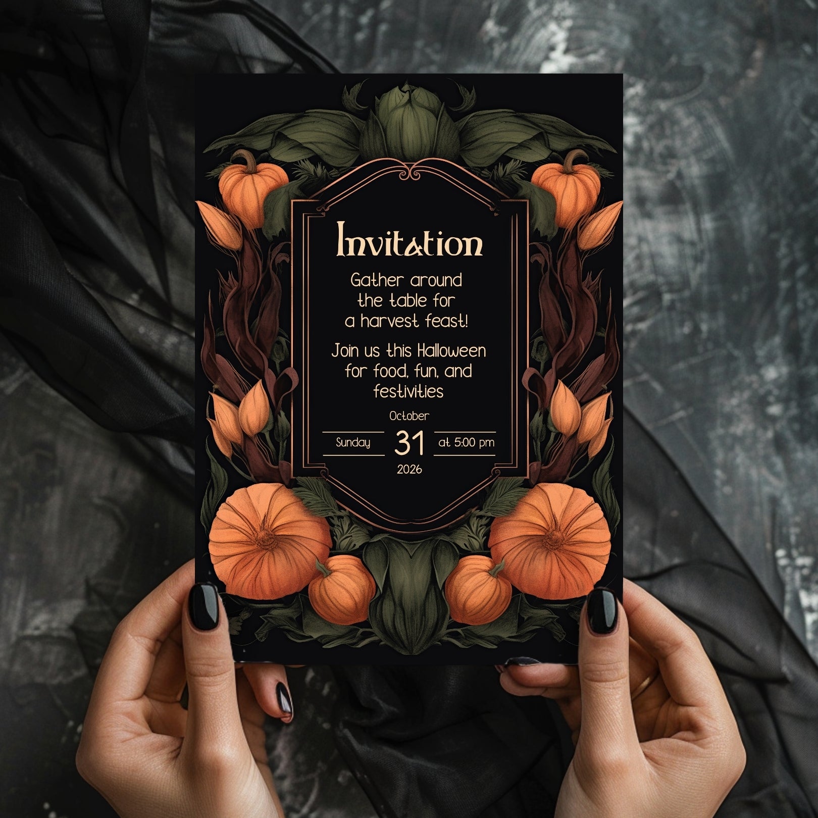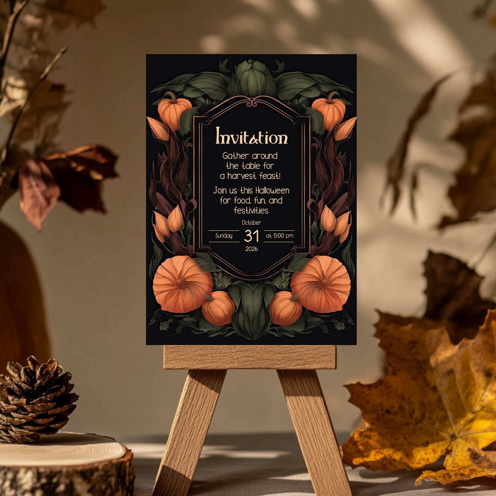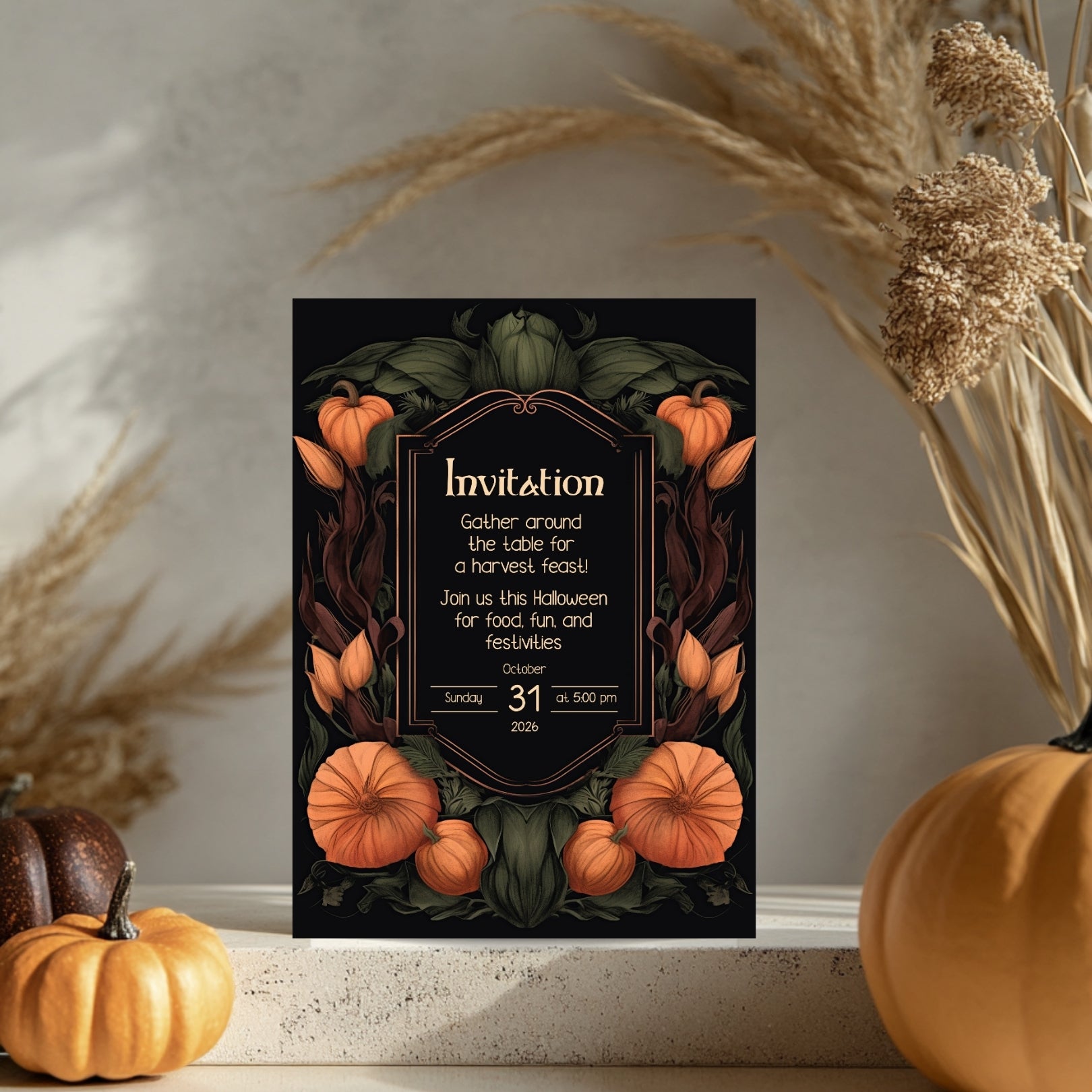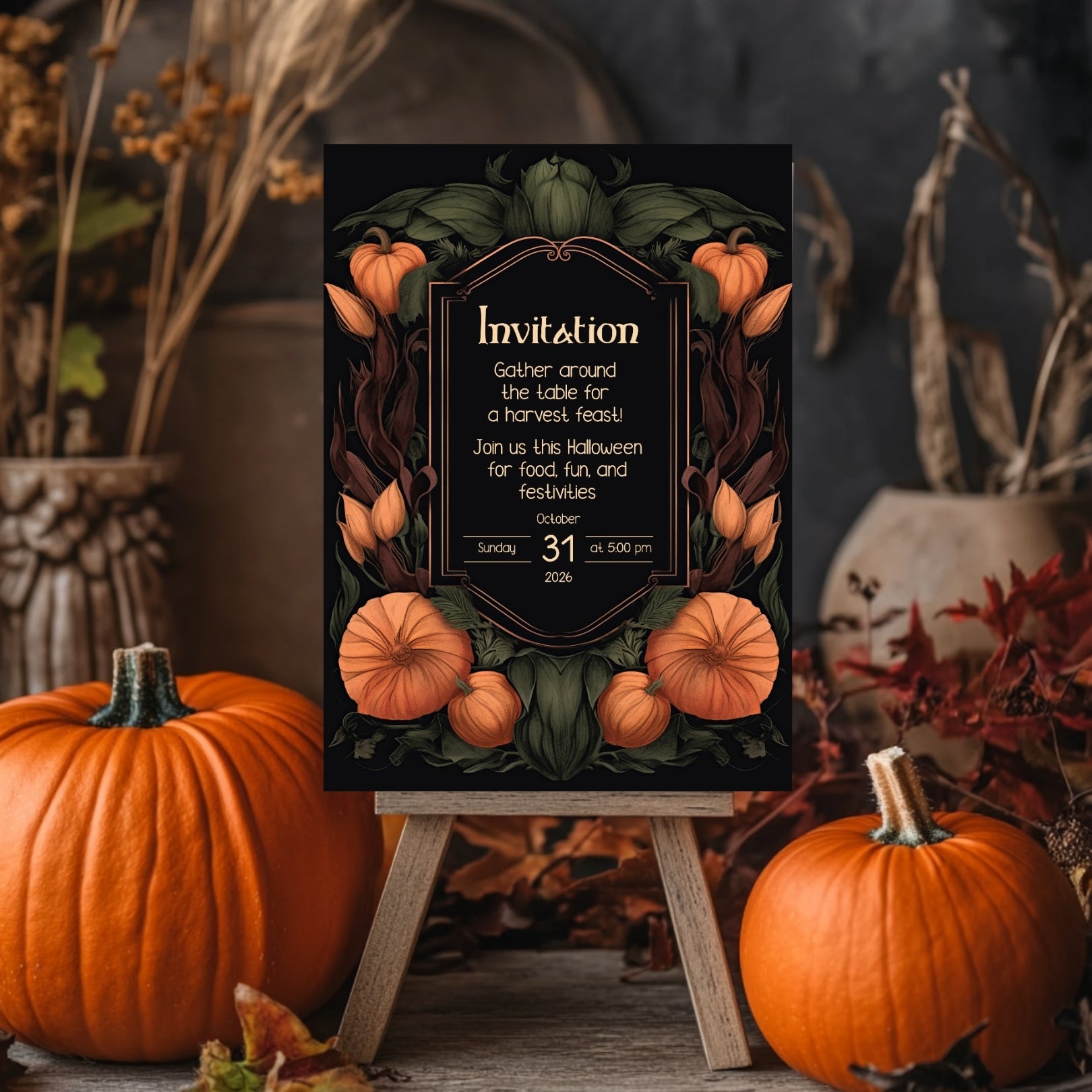 Harvest Gothic Halloween Invitation - Pumpkin and Floral Autumn Feast Design
