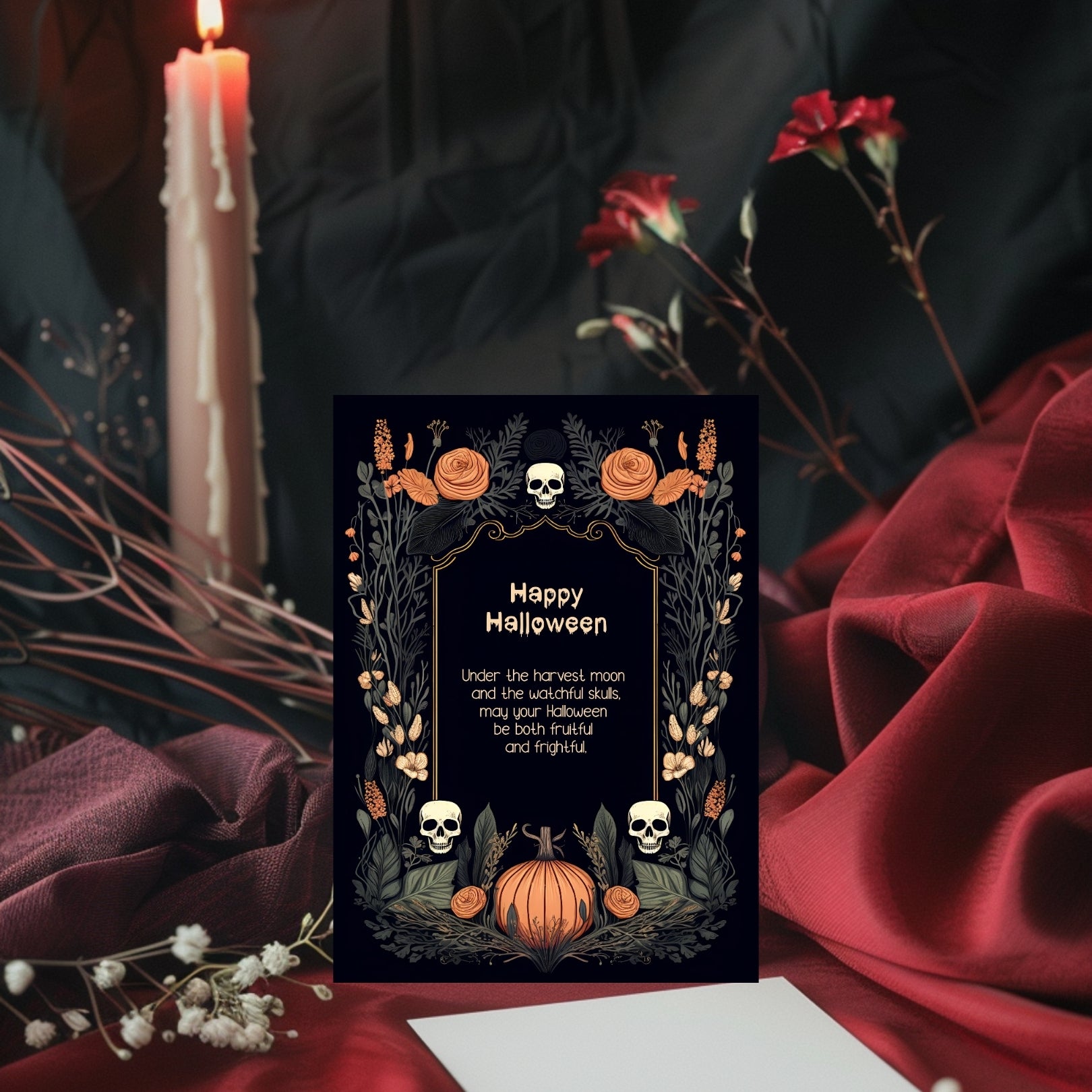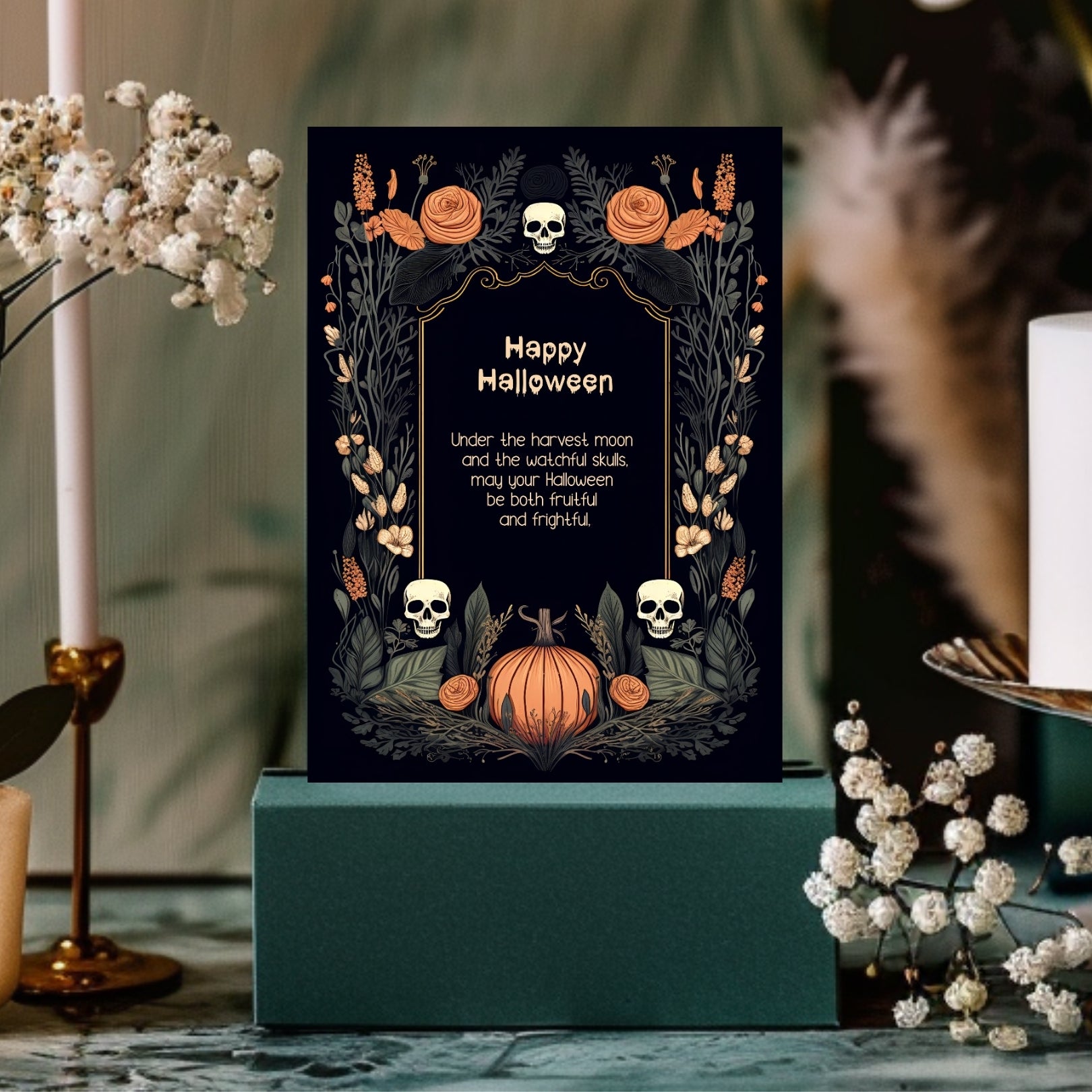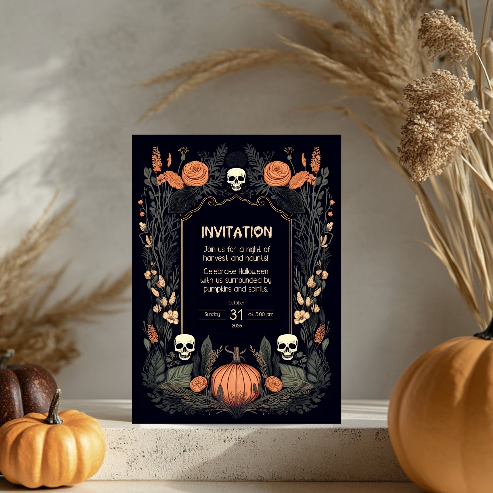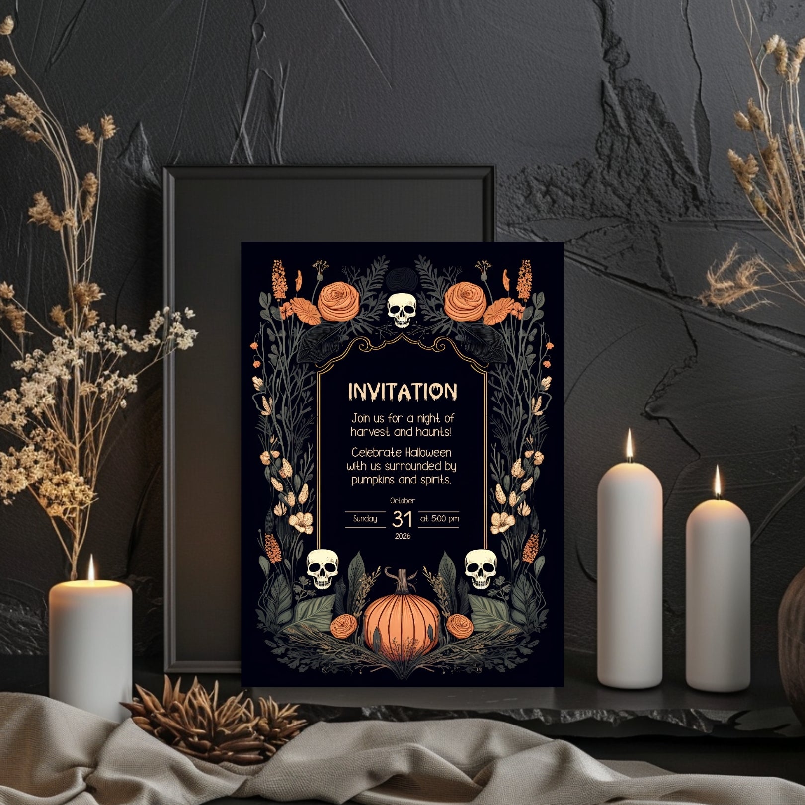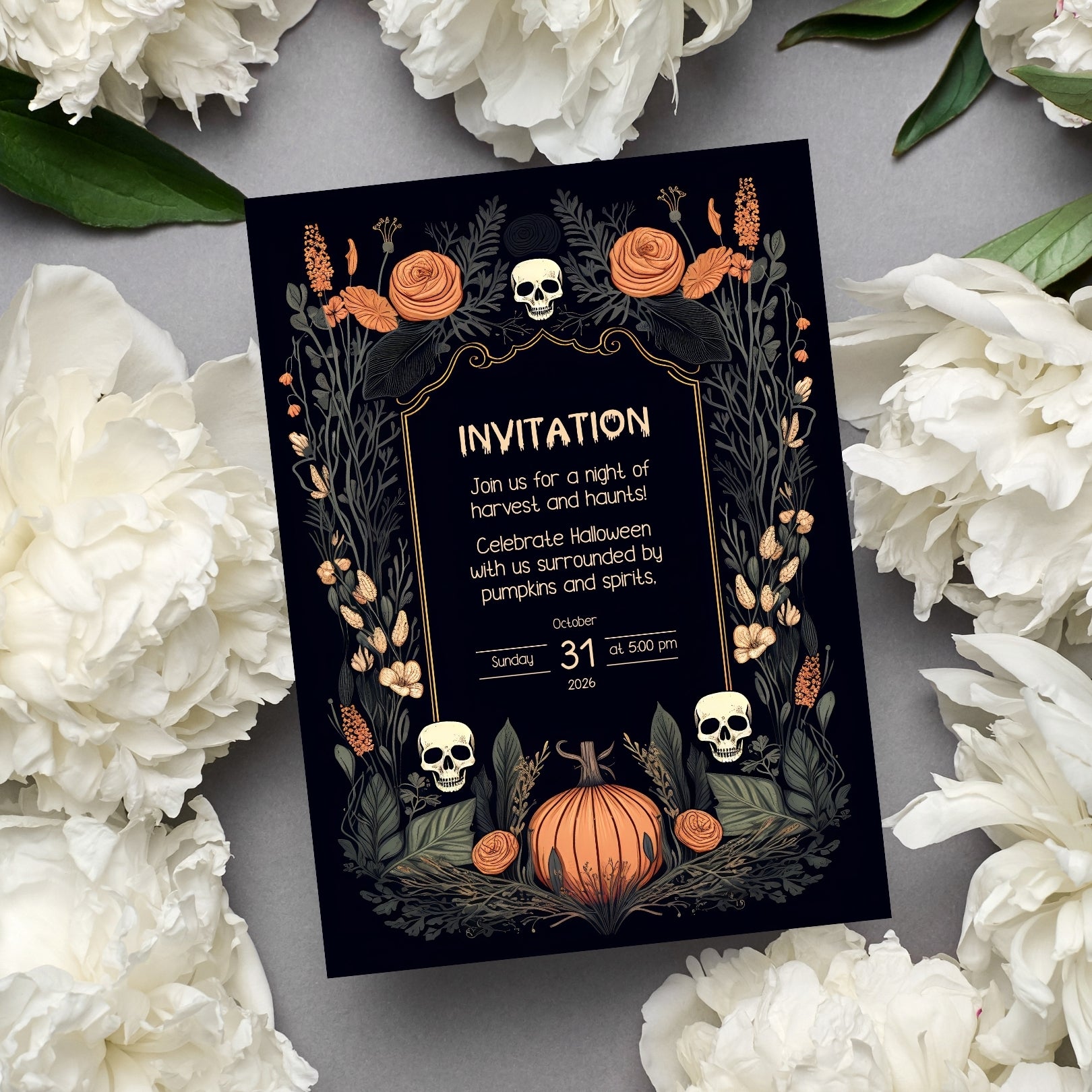 Harvest Gothic Halloween Invitation - Pumpkin and Skull Autumnal Design