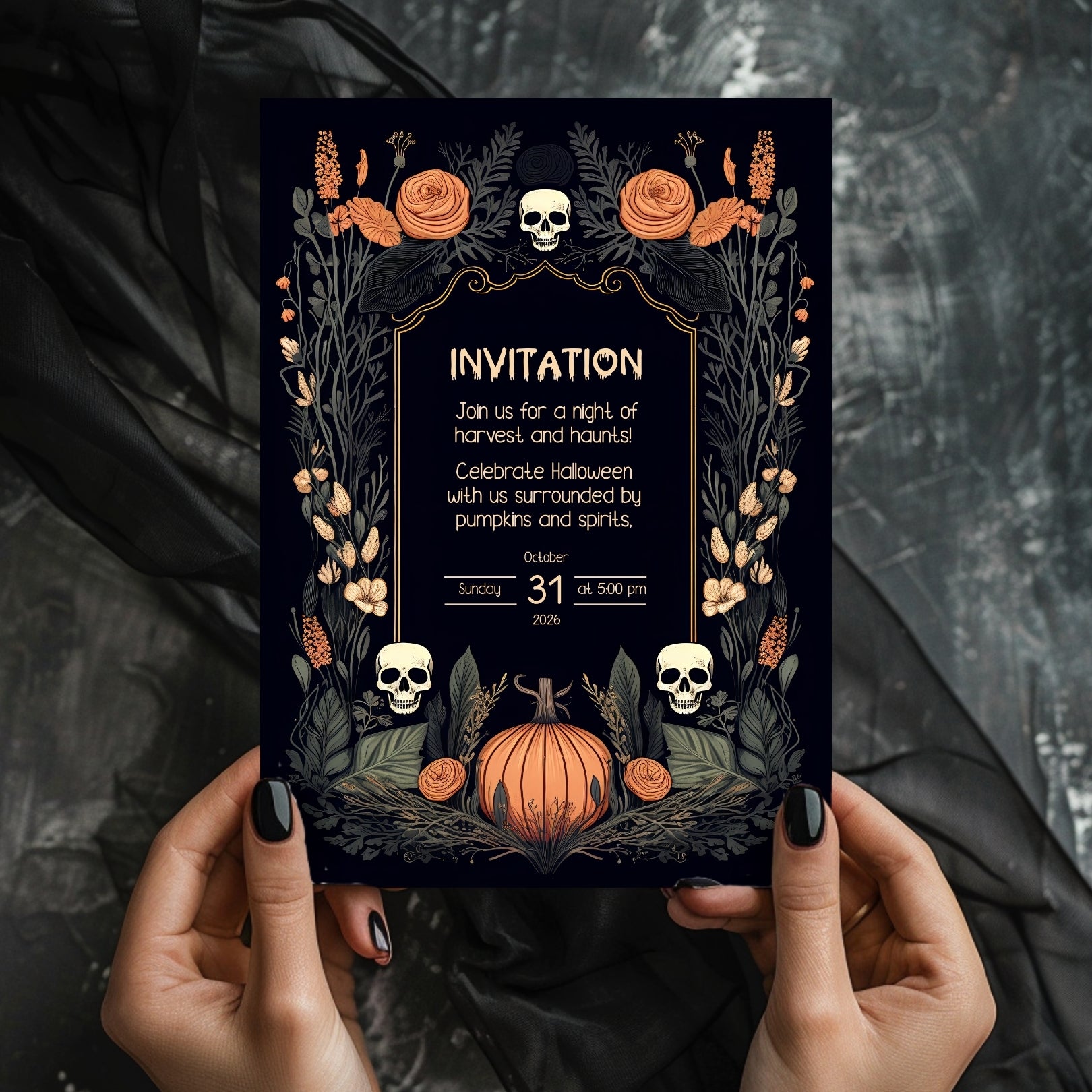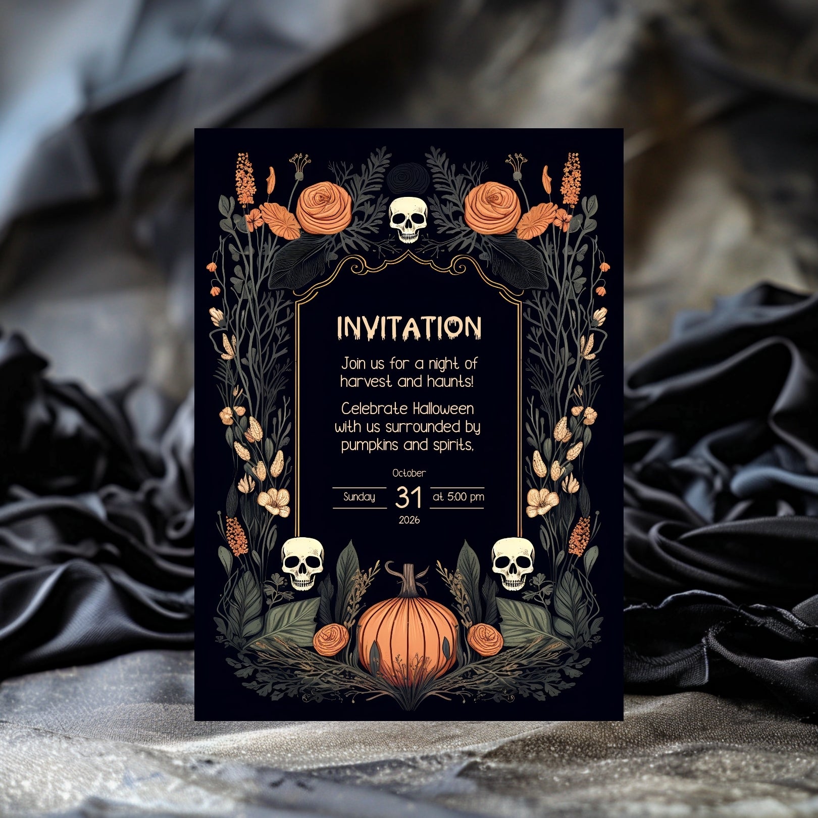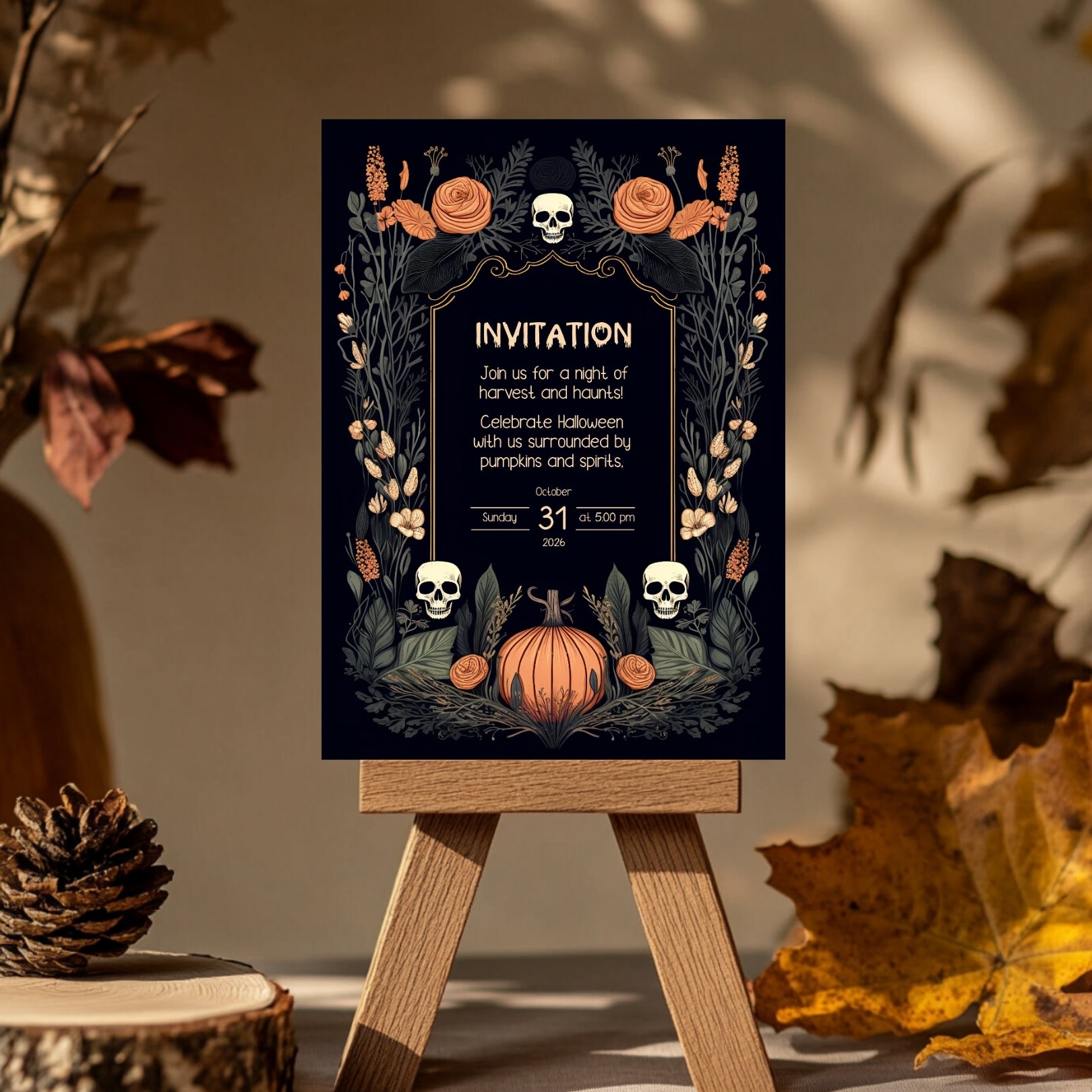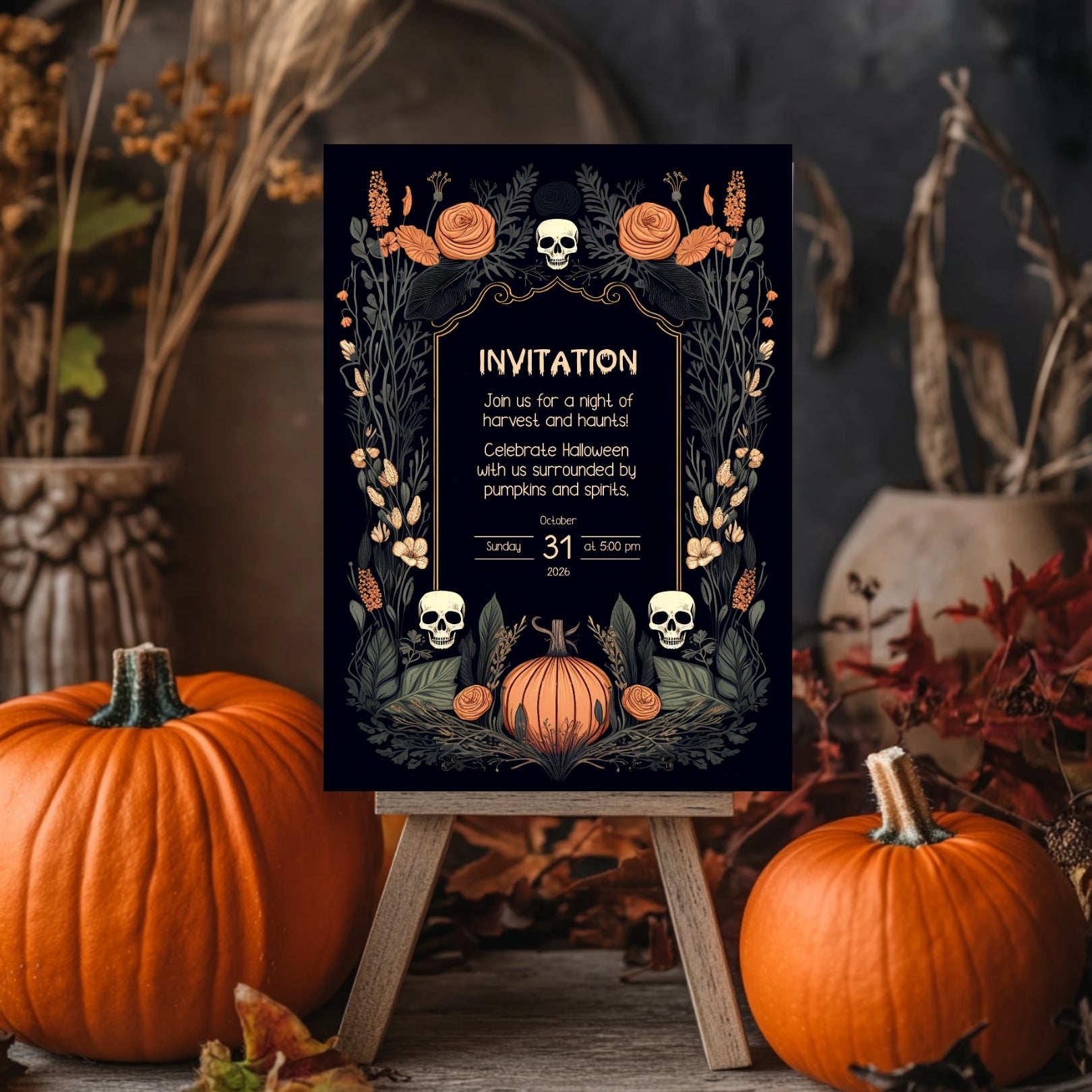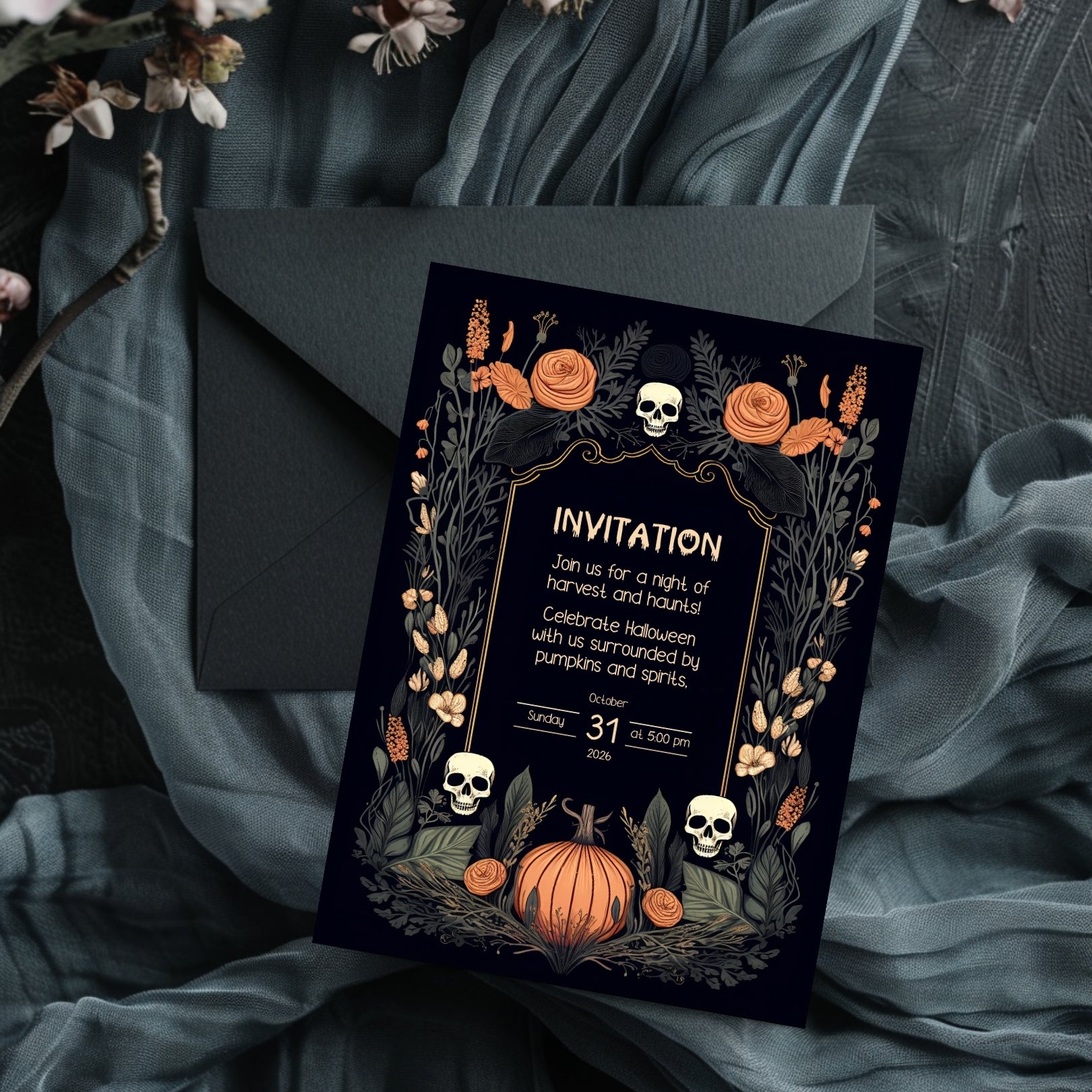 ✔️𝙎𝙩𝙪𝙣𝙣𝙞𝙣𝙜 𝘿𝙚𝙨𝙞𝙜𝙣: This invitation blends the themes of harvest and gothic elegance, showcasing detailed pumpkins and skulls surrounded by autumnal florals. The deep black background enhances the warm, rich colors, making this invitation a perfect choice for a Halloween event with a seasonal theme.