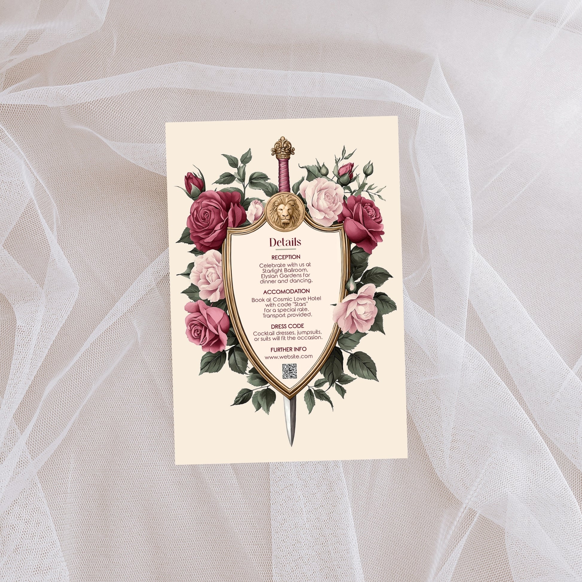 Medieval Wedding Invitation Set - Lion Crest, Roses and Gold Shield, Editable 8 items