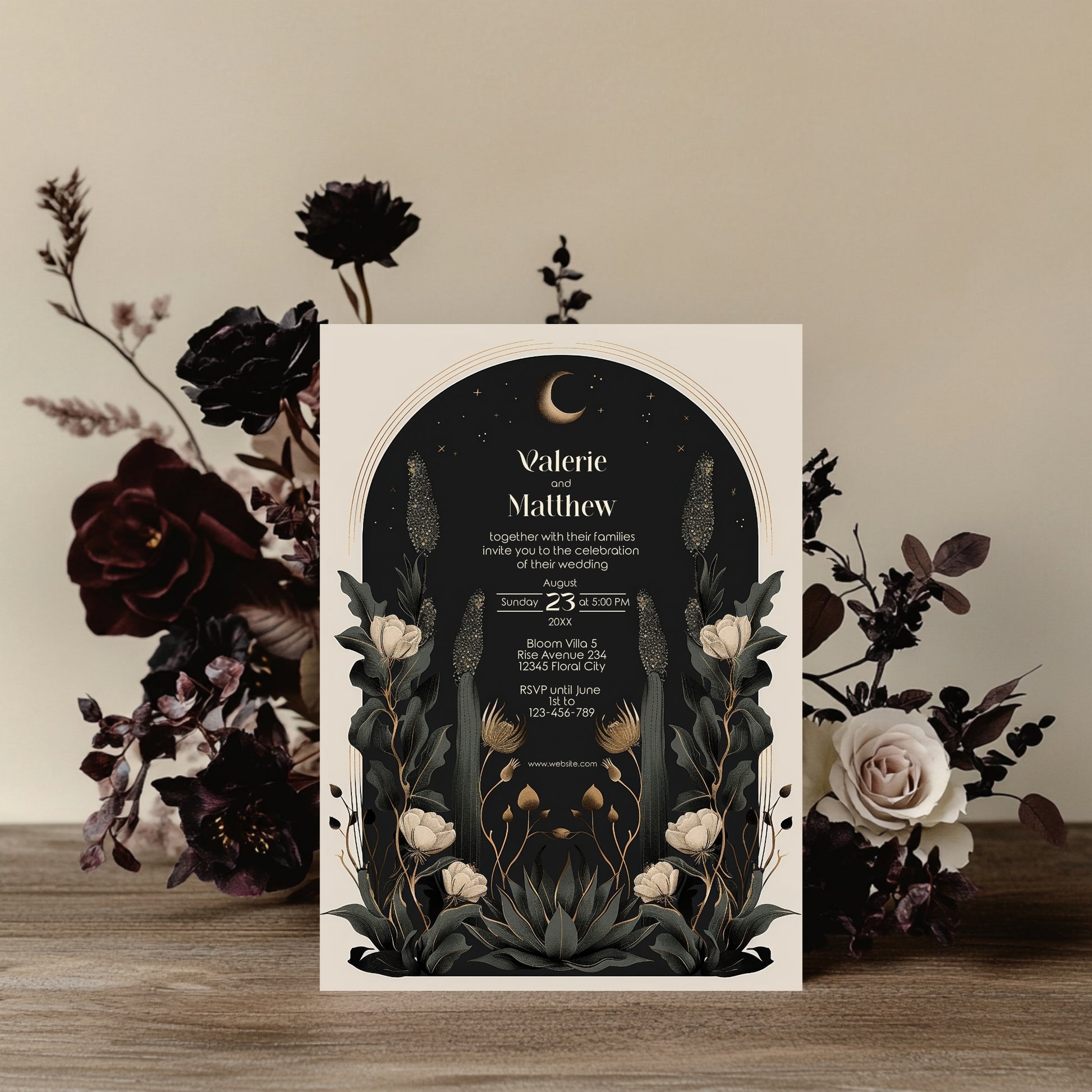Moody Celestial Wedding Invitation - Moon and Stars Design with Floral Accents