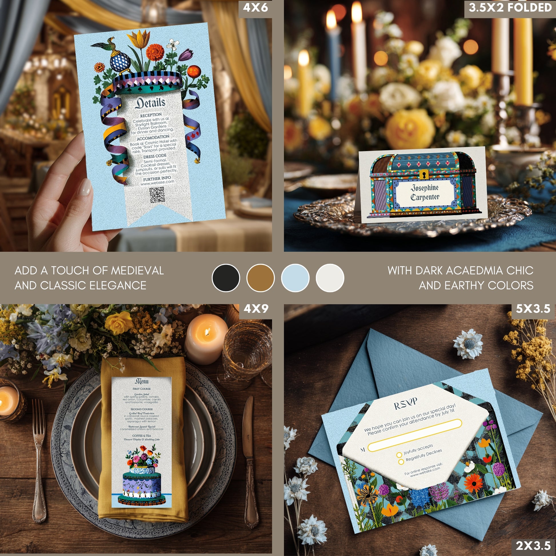 Step into your own fairytale with this enchanting 8-piece Medieval Wedding Invitation Set, designed to bring a whimsical and historical charm to your big day. Inspired by illuminated manuscripts and magical storybooks, this editable bundle includes everything you need to make your celebration unforgettable—from invitations to menus and thank you cards.