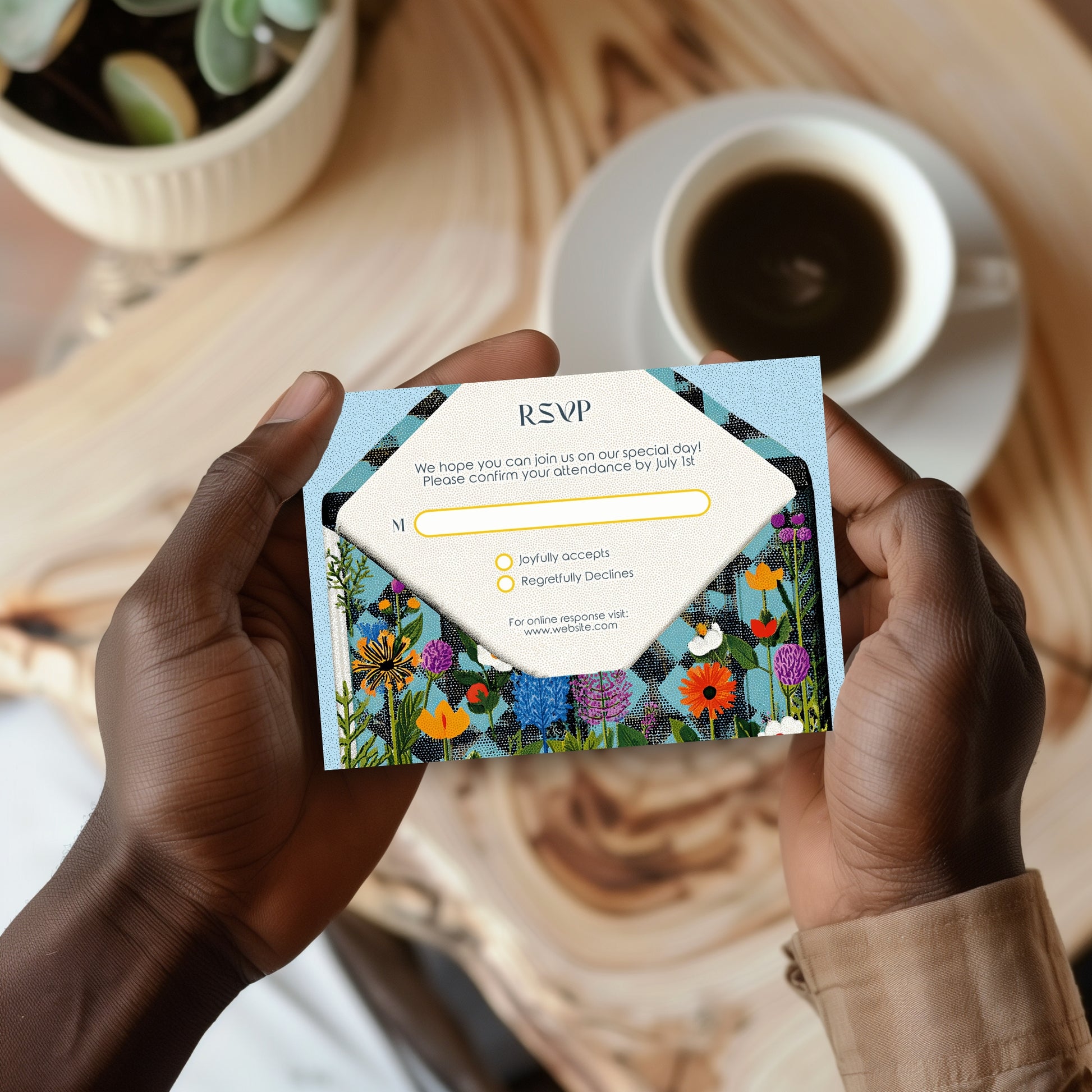 Size: 5x7 Invitation, 5x3.5 RSVP, 4x6 Details, 4x9 Menu, 4x5 Table Sign, 5x3.5 Thank You, 3x2.5 Name, and 2.5x3 Gift Tag