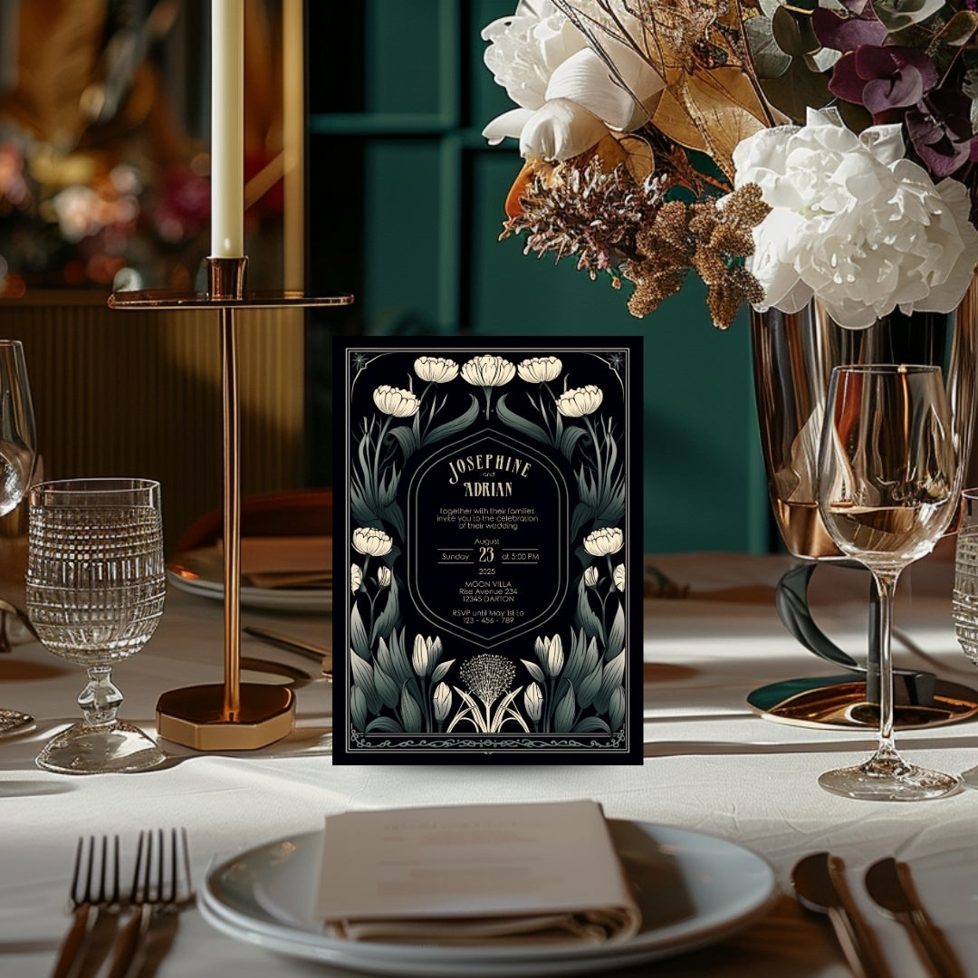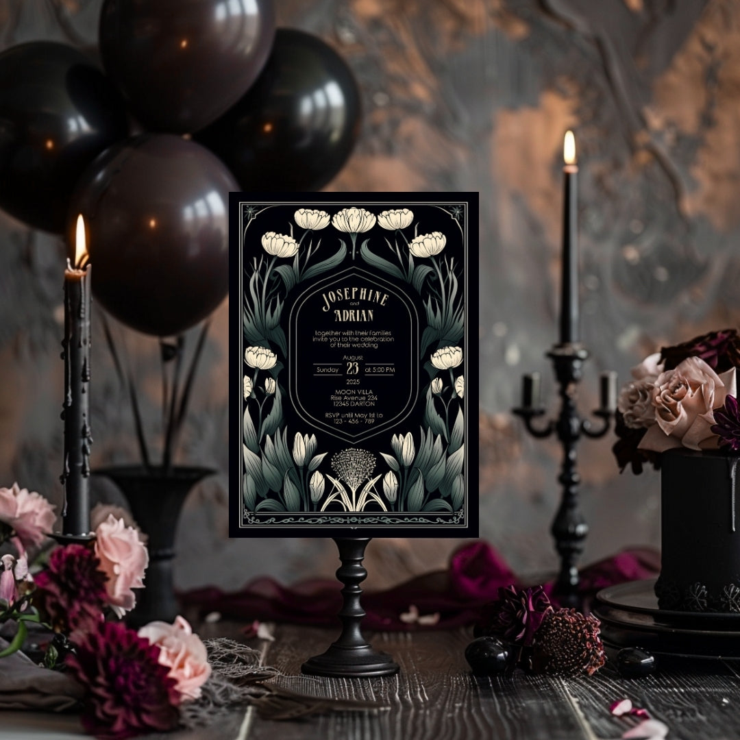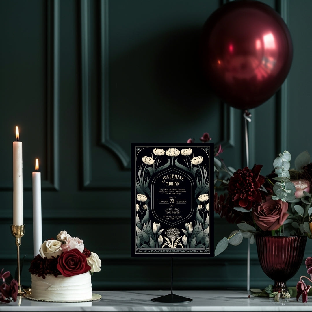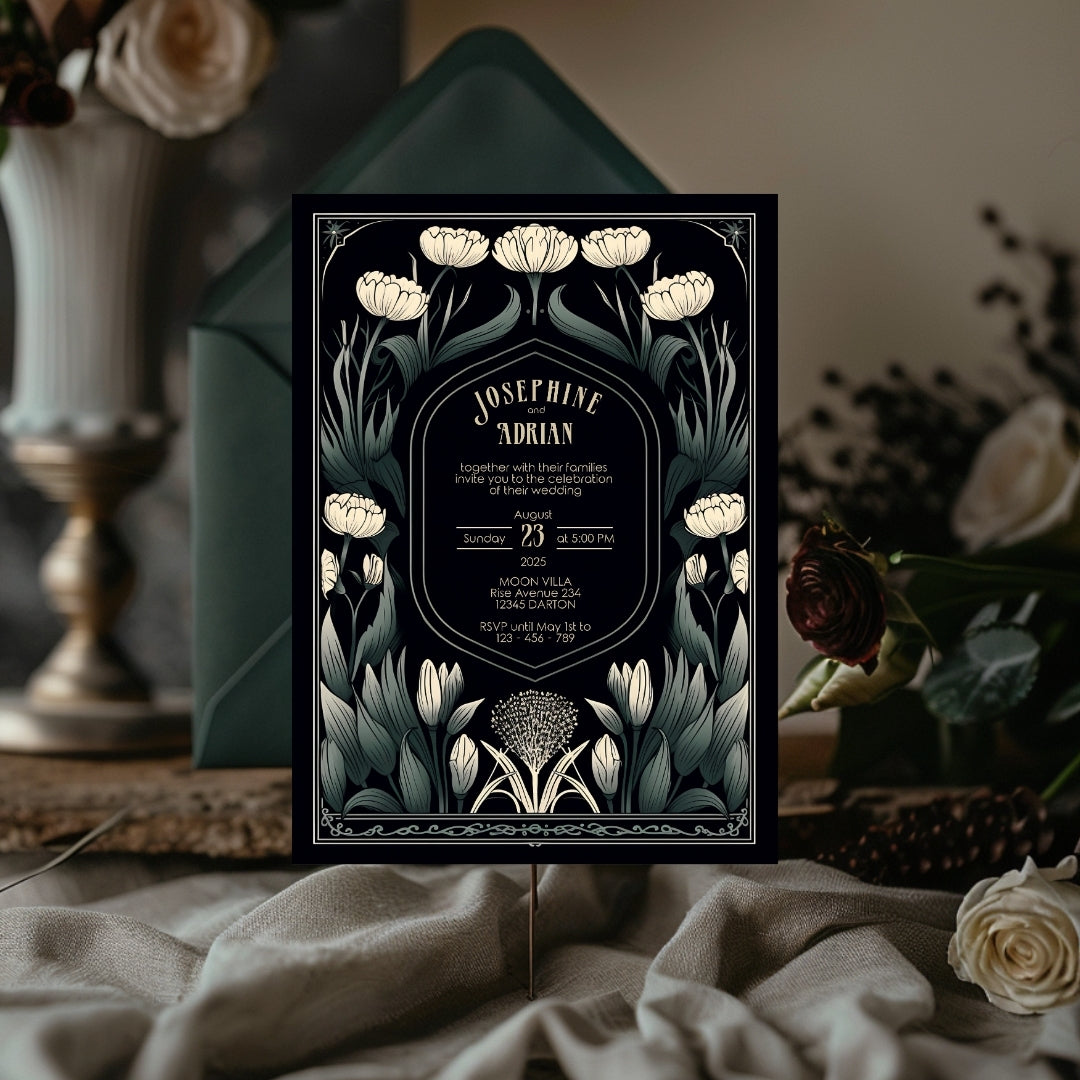 This Gothic Art Deco floral wedding invitation combines the elegance of the roaring twenties with the intricate designs of a botanical garden, creating a dark and moody vintage design. Its floral arches and botanical elements set against deep colors like black and green make it ideal for weddings, birthdays, anniversaries, or any special occasion that calls for an elegant touch. Fully customizable with Corjl, this digital template offers seamless editing for various events. Download, print at home or professionally, or share digitally, making it a versatile and elegant solution for your event planning needs.