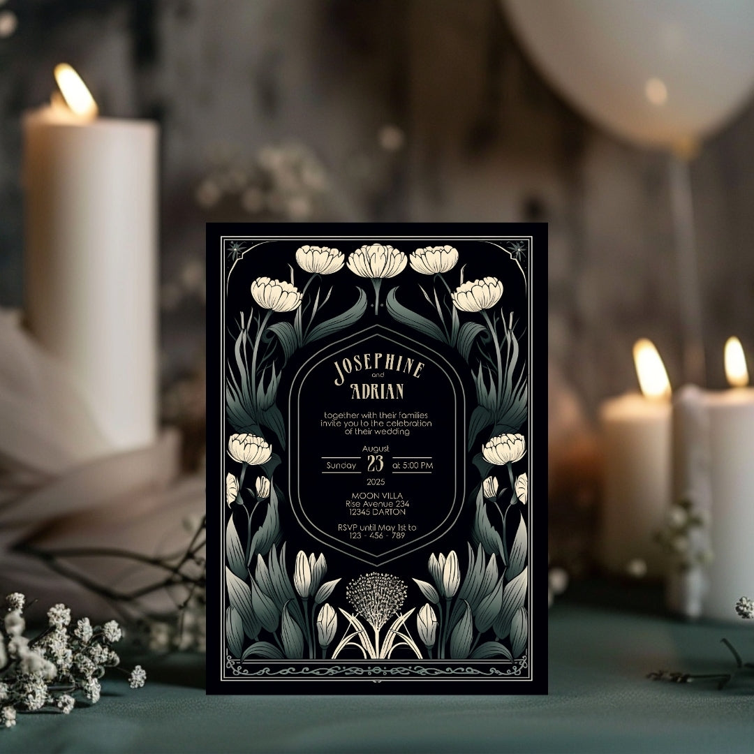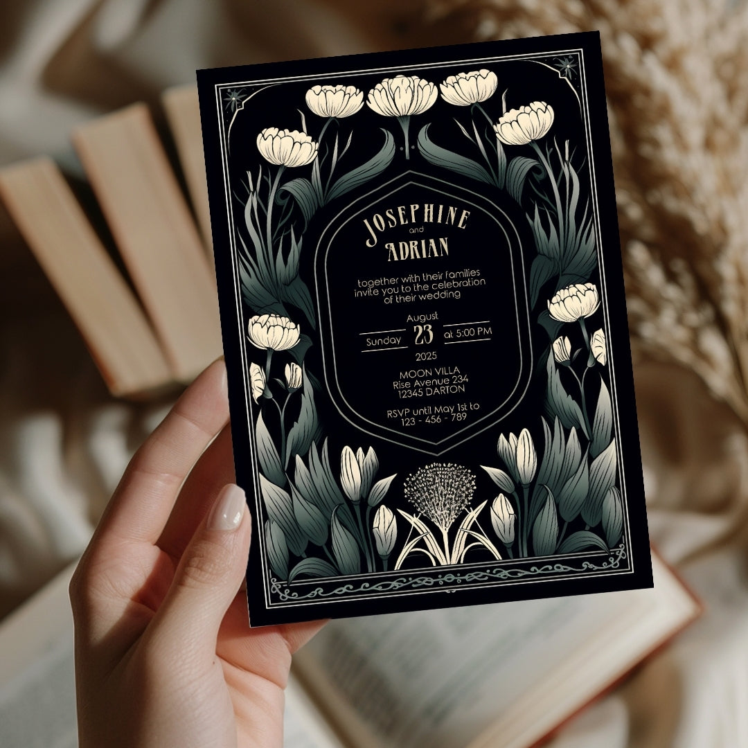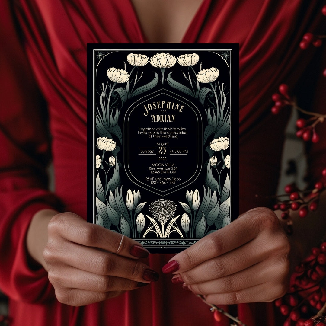 This Gothic Art Deco floral wedding invitation combines the elegance of the roaring twenties with the intricate designs of a botanical garden, creating a dark and moody vintage design. Its floral arches and botanical elements set against deep colors like black and green make it ideal for weddings, birthdays, anniversaries, or any special occasion that calls for an elegant touch. Fully customizable with Corjl, this digital template offers seamless editing for various events. Download, print at home or professionally, or share digitally, making it a versatile and elegant solution for your event planning needs.