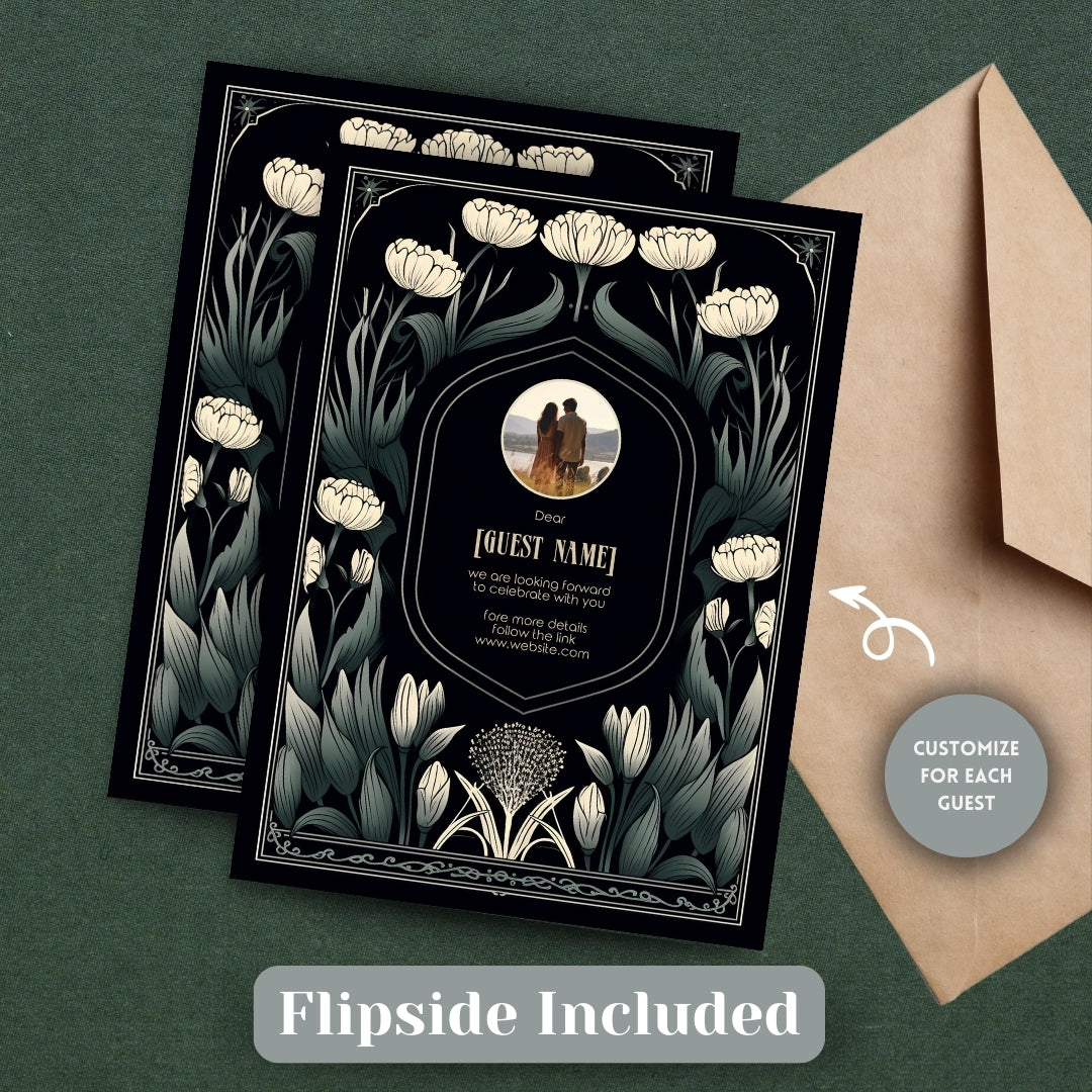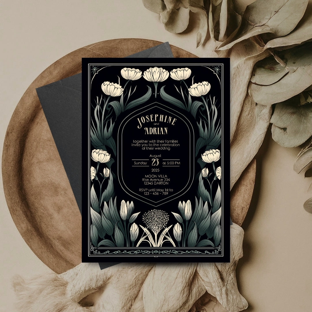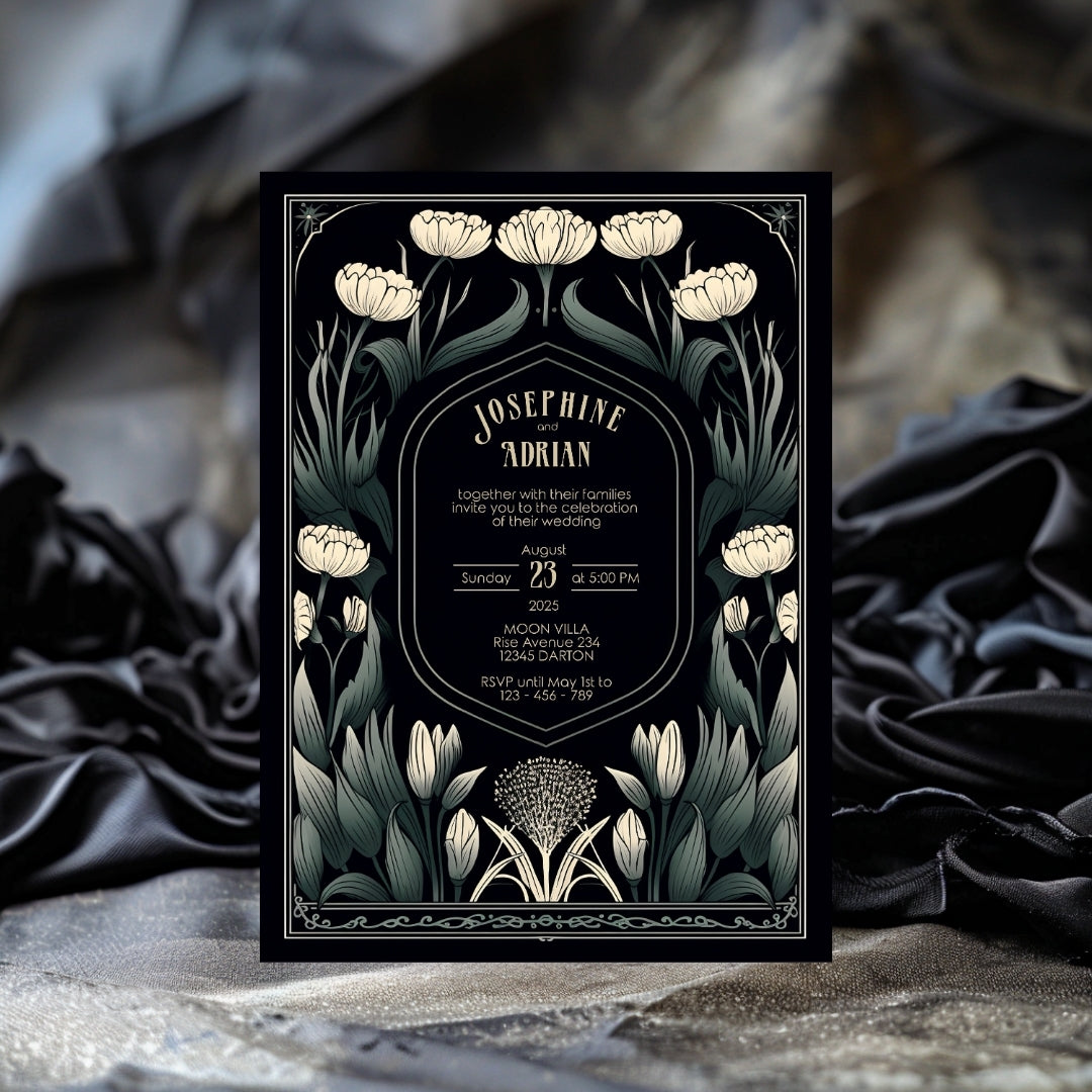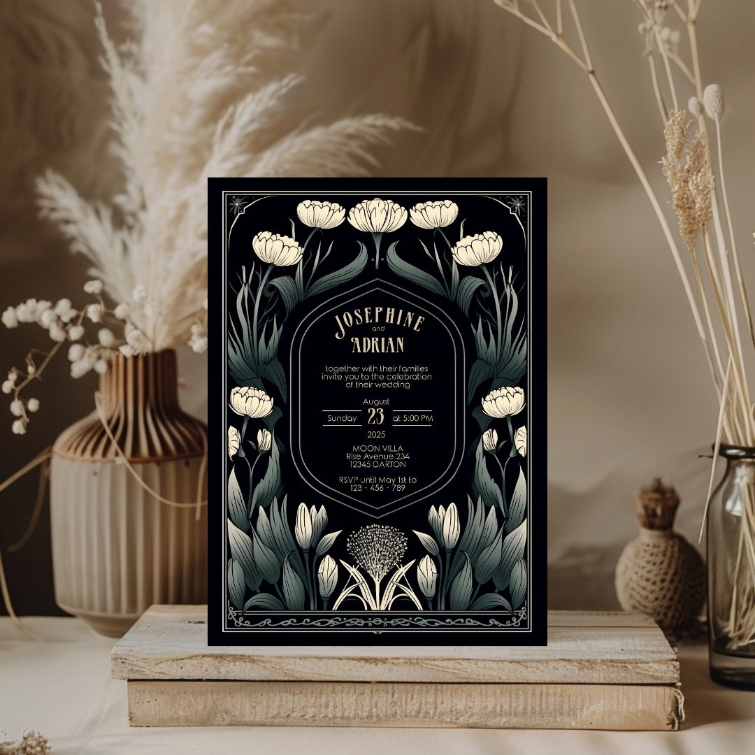 This Gothic Art Deco floral wedding invitation combines the elegance of the roaring twenties with the intricate designs of a botanical garden, creating a dark and moody vintage design. Its floral arches and botanical elements set against deep colors like black and green make it ideal for weddings, birthdays, anniversaries, or any special occasion that calls for an elegant touch. Fully customizable with Corjl, this digital template offers seamless editing for various events. Download, print at home or professionally, or share digitally, making it a versatile and elegant solution for your event planning needs.