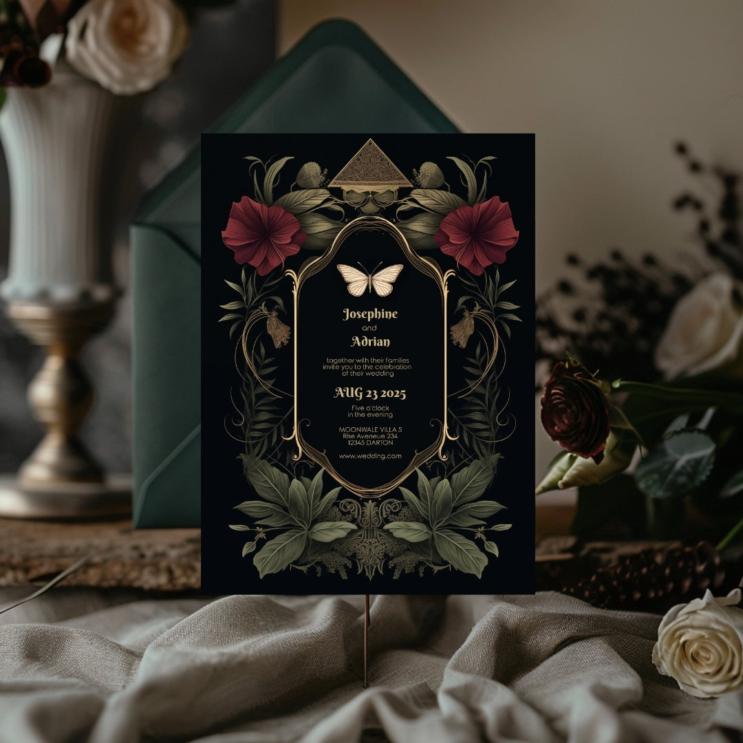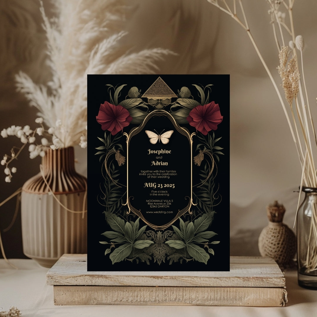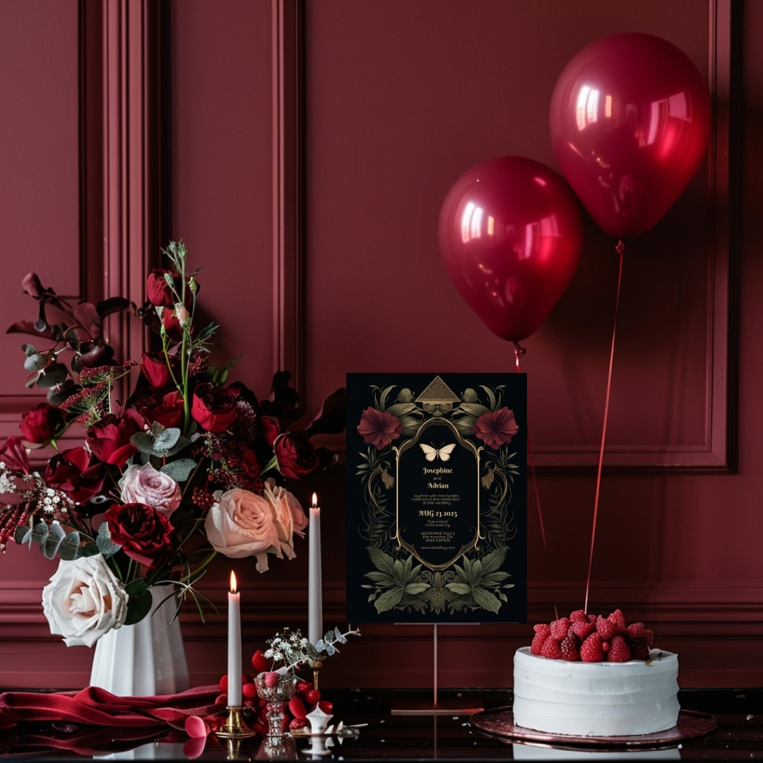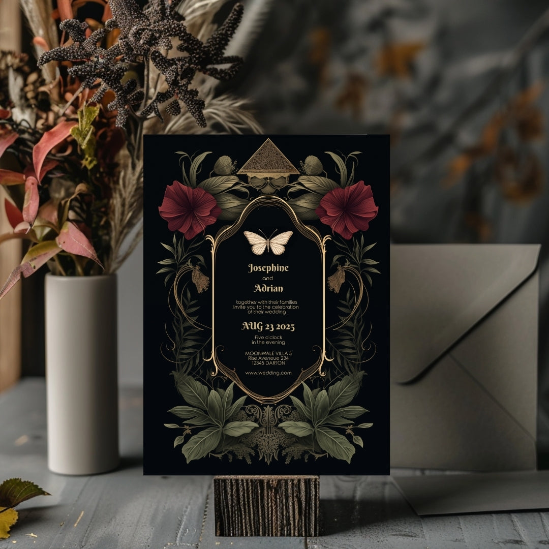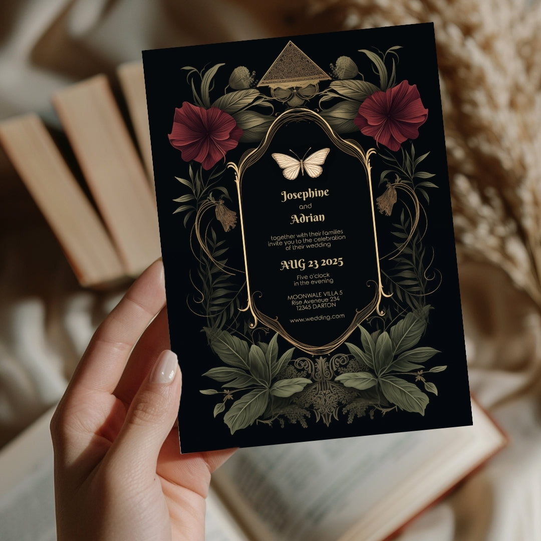 Step into a magical nuptial narrative with our Enchanted Botanical & Butterfly Invitation. Crafted with a love for the mystical, this custom digital template features golden butterflies and botanical illustrations, all framed within an ornate golden pyramid emblem that symbolizes transformation and love for nature. The deep, noir backdrop accentuates the golden and crimson flora, inviting your guests to your wedding ceremony, engagement party, birthday, bridal shower or magical party that promises to be as enchanting as a moonlit secret garden.