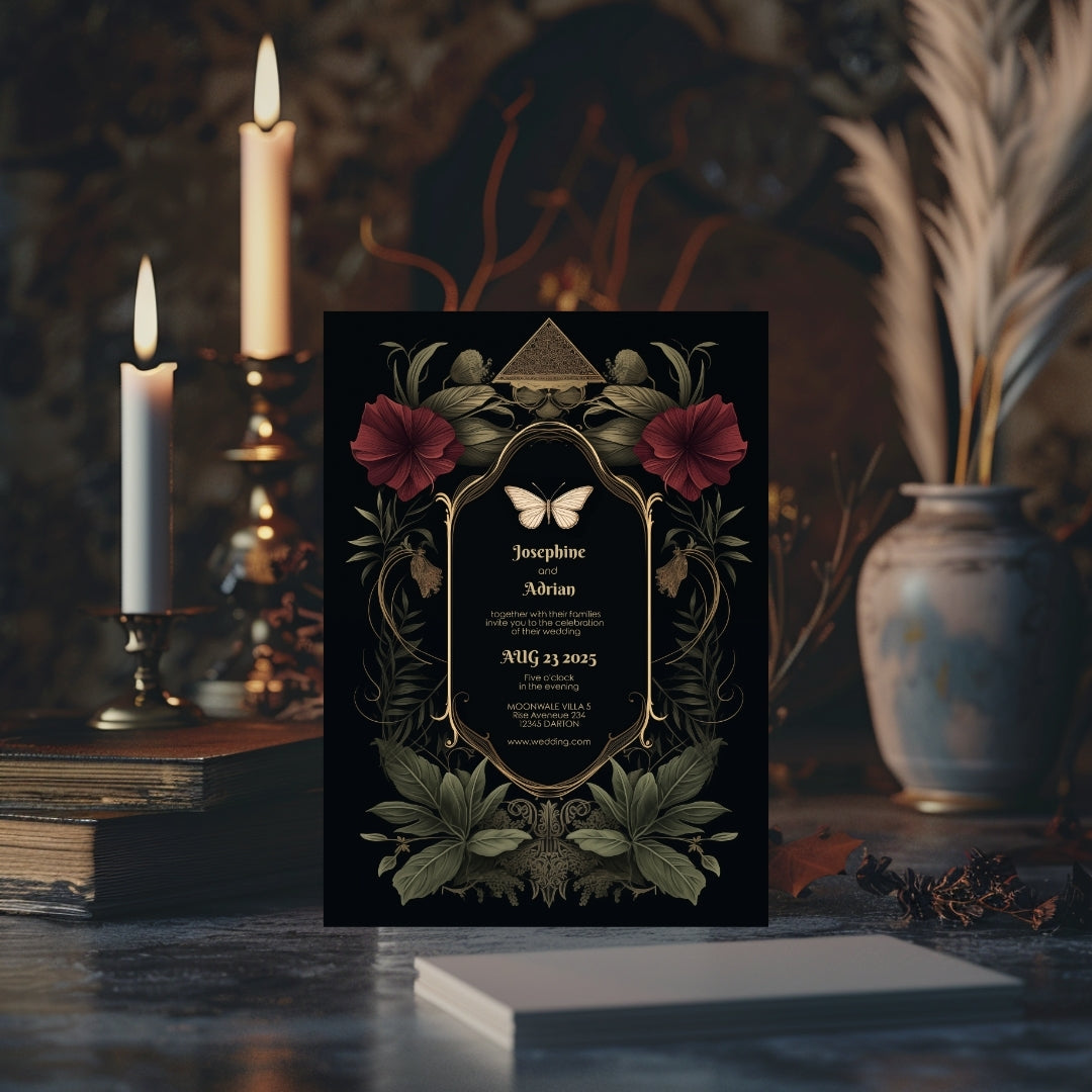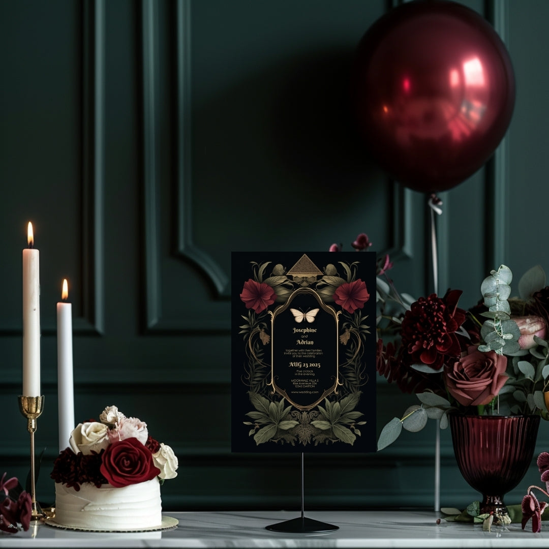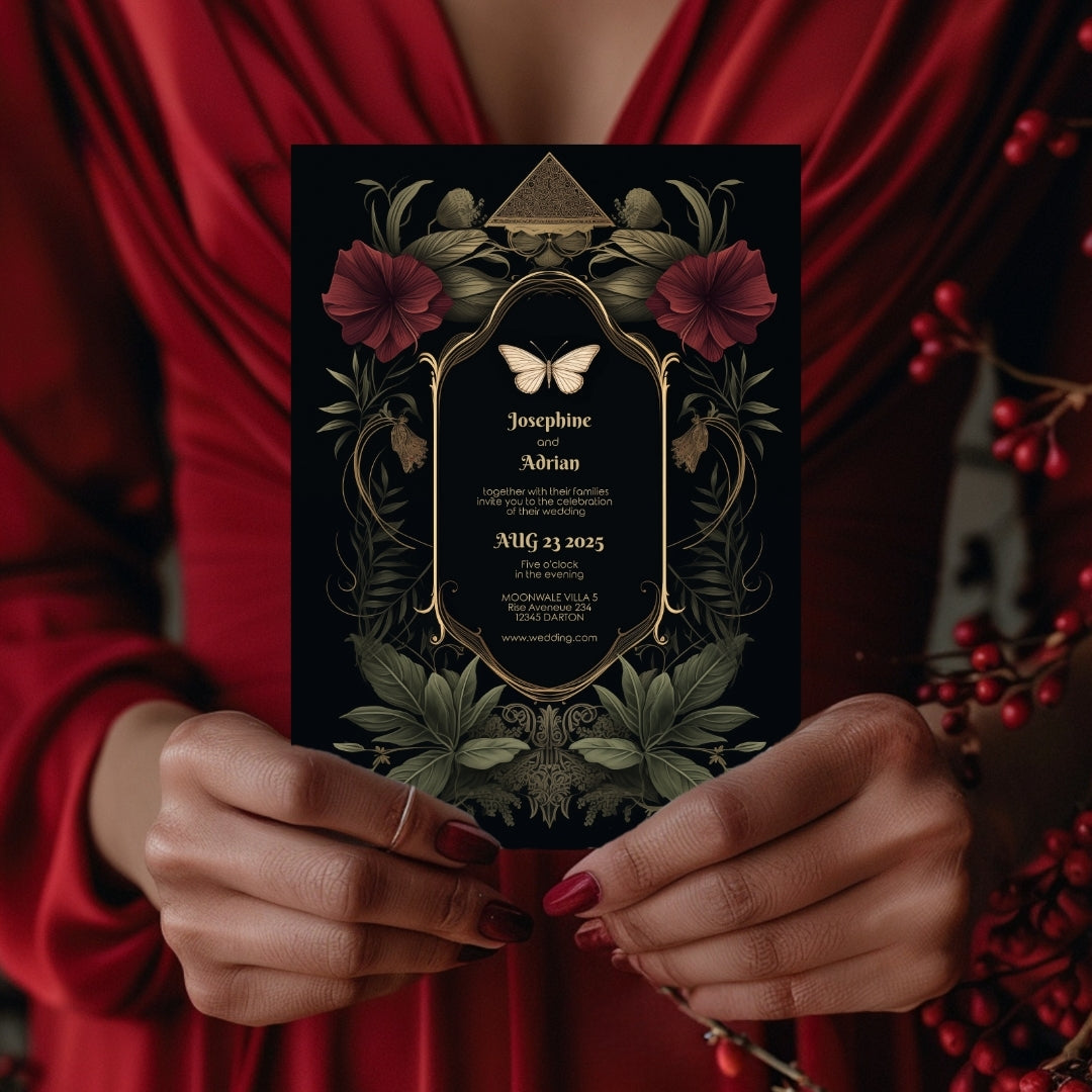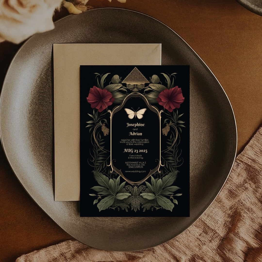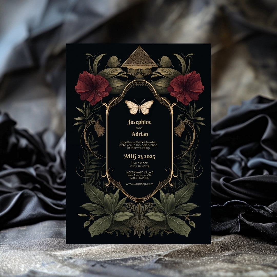 Step into a magical nuptial narrative with our Enchanted Botanical & Butterfly Invitation. Crafted with a love for the mystical, this custom digital template features golden butterflies and botanical illustrations, all framed within an ornate golden pyramid emblem that symbolizes transformation and love for nature. The deep, noir backdrop accentuates the golden and crimson flora, inviting your guests to your wedding ceremony, engagement party, birthday, bridal shower or magical party that promises to be as enchanting as a moonlit secret garden.