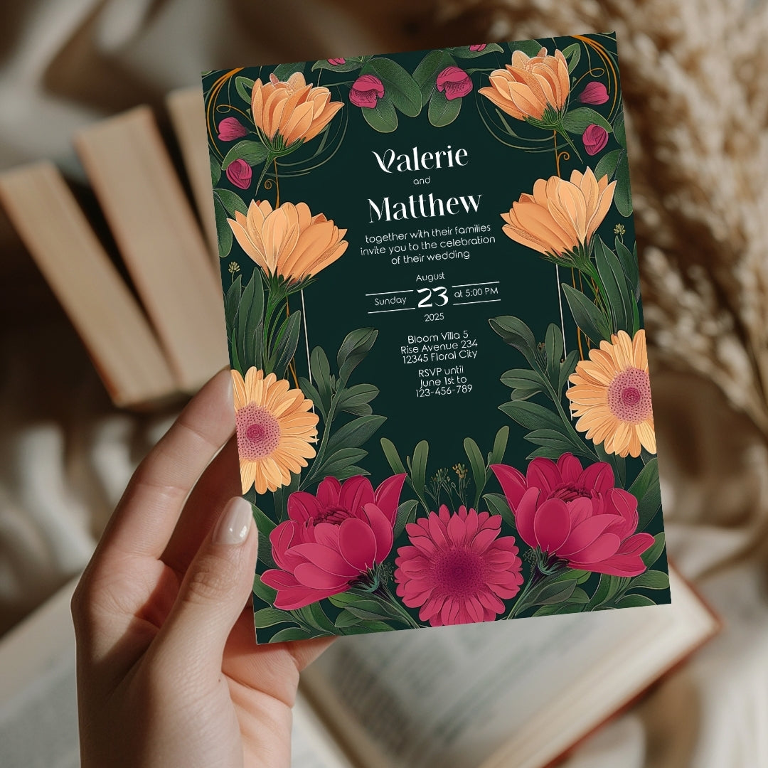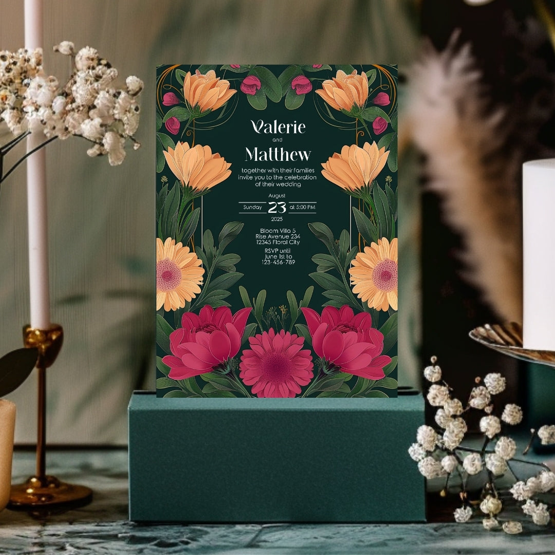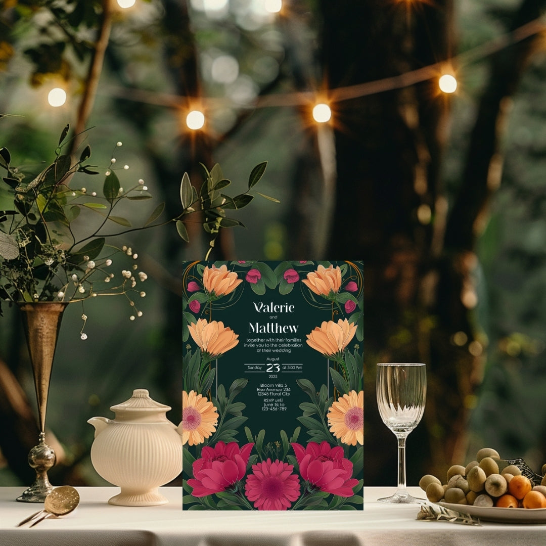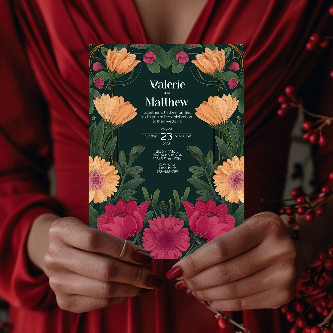 Illuminate your special day with the bold and bright allure of our Floral Fiesta Wedding Invitation. This digital invitation bursts with the vibrant beauty of nature, featuring a radiant array of flowers set against a rich, verdant background. The vivid pinks and cheerful yellows of the blooms create a stunning contrast, inviting your guests to a wedding celebration that promises as much joy and color as the invitation itself. This template is perfect not just for weddings, but also for jubilant birthday parties, anniversaries, and any event where happiness is in full bloom. Customization is a breeze with Corjl, allowing you to make every detail of your invitation as personal and unique as your celebration. Opt to share this festive announcement with your guests through traditional print or with the convenience of a digital format. Let your invitation be a reflection of the vibrant memories you will create on your special day.