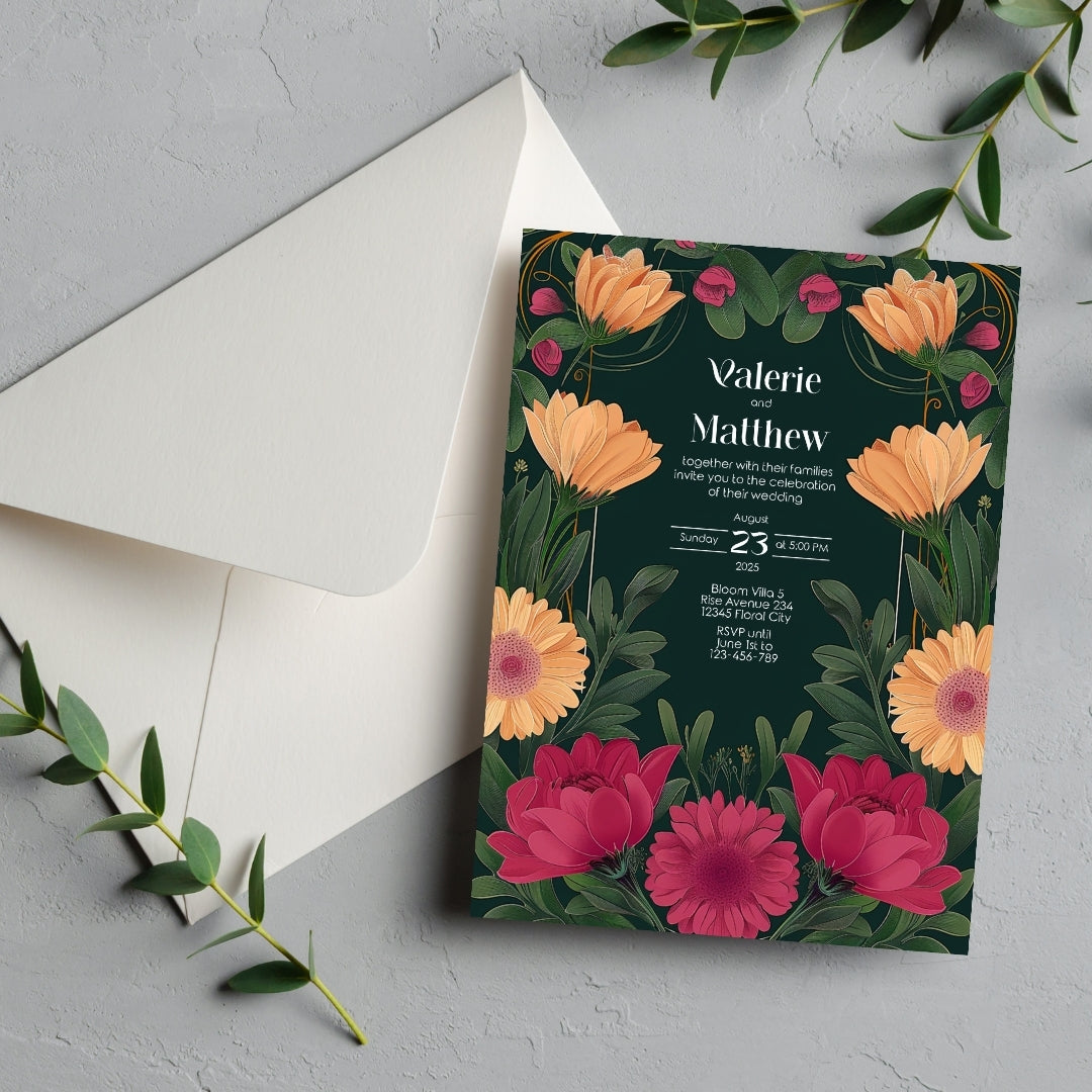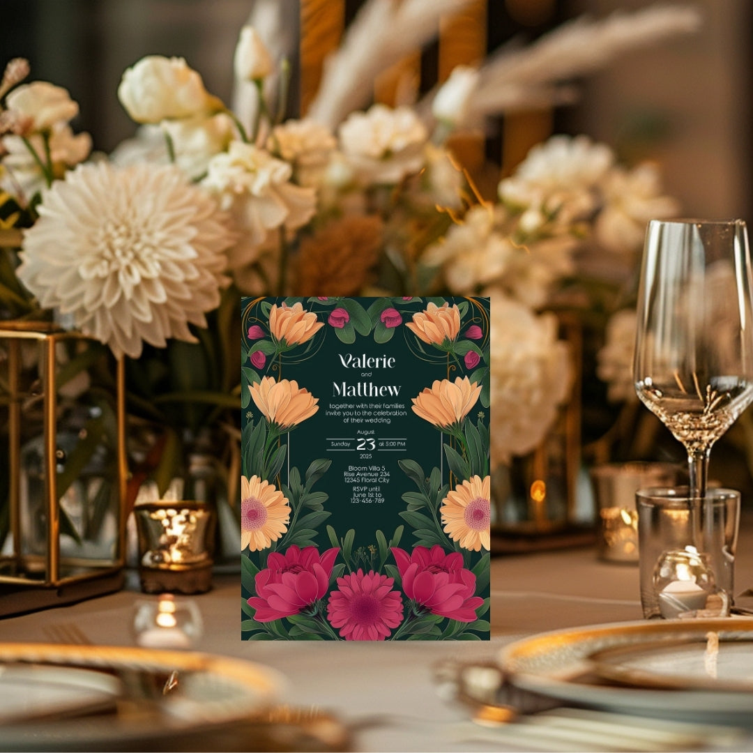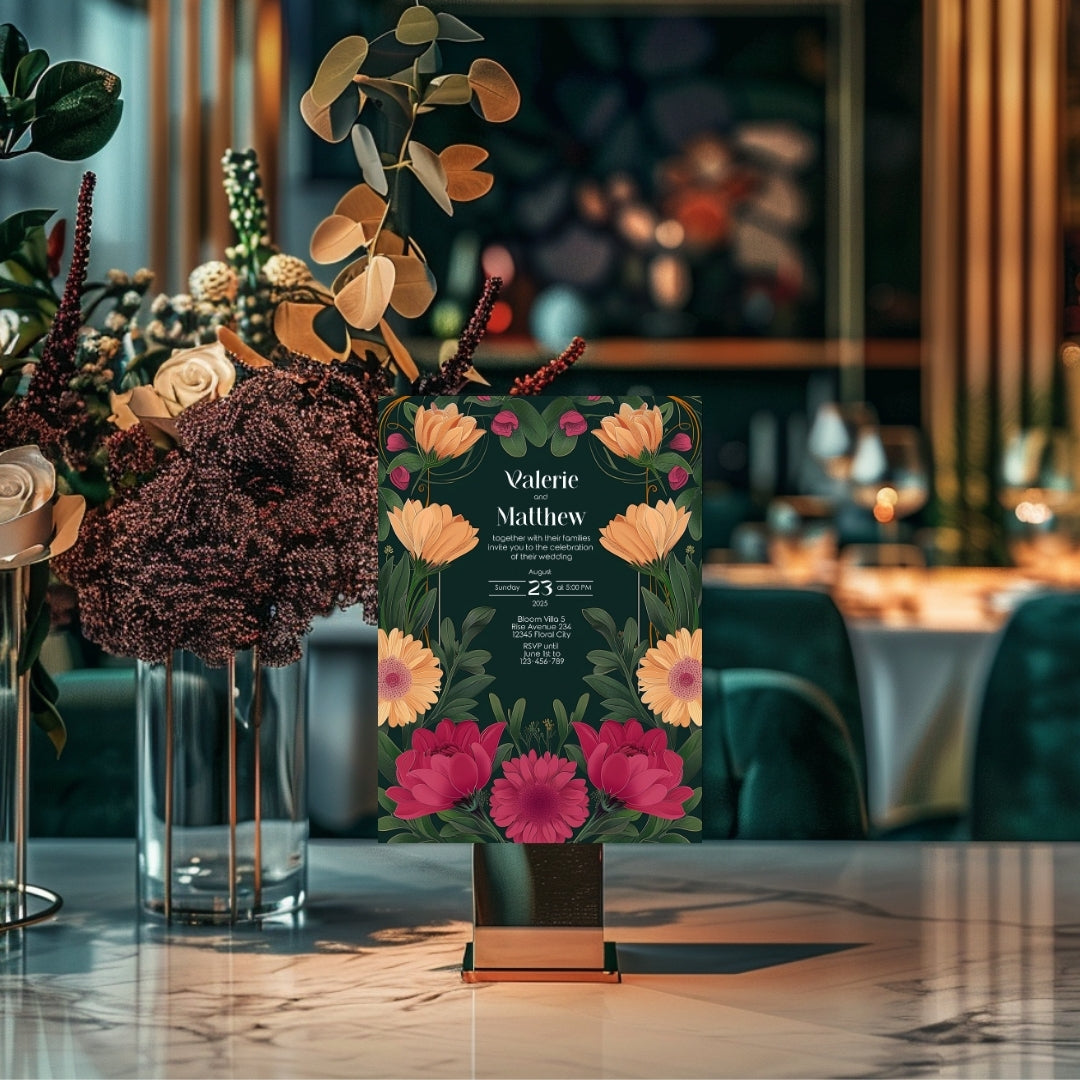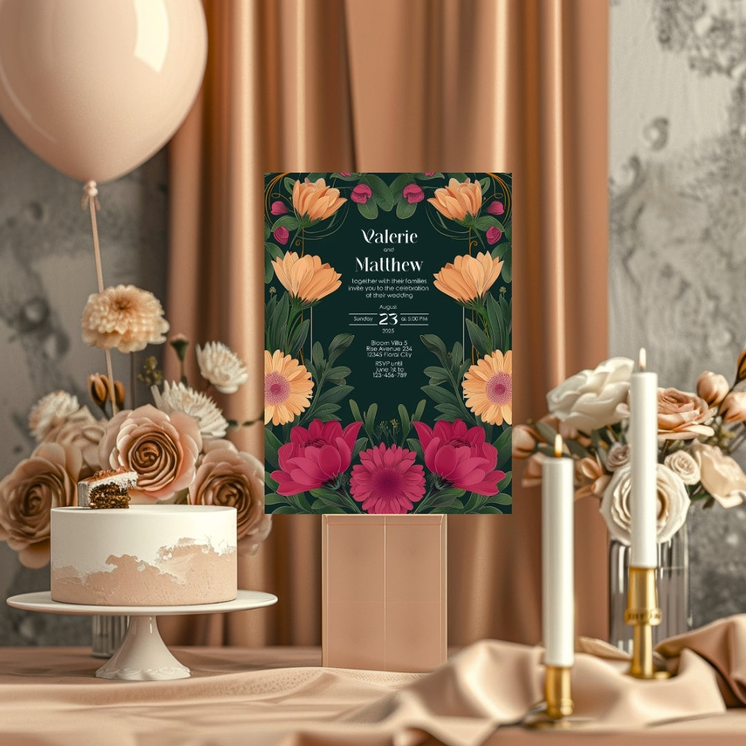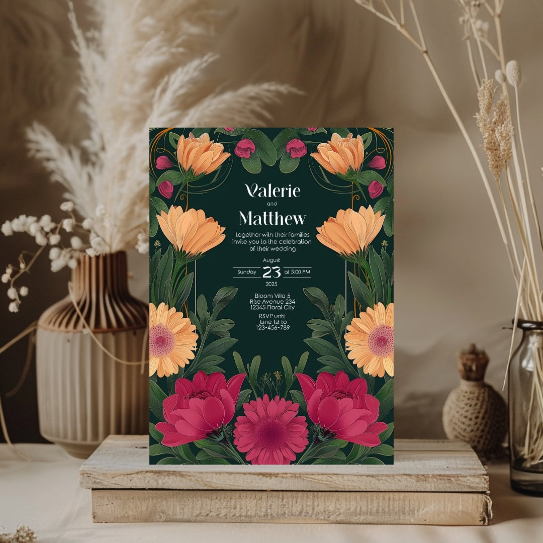 Illuminate your special day with the bold and bright allure of our Floral Fiesta Wedding Invitation. This digital invitation bursts with the vibrant beauty of nature, featuring a radiant array of flowers set against a rich, verdant background. The vivid pinks and cheerful yellows of the blooms create a stunning contrast, inviting your guests to a wedding celebration that promises as much joy and color as the invitation itself. This template is perfect not just for weddings, but also for jubilant birthday parties, anniversaries, and any event where happiness is in full bloom. Customization is a breeze with Corjl, allowing you to make every detail of your invitation as personal and unique as your celebration. Opt to share this festive announcement with your guests through traditional print or with the convenience of a digital format. Let your invitation be a reflection of the vibrant memories you will create on your special day.