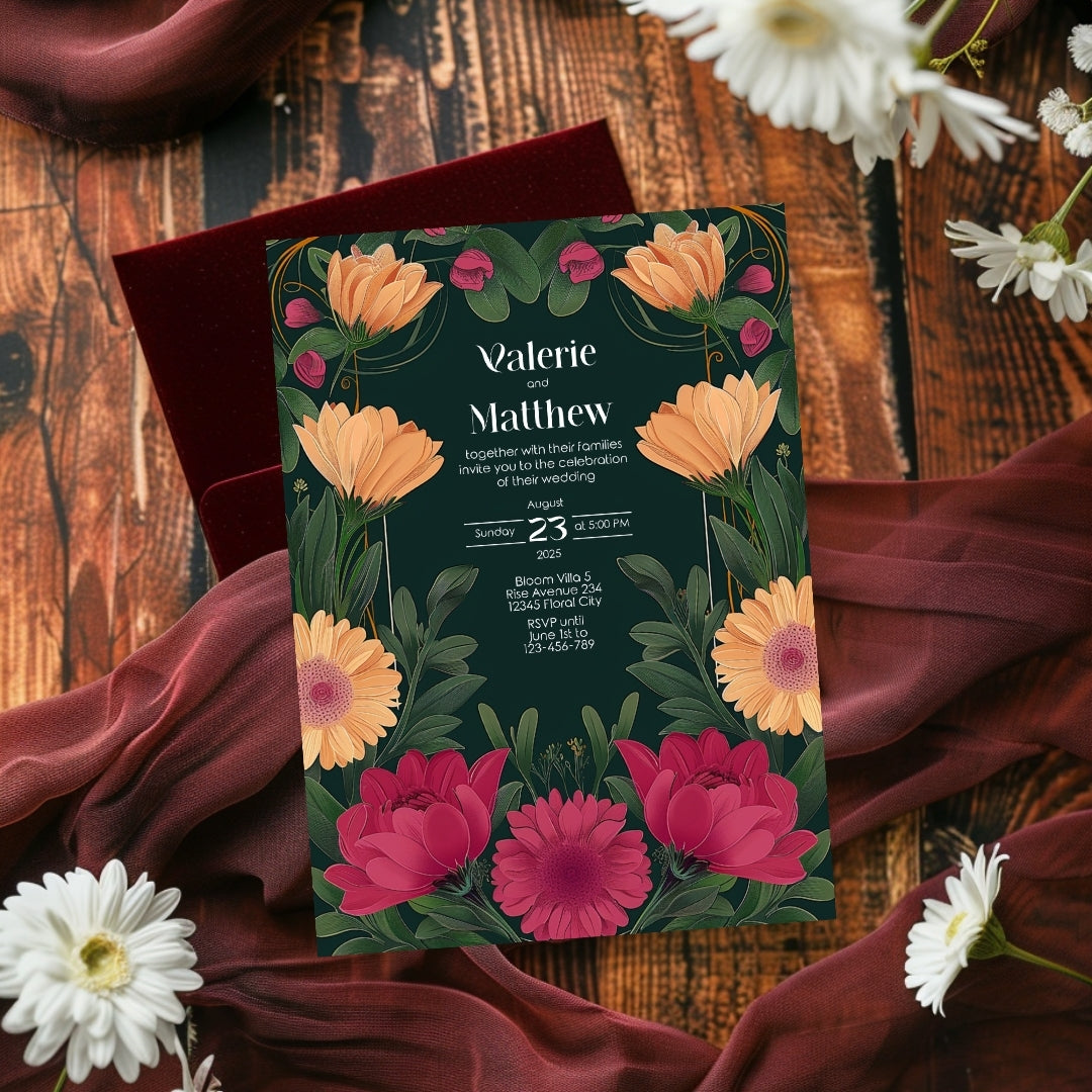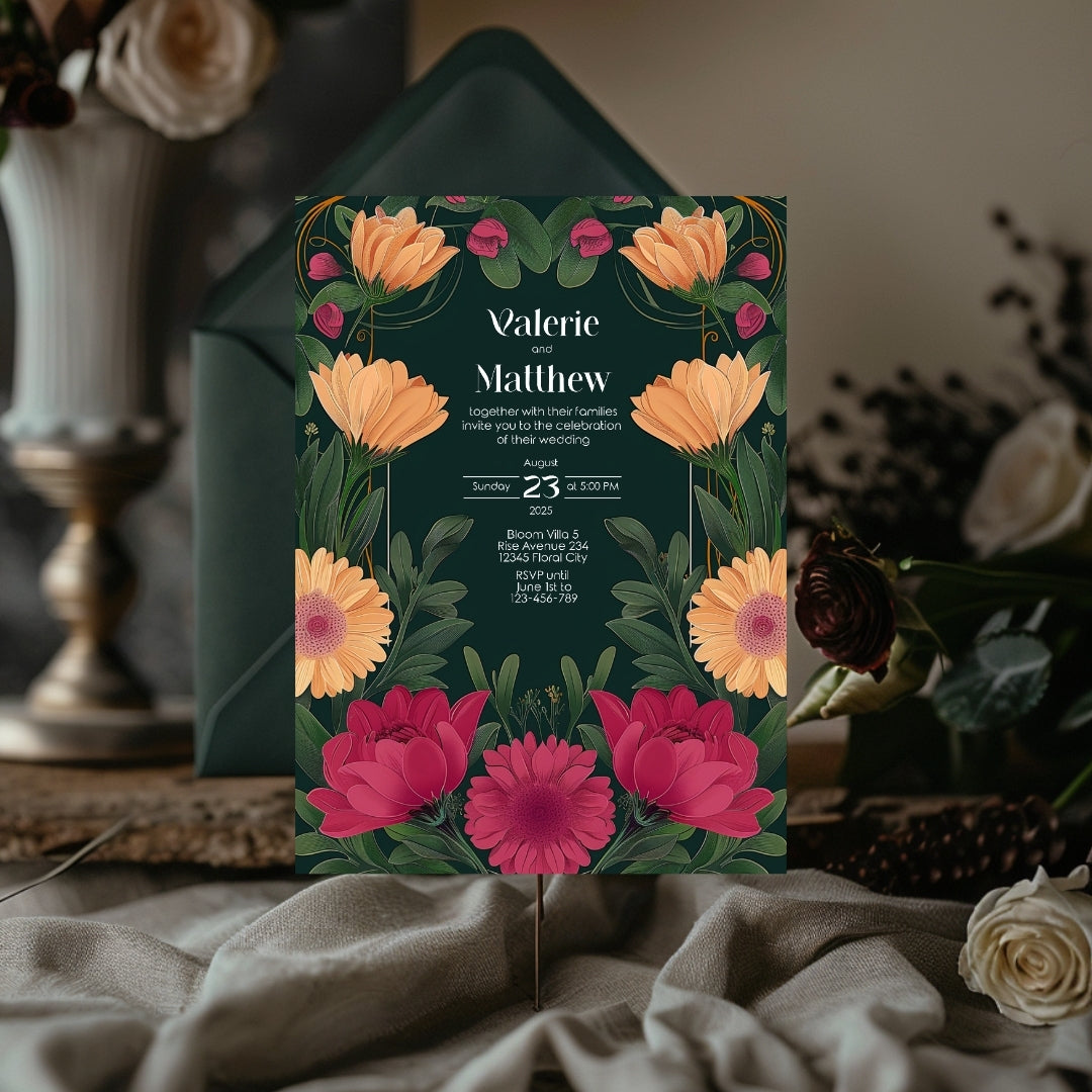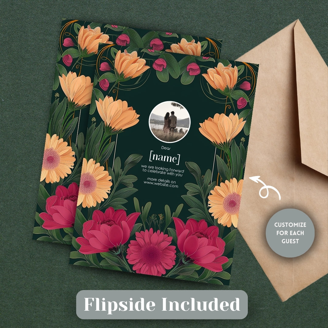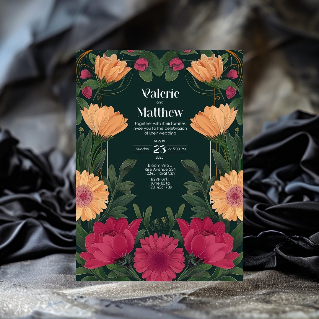 Illuminate your special day with the bold and bright allure of our Floral Fiesta Wedding Invitation. This digital invitation bursts with the vibrant beauty of nature, featuring a radiant array of flowers set against a rich, verdant background. The vivid pinks and cheerful yellows of the blooms create a stunning contrast, inviting your guests to a wedding celebration that promises as much joy and color as the invitation itself. This template is perfect not just for weddings, but also for jubilant birthday parties, anniversaries, and any event where happiness is in full bloom. Customization is a breeze with Corjl, allowing you to make every detail of your invitation as personal and unique as your celebration. Opt to share this festive announcement with your guests through traditional print or with the convenience of a digital format. Let your invitation be a reflection of the vibrant memories you will create on your special day.
