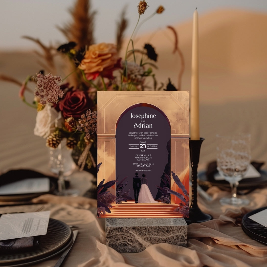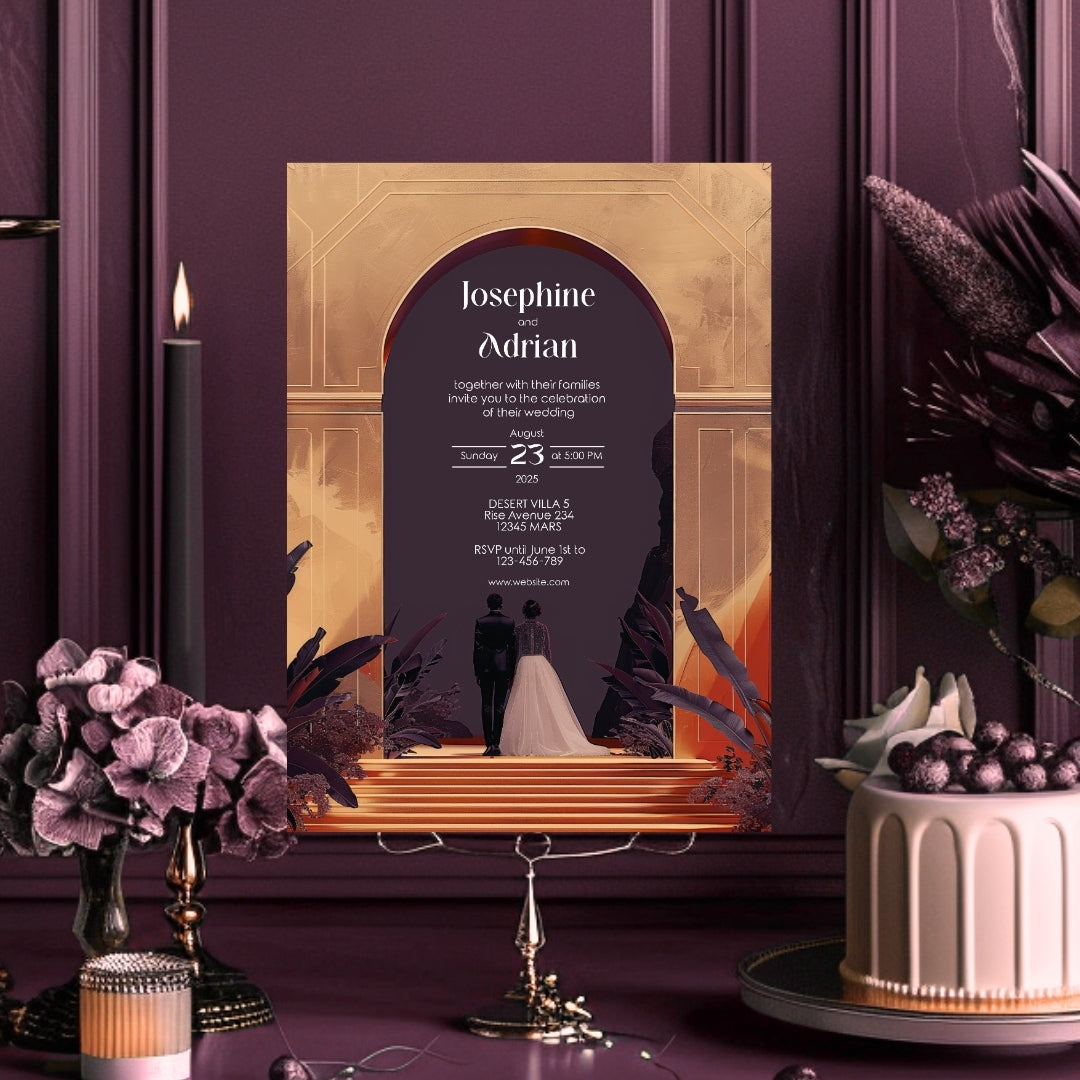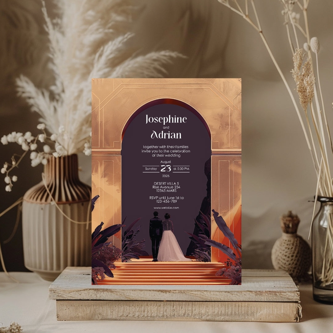 Invoke the mystique of a desert twilight with our Desert Elegance Wedding Invitation. This design captures the intimate moment before dusk, with a golden arch framing the romantic silhouettes of a couple against a deep midnight backdrop. It's an ideal proclamation for your wedding, offering a glimpse of the day when two souls unite under the vast, starlit sky. The palette of dusky orange and gold reflects the last rays of the sun caressing the sand, perfect for an evening ceremony or a luxurious desert-themed event. Personalize this enchanting scene on Corjl for an effortlessly elegant invitation, available to share with your esteemed guests in print or digitally