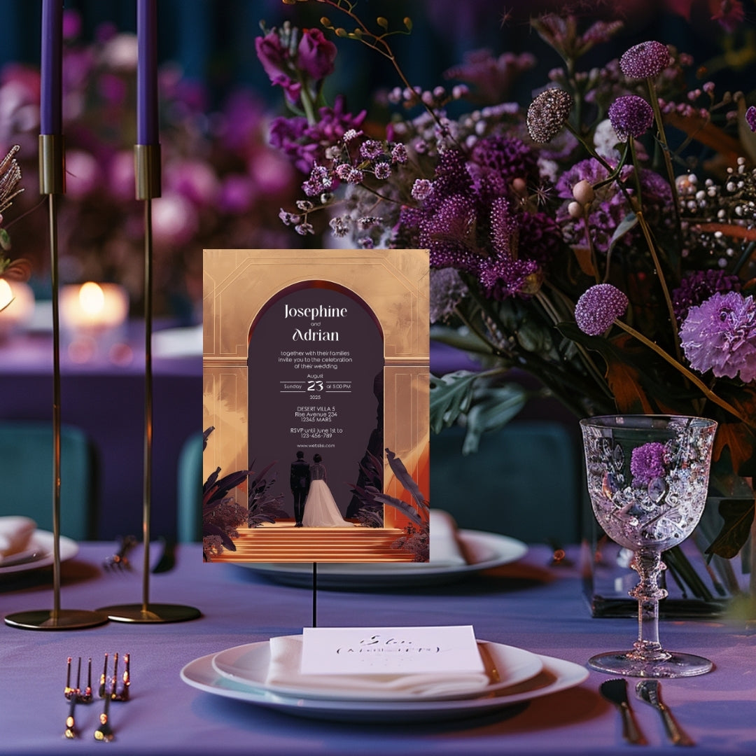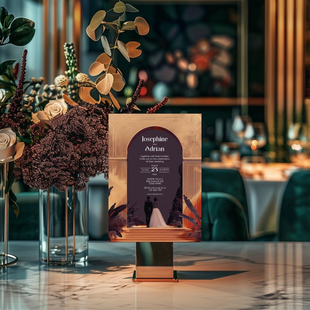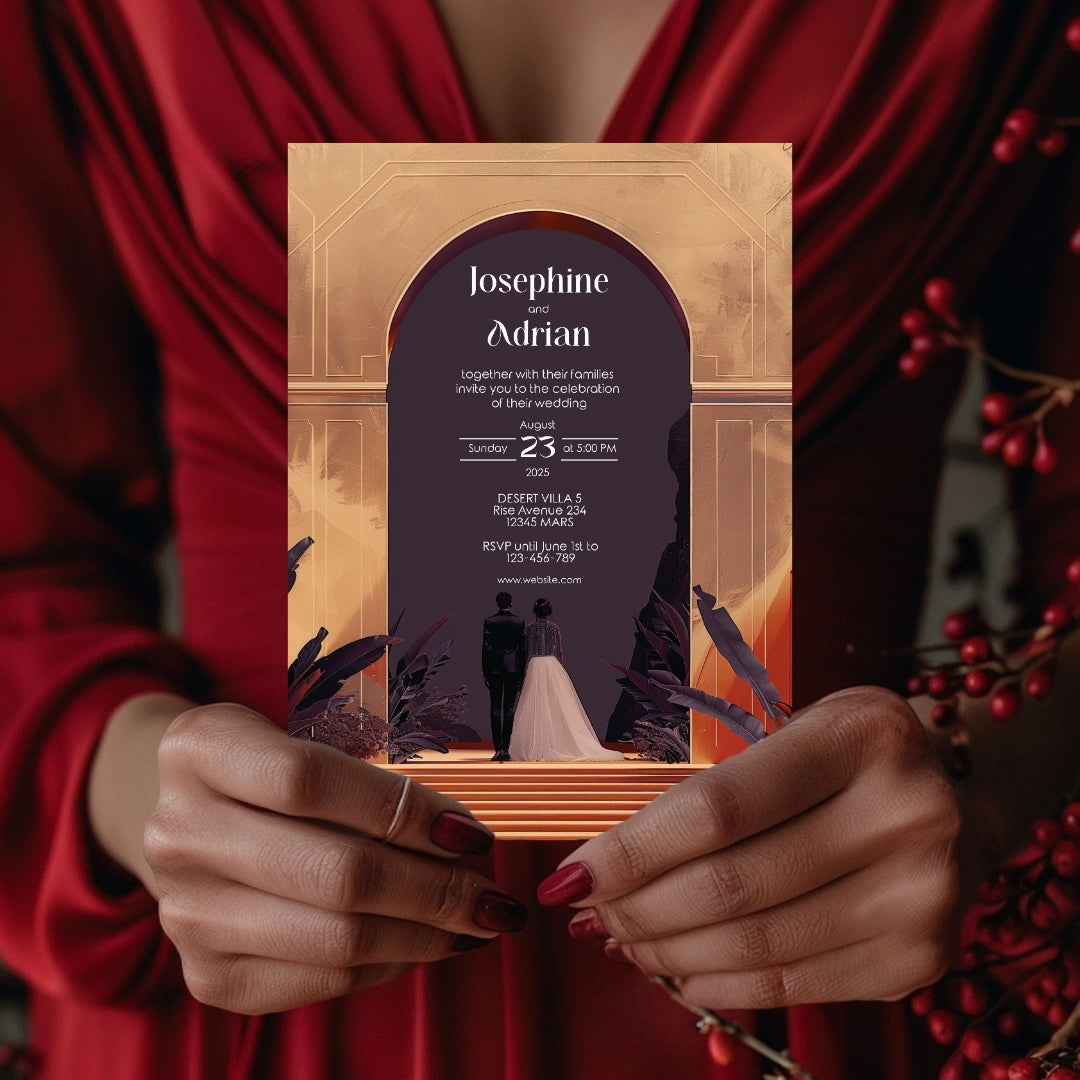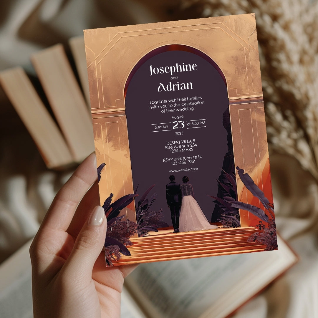 Invoke the mystique of a desert twilight with our Desert Elegance Wedding Invitation. This design captures the intimate moment before dusk, with a golden arch framing the romantic silhouettes of a couple against a deep midnight backdrop. It's an ideal proclamation for your wedding, offering a glimpse of the day when two souls unite under the vast, starlit sky. The palette of dusky orange and gold reflects the last rays of the sun caressing the sand, perfect for an evening ceremony or a luxurious desert-themed event. Personalize this enchanting scene on Corjl for an effortlessly elegant invitation, available to share with your esteemed guests in print or digitally