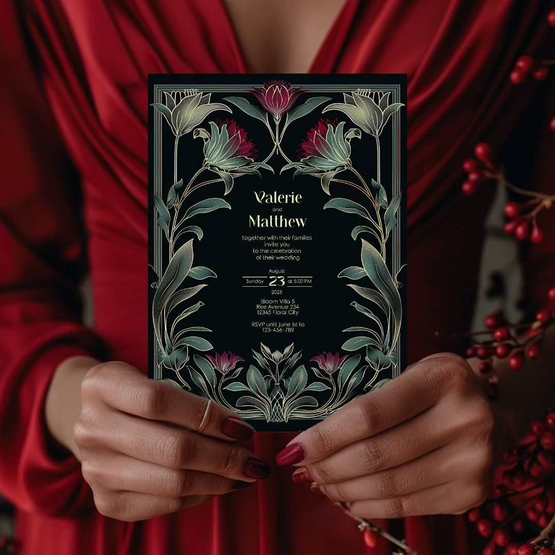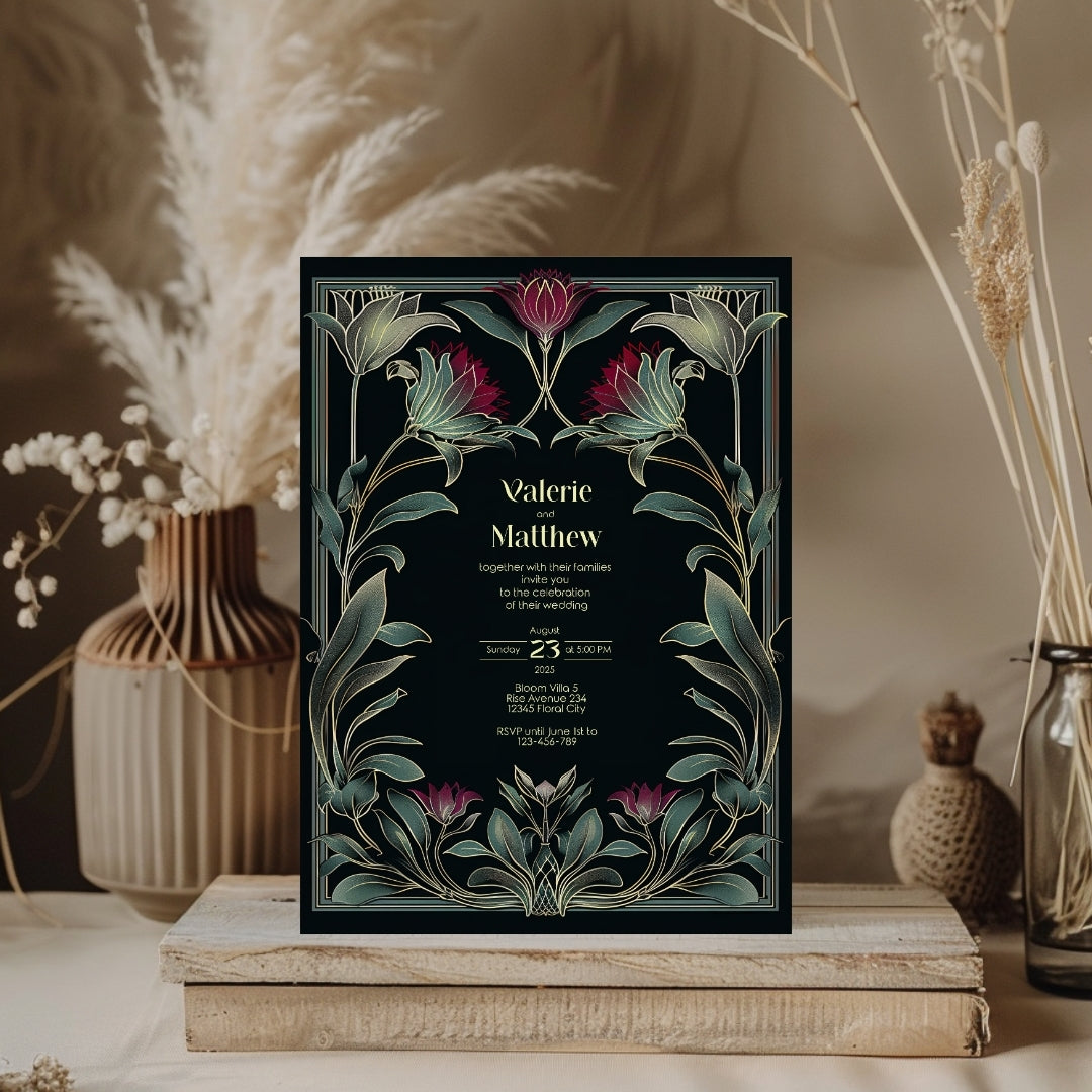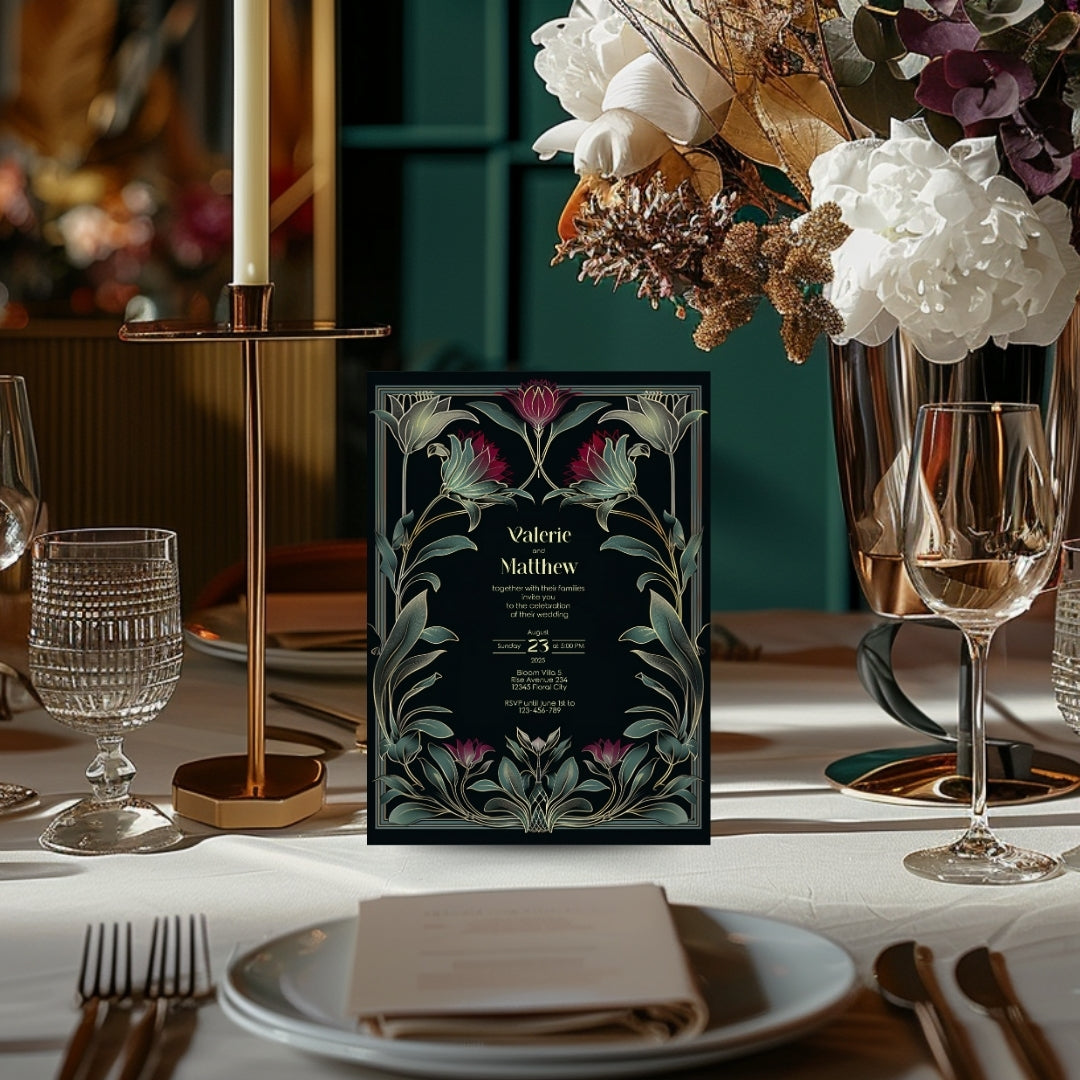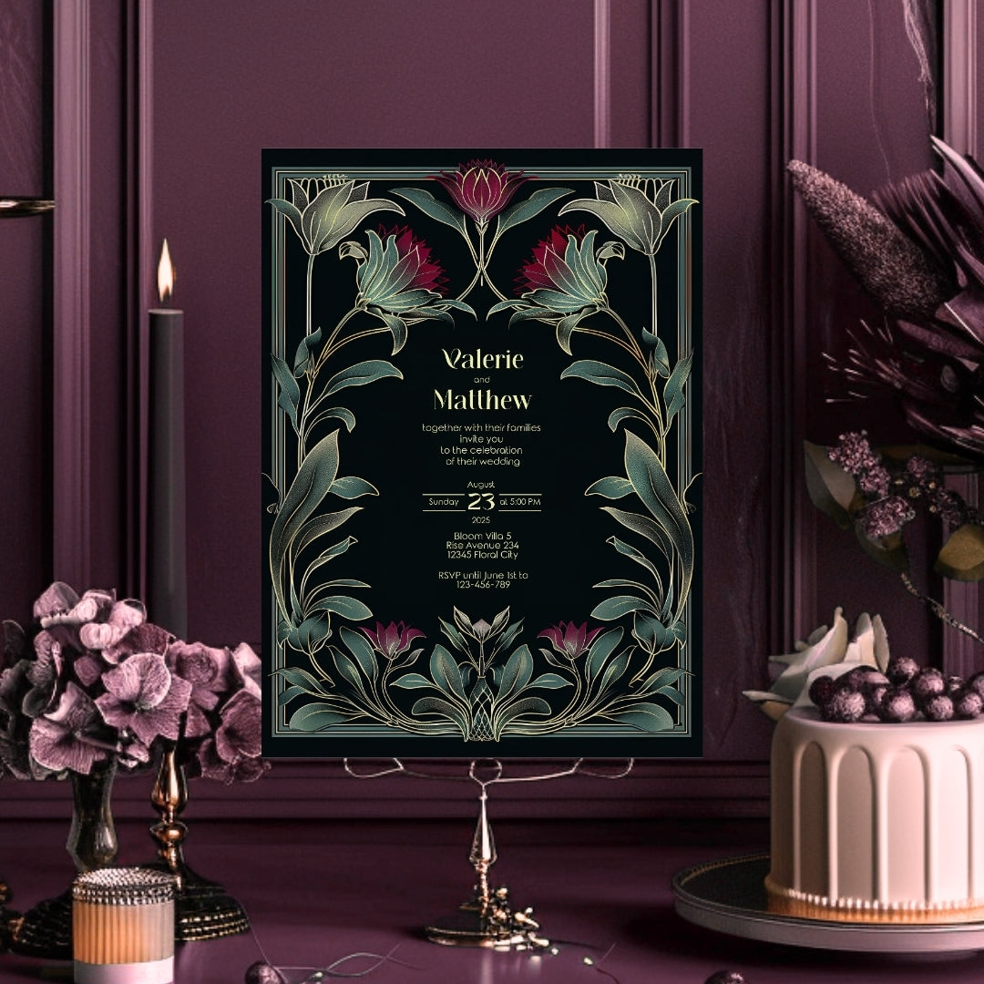 Revel in the romance and elegance of a bygone era with our Customizable Art Deco Wedding Invitation. Infused with the luxury of the 1920s, this exquisite digital template boasts an enthralling blend of geometric precision and floral sophistication, inviting your guests to a celebration of love and splendor. The sleek black backdrop accentuates the vibrant bursts of florals in hues of pink and gold, framing your event details in an aura of timeless charm. Perfect for those who adore the glamour of Art Deco and the delicate touch of nature, this invitation sets the tone for a wedding, anniversary, birthday, or any unforgettable celebration. Adaptable for both opulent and intimate gatherings, it offers you the freedom to customize every detail, from names to venue information, ensuring that your invitation is as unique as your event. With our editable template, available for instant download and editing via Corjl, you can create your masterpiece from the comfort of your home. Choose to print on luxe paper to elevate the tactile experience, or send it electronically to meld tradition with modern convenience. Make your special day's announcement a testament to style and grace. Embrace this invitation's invitation to weave the narrative of your love story into every element of your celebration.