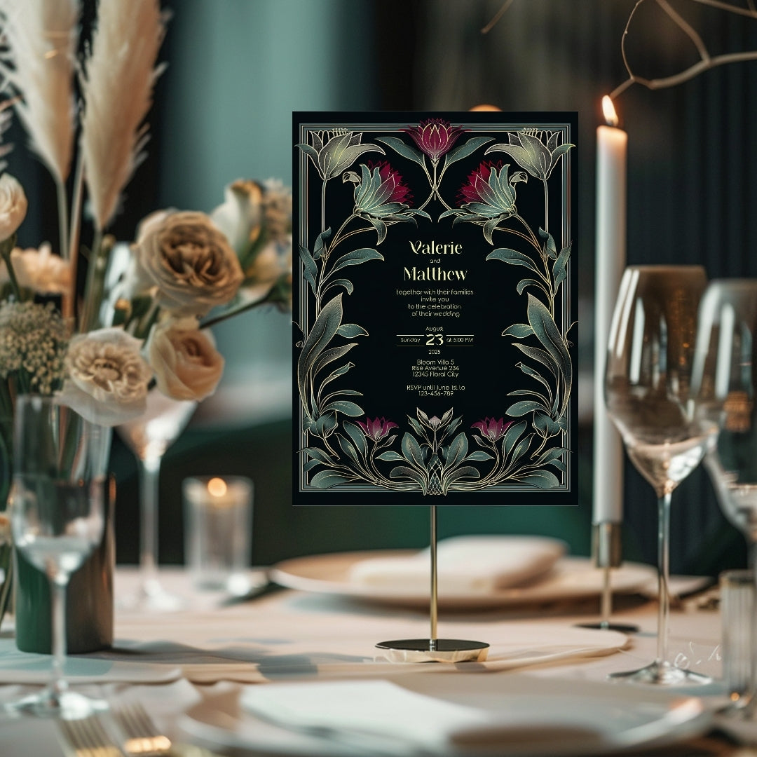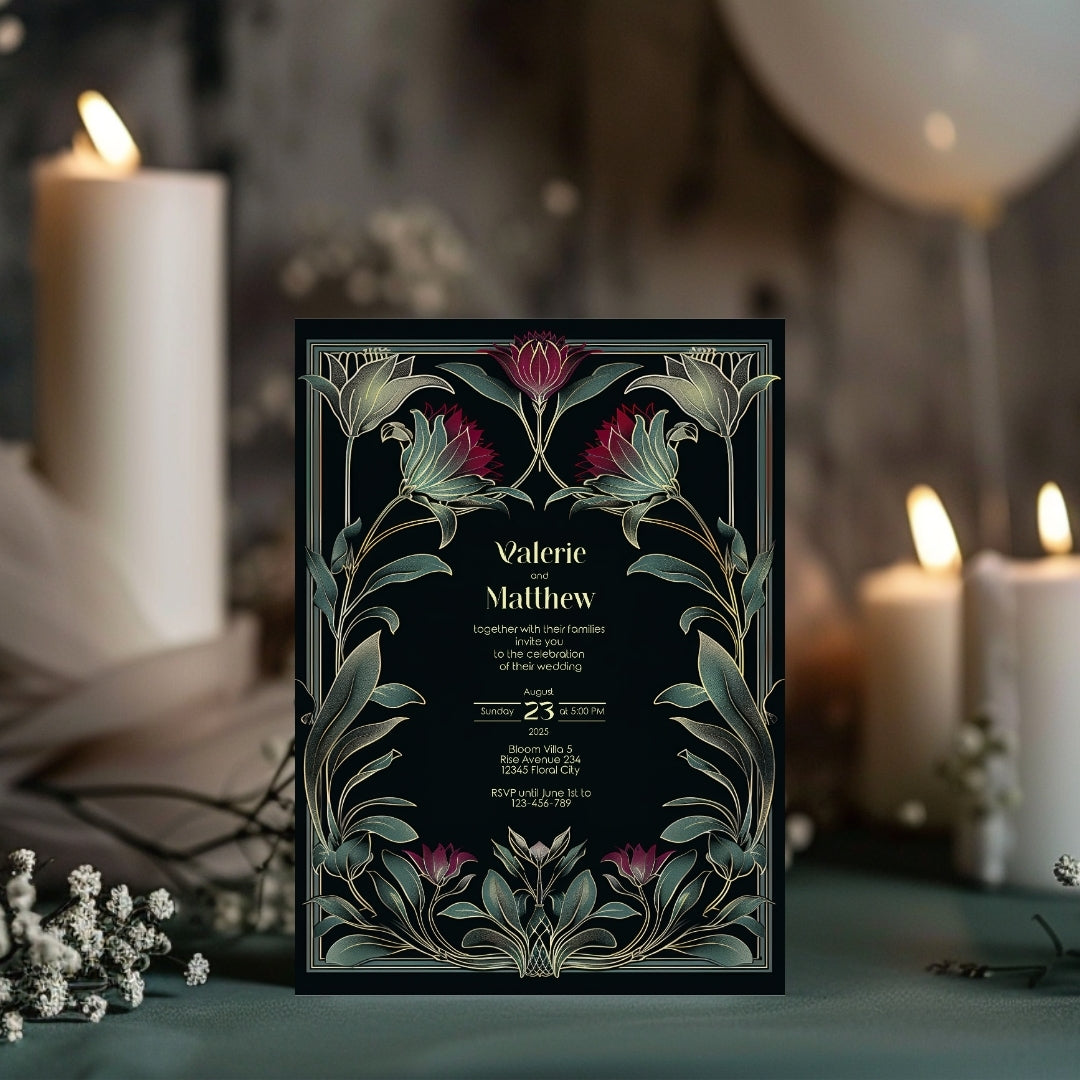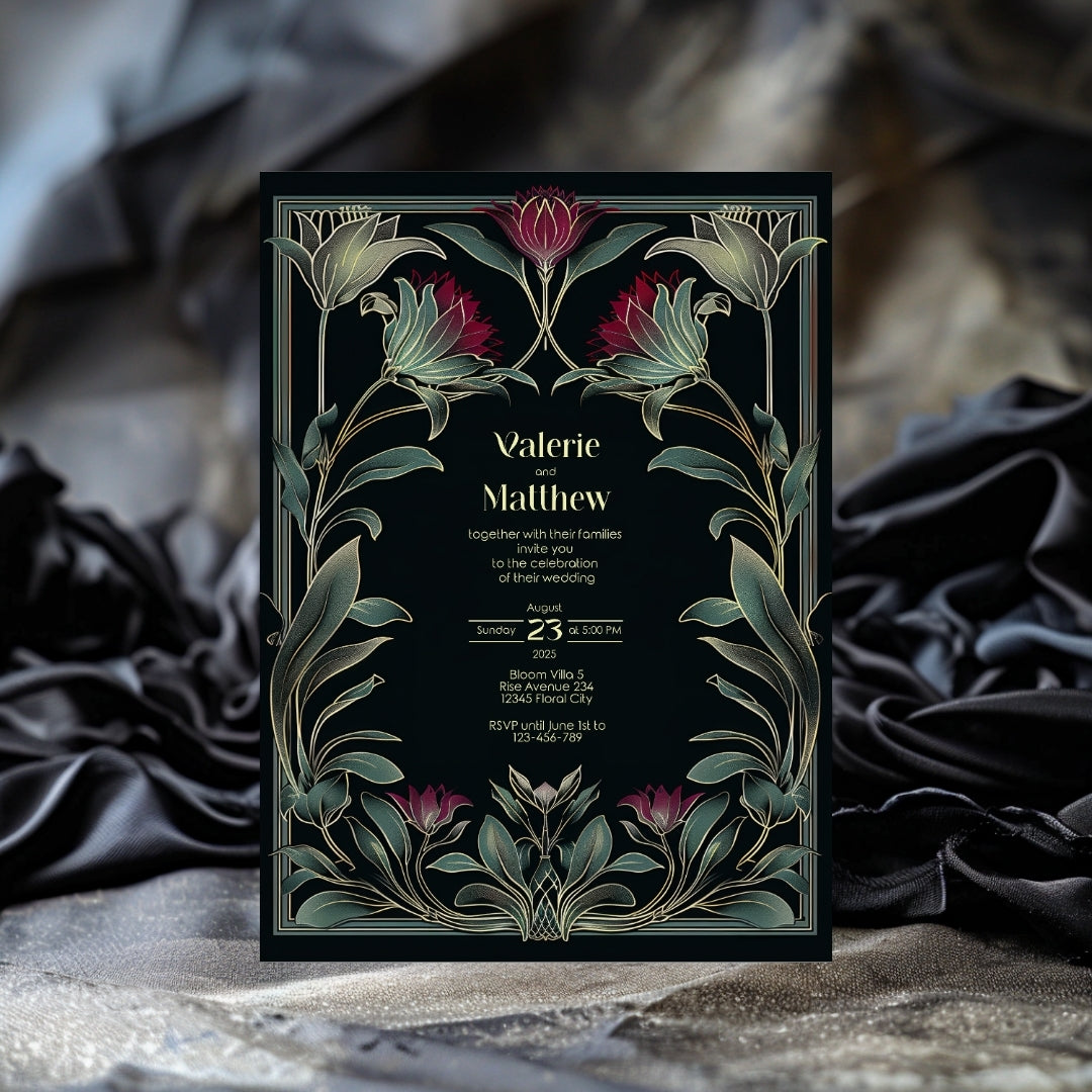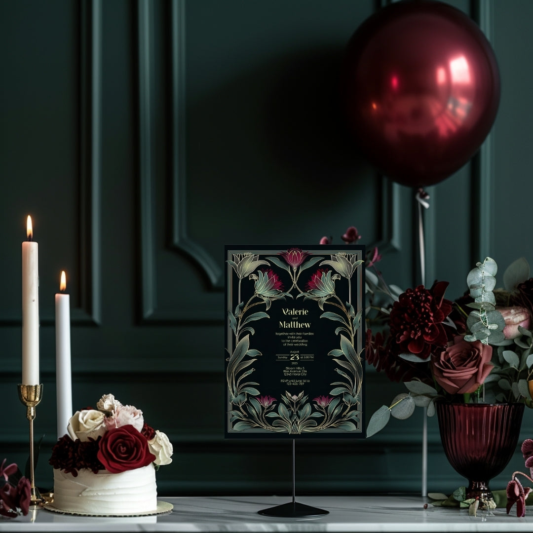 Revel in the romance and elegance of a bygone era with our Customizable Art Deco Wedding Invitation. Infused with the luxury of the 1920s, this exquisite digital template boasts an enthralling blend of geometric precision and floral sophistication, inviting your guests to a celebration of love and splendor. The sleek black backdrop accentuates the vibrant bursts of florals in hues of pink and gold, framing your event details in an aura of timeless charm. Perfect for those who adore the glamour of Art Deco and the delicate touch of nature, this invitation sets the tone for a wedding, anniversary, birthday, or any unforgettable celebration. Adaptable for both opulent and intimate gatherings, it offers you the freedom to customize every detail, from names to venue information, ensuring that your invitation is as unique as your event. With our editable template, available for instant download and editing via Corjl, you can create your masterpiece from the comfort of your home. Choose to print on luxe paper to elevate the tactile experience, or send it electronically to meld tradition with modern convenience. Make your special day's announcement a testament to style and grace. Embrace this invitation's invitation to weave the narrative of your love story into every element of your celebration.