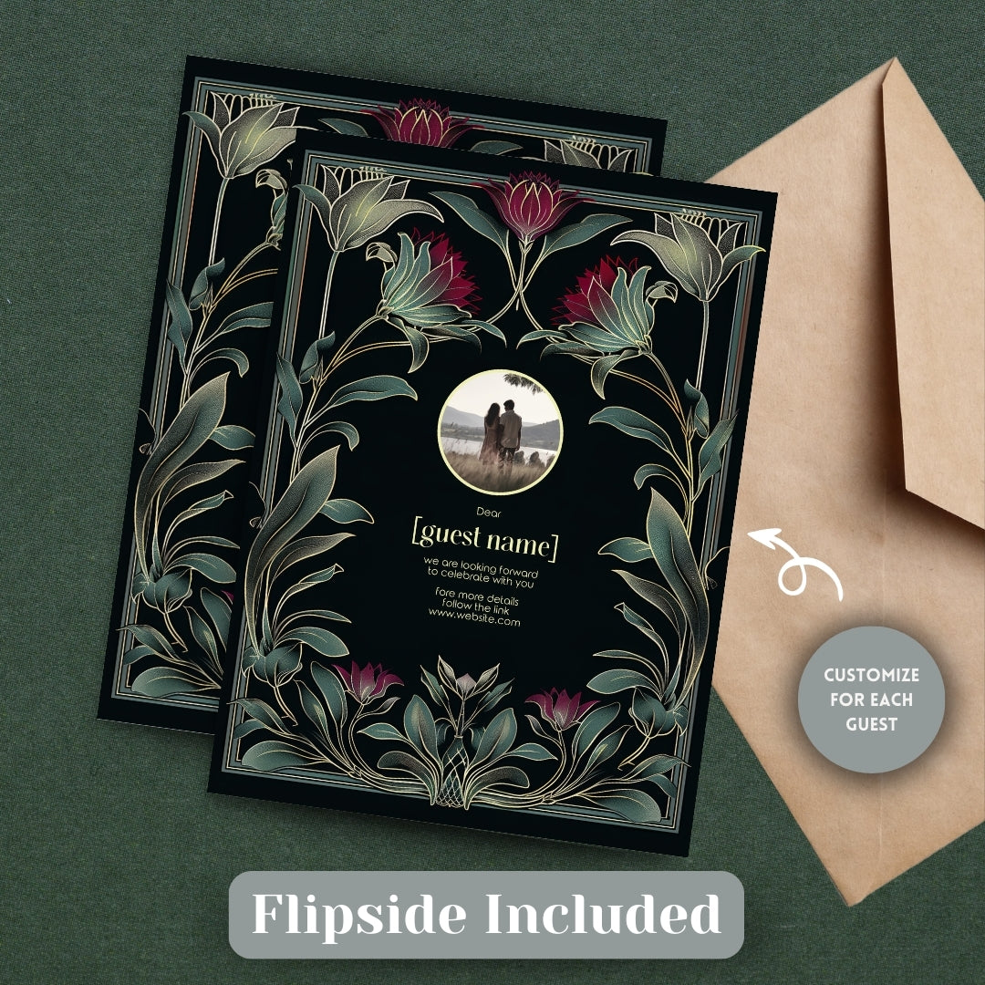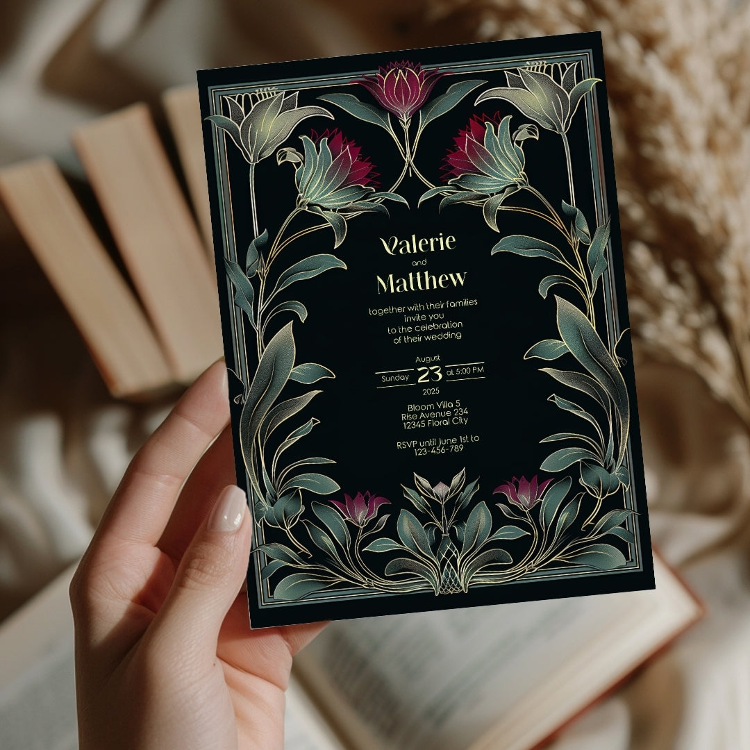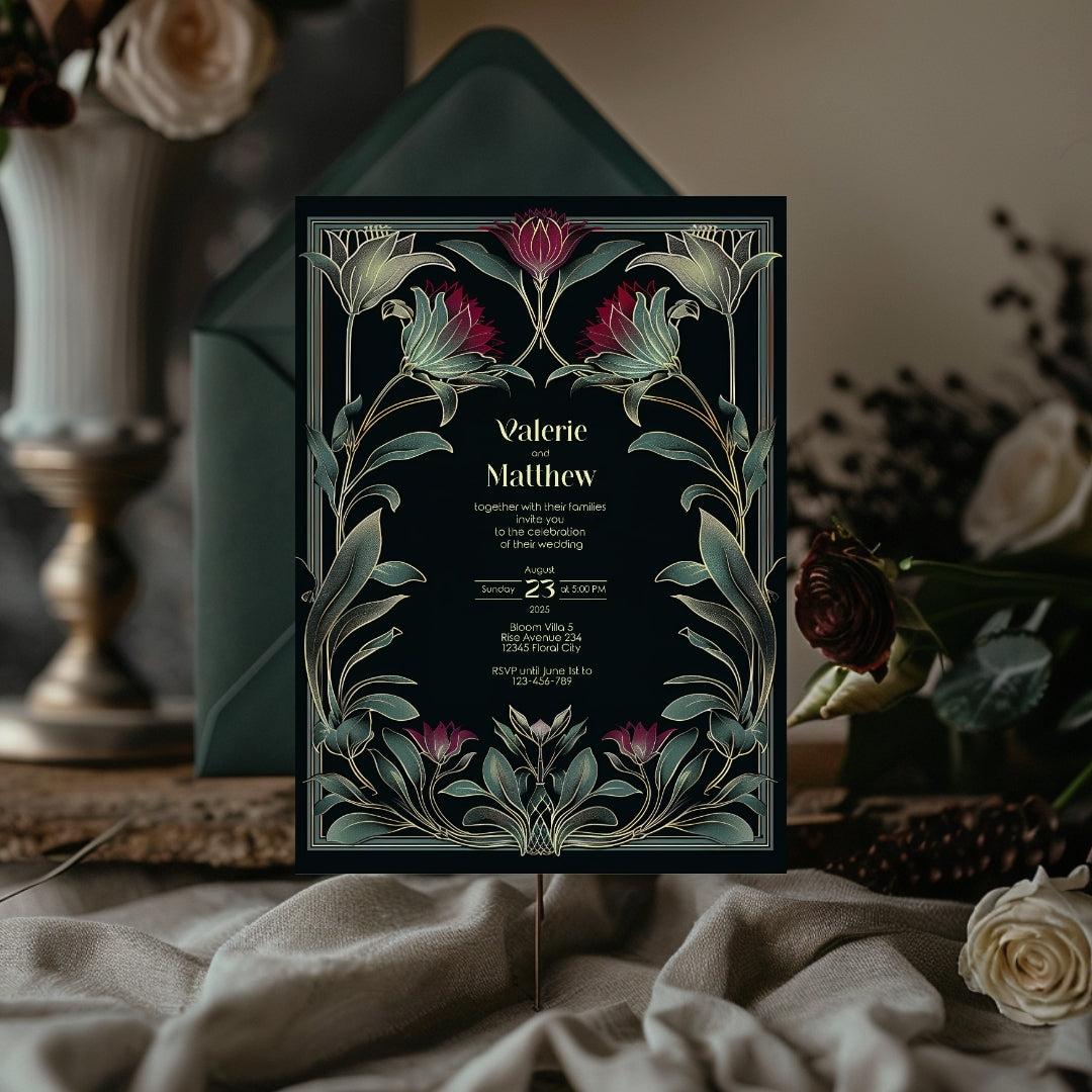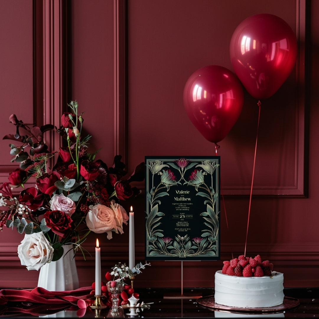Revel in the romance and elegance of a bygone era with our Customizable Art Deco Wedding Invitation. Infused with the luxury of the 1920s, this exquisite digital template boasts an enthralling blend of geometric precision and floral sophistication, inviting your guests to a celebration of love and splendor. The sleek black backdrop accentuates the vibrant bursts of florals in hues of pink and gold, framing your event details in an aura of timeless charm. Perfect for those who adore the glamour of Art Deco and the delicate touch of nature, this invitation sets the tone for a wedding, anniversary, birthday, or any unforgettable celebration. Adaptable for both opulent and intimate gatherings, it offers you the freedom to customize every detail, from names to venue information, ensuring that your invitation is as unique as your event. With our editable template, available for instant download and editing via Corjl, you can create your masterpiece from the comfort of your home. Choose to print on luxe paper to elevate the tactile experience, or send it electronically to meld tradition with modern convenience. Make your special day's announcement a testament to style and grace. Embrace this invitation's invitation to weave the narrative of your love story into every element of your celebration.