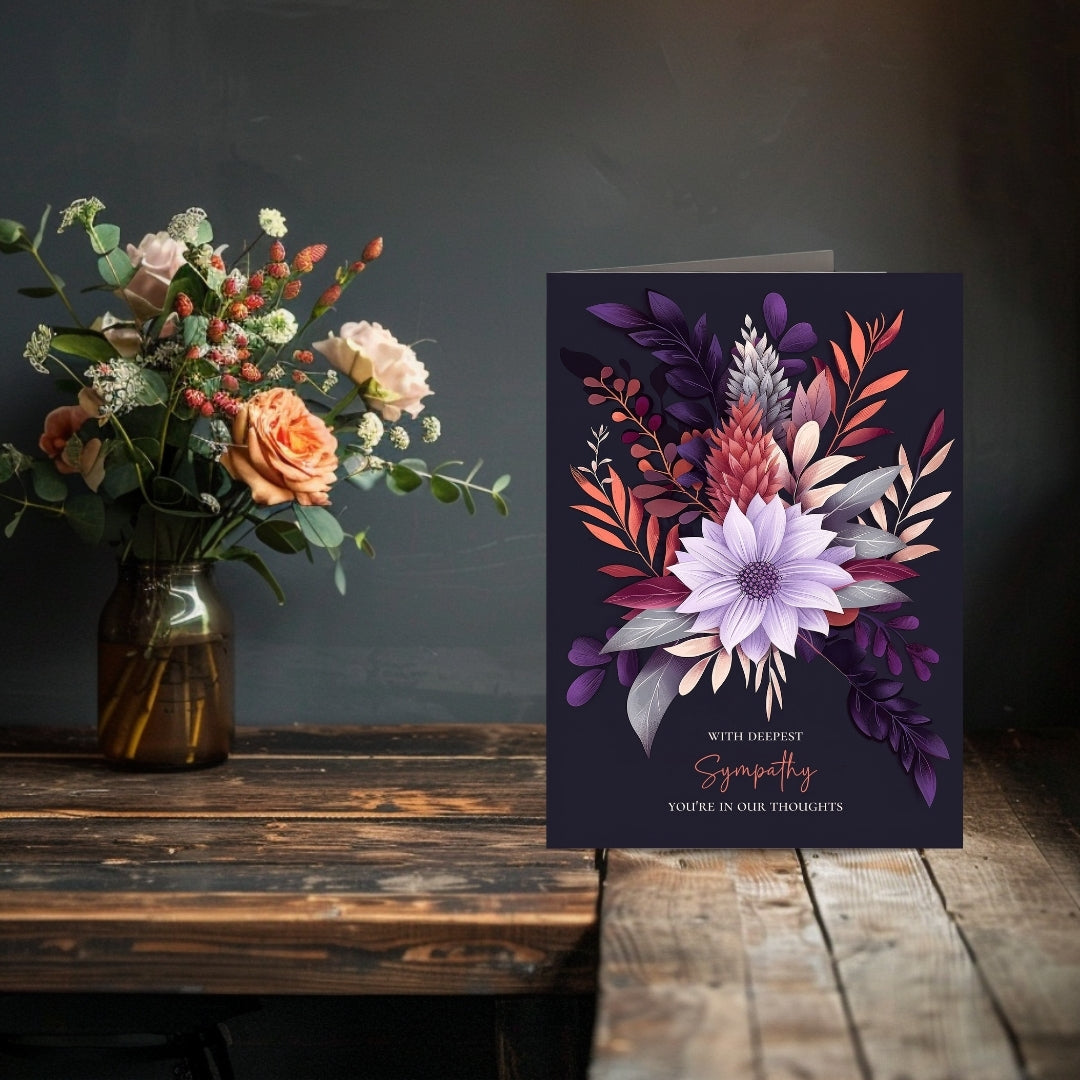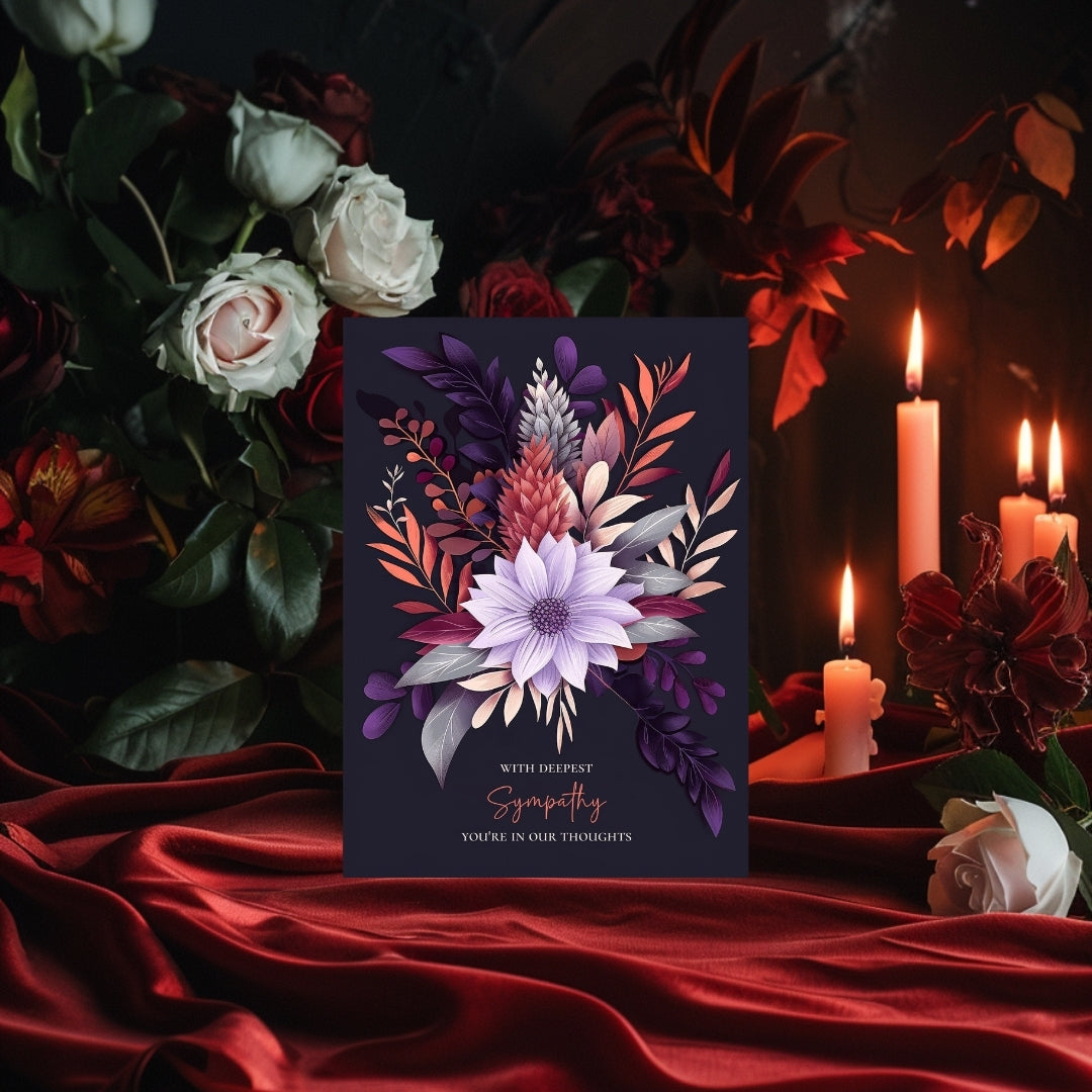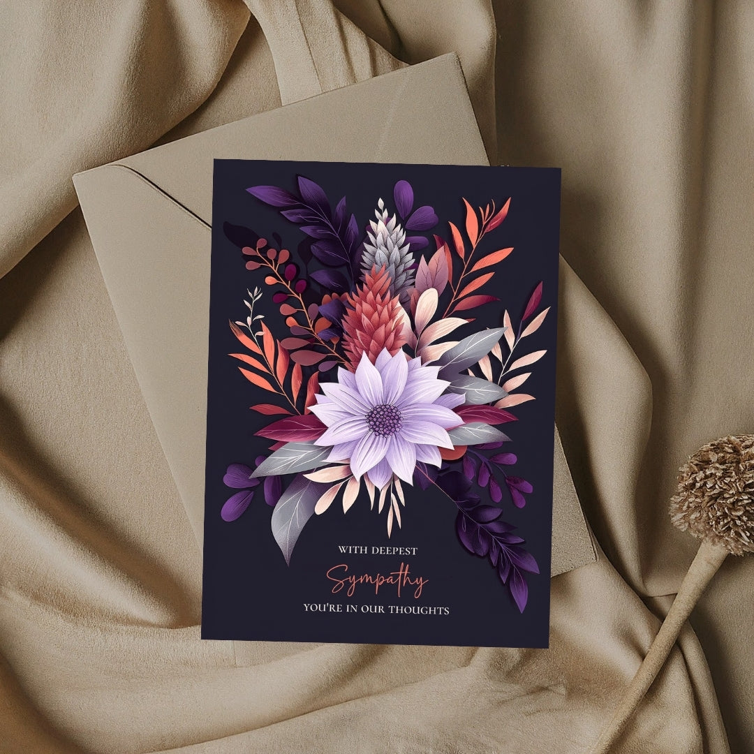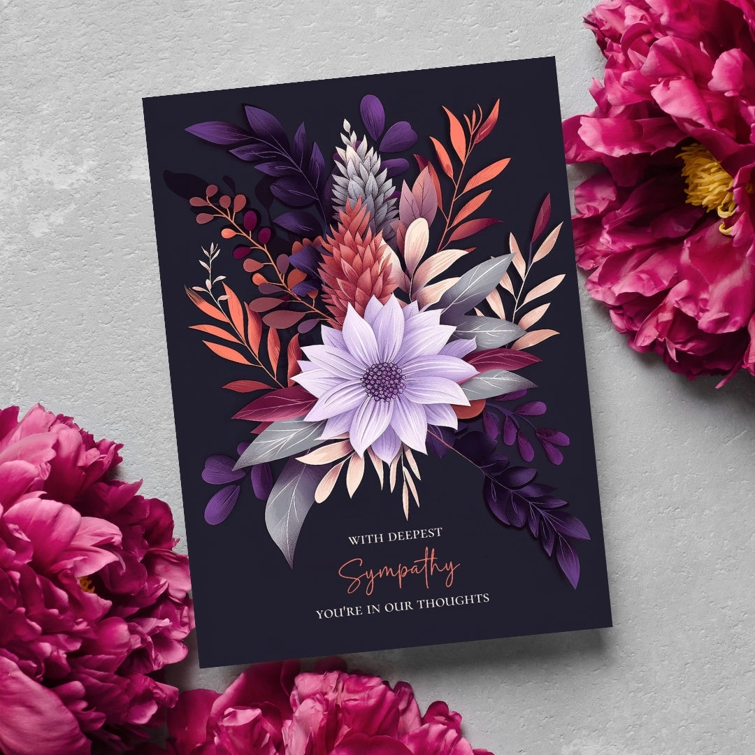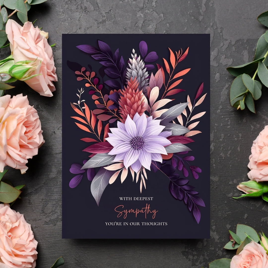 Our sympathy card features a dark navy background adorned with beautifully detailed floral elements in vibrant shades of purple, pink, and orange. The centralized text is framed by a symmetrical arrangement of flowers and leaves, adding a touch of nature-inspired elegance.