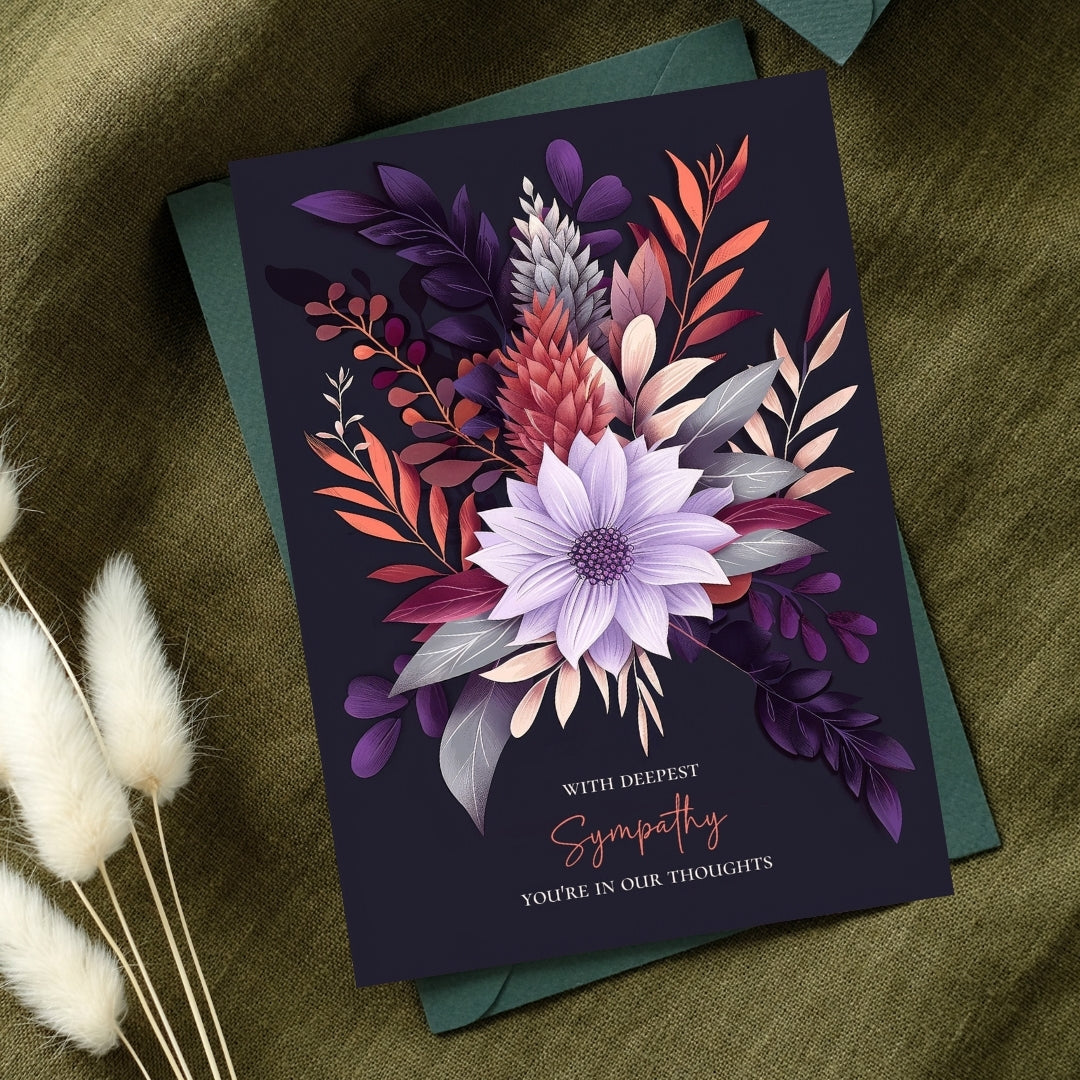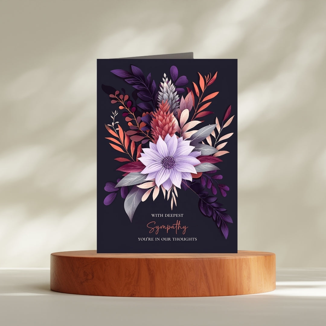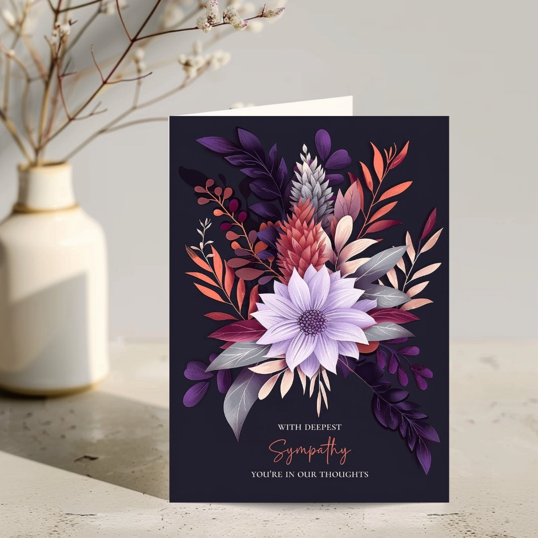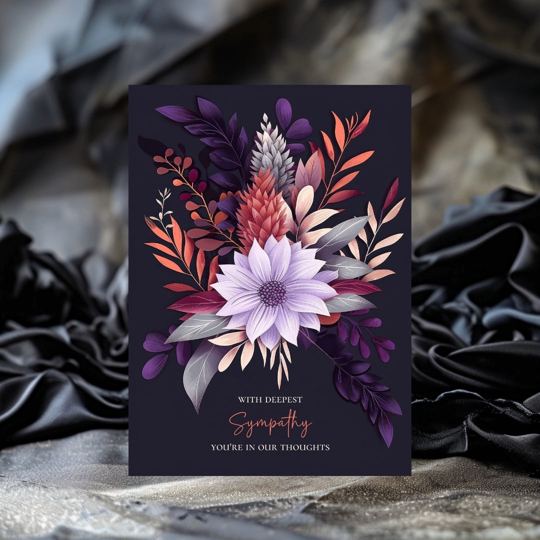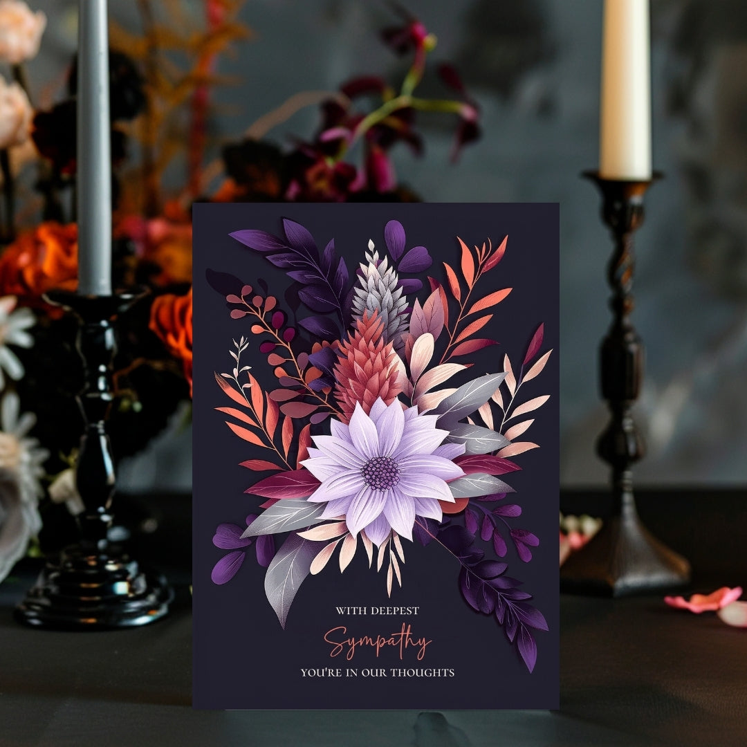 Our sympathy card features a dark navy background adorned with beautifully detailed floral elements in vibrant shades of purple, pink, and orange. The centralized text is framed by a symmetrical arrangement of flowers and leaves, adding a touch of nature-inspired elegance.