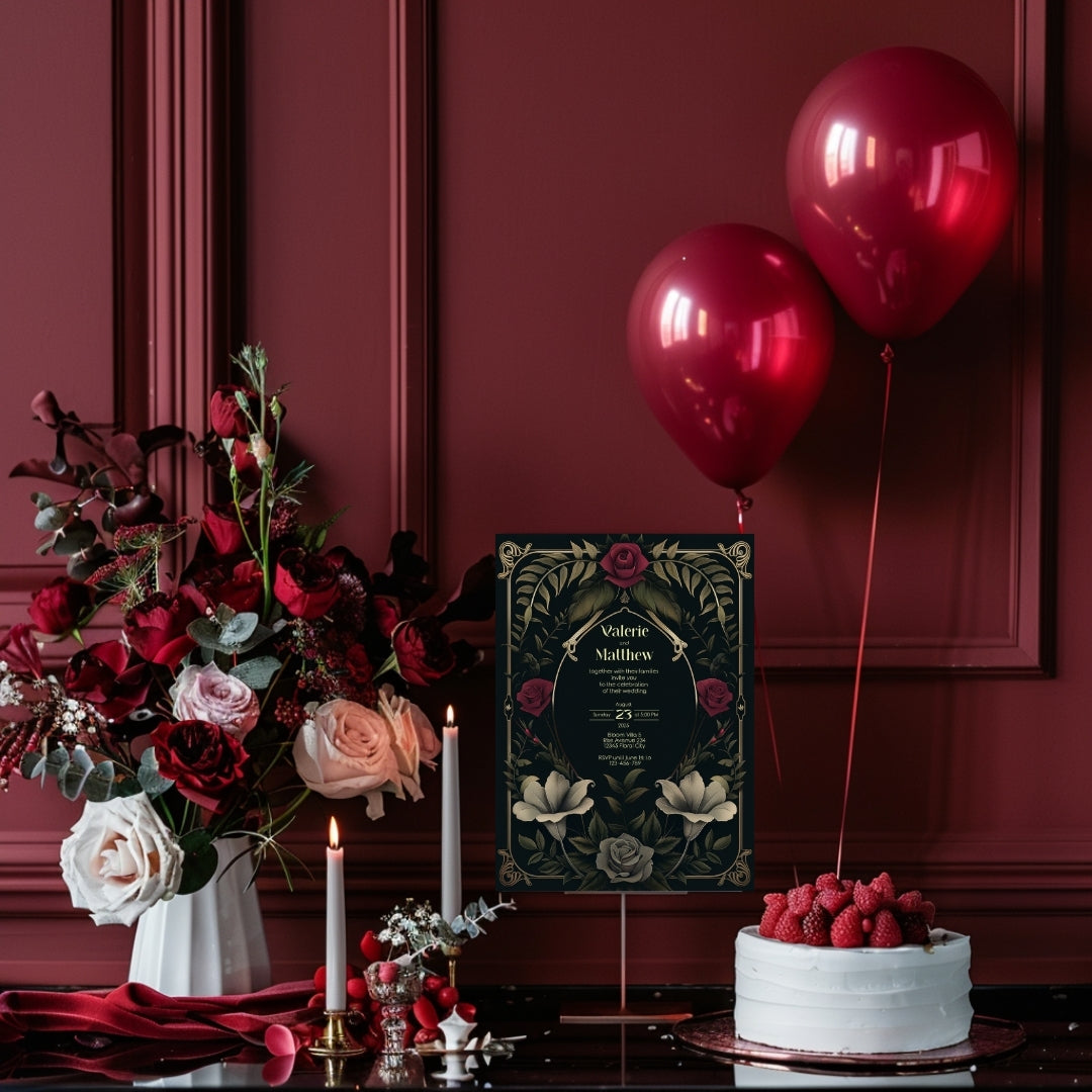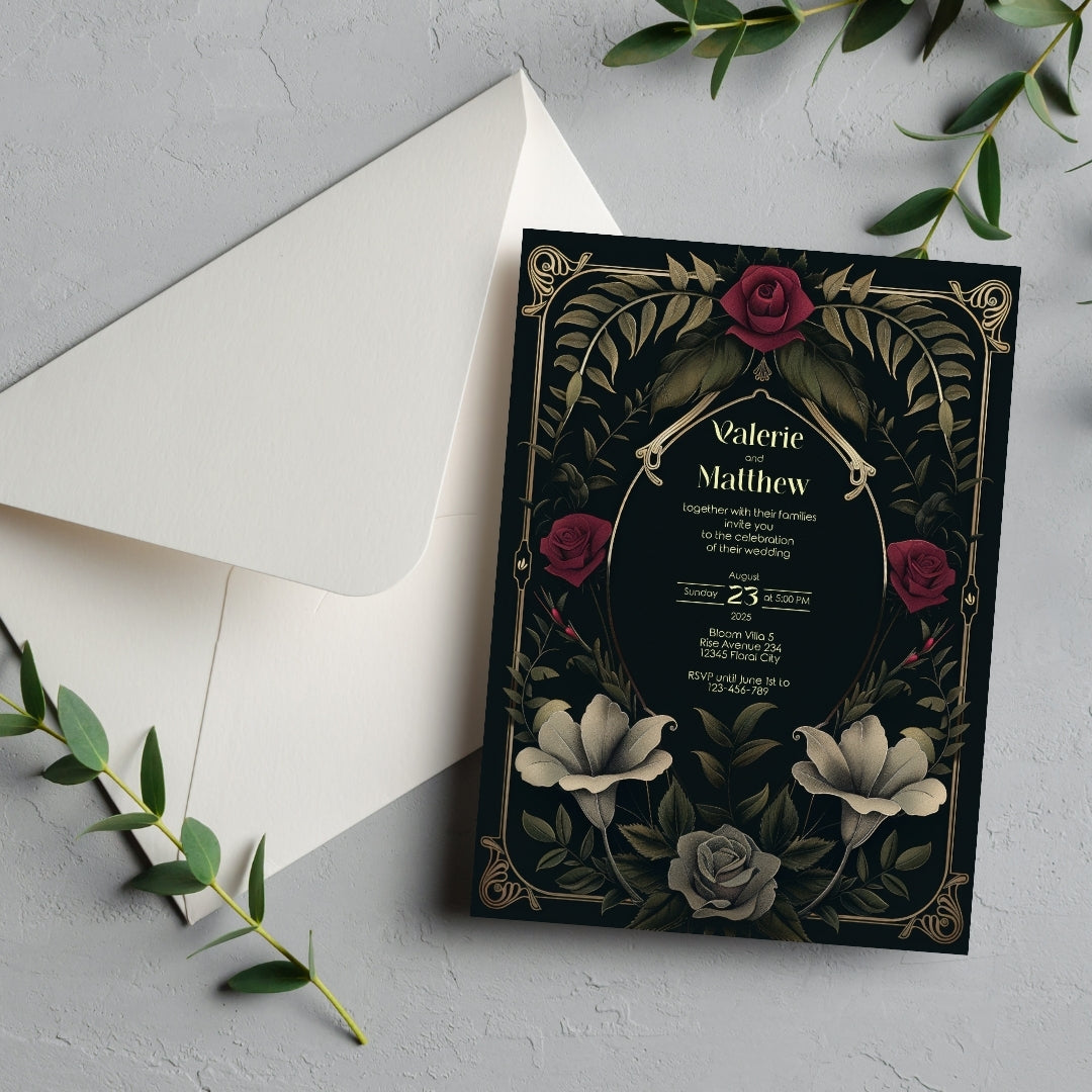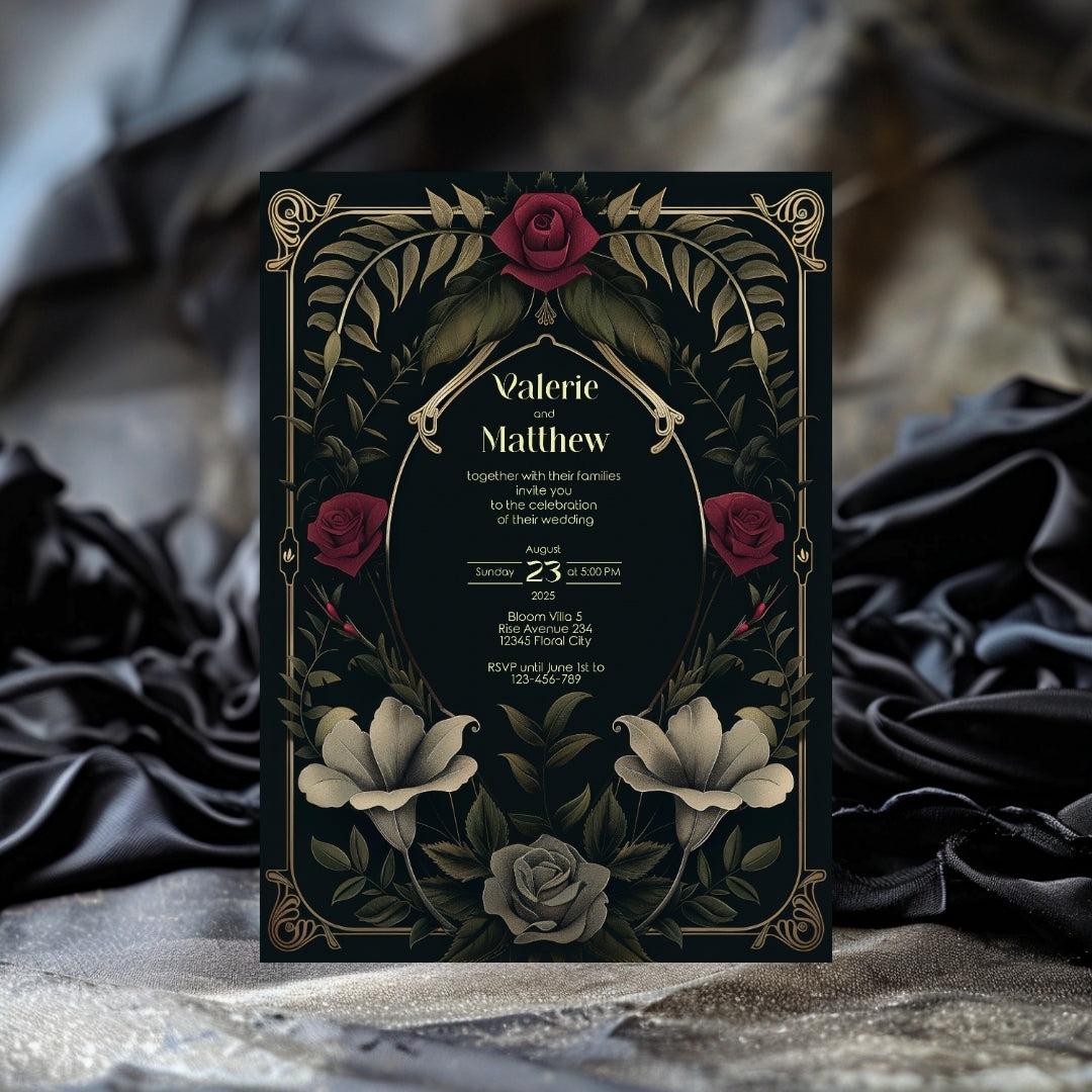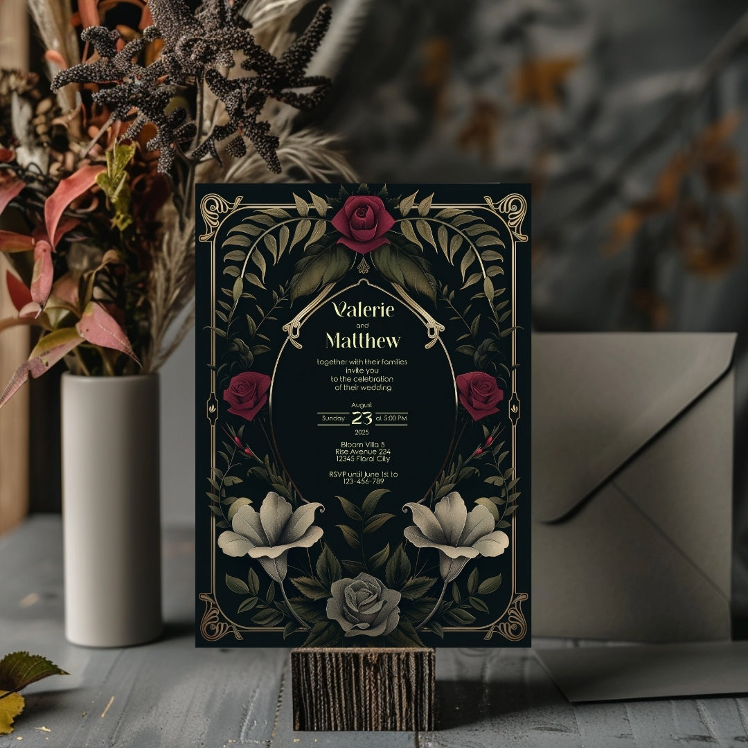 Sweep your guests back to the opulent Roaring Twenties with our Rose Garden Wedding Invitation, a digital template that captures the spirit of the era with a noir twist. This stunning design intertwines the boldness of Art Deco with the romanticism of a midnight rose garden, featuring an elegant arrangement of gold-accented arches and lush roses in full bloom. The deep, dark background provides a dramatic canvas for the blooms in shades of crimson and classic grey, creating an invitation perfect for your wedding, a significant anniversary, or a sumptuous themed party. Personalize this invitation with ease using Corjl and choose to share your enchanting event details with a traditional print or a modern digital touch. Step into a timeless tale of love and celebration with an invitation that's as memorable as the day itself.