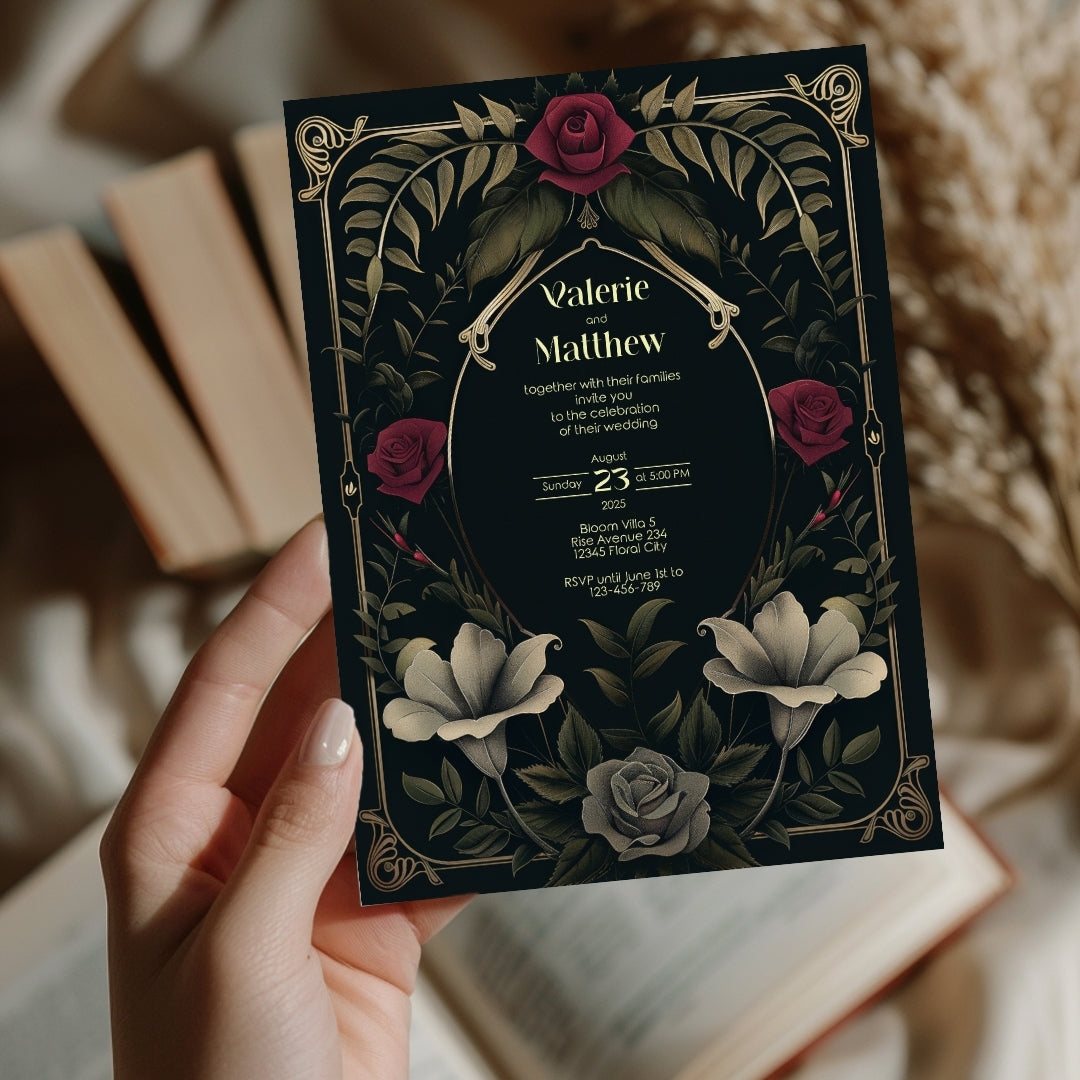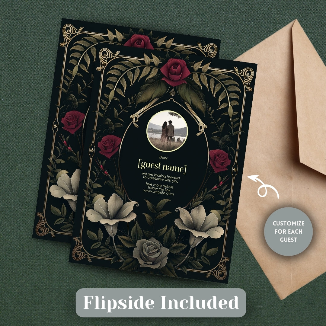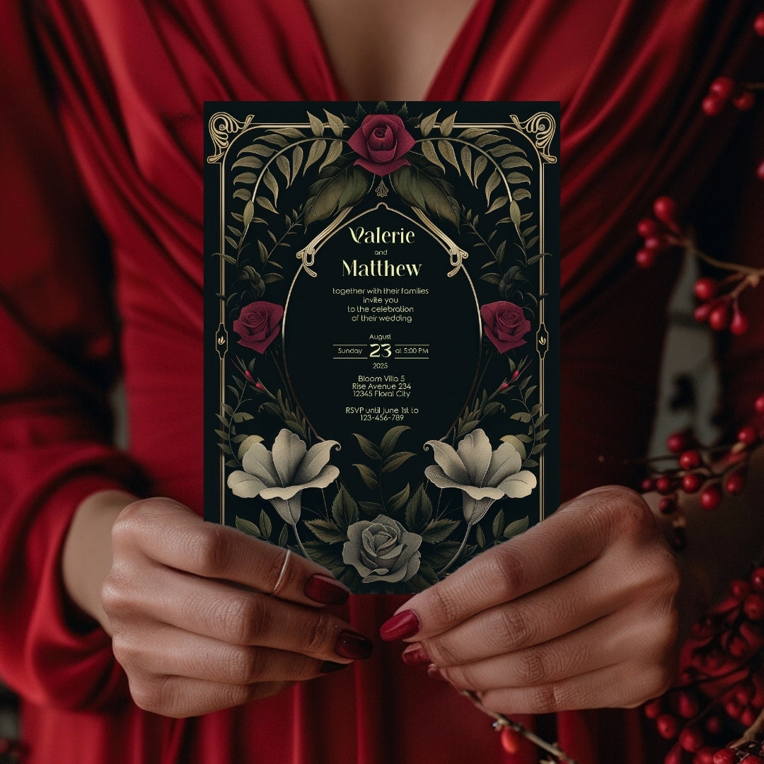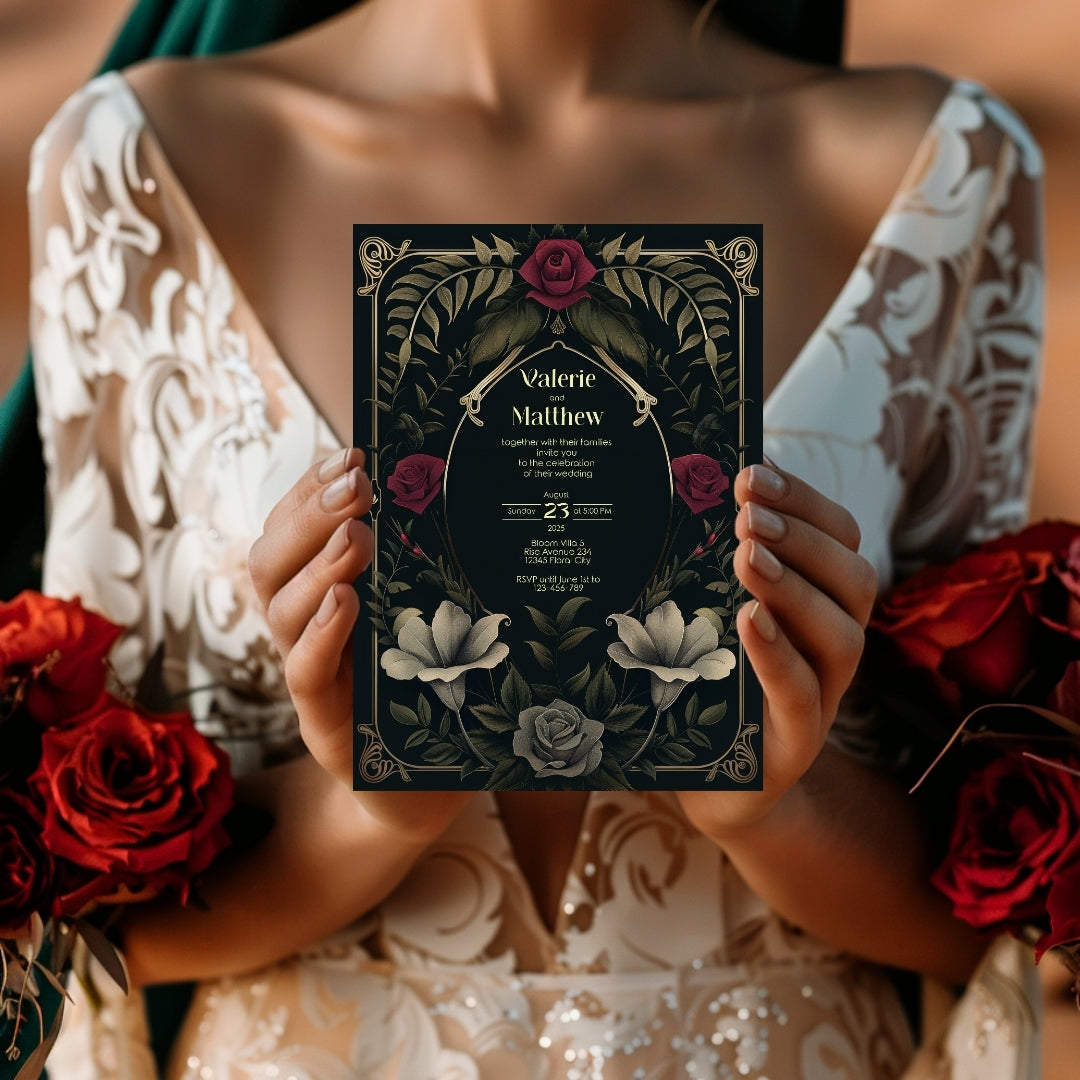 Sweep your guests back to the opulent Roaring Twenties with our Rose Garden Wedding Invitation, a digital template that captures the spirit of the era with a noir twist. This stunning design intertwines the boldness of Art Deco with the romanticism of a midnight rose garden, featuring an elegant arrangement of gold-accented arches and lush roses in full bloom. The deep, dark background provides a dramatic canvas for the blooms in shades of crimson and classic grey, creating an invitation perfect for your wedding, a significant anniversary, or a sumptuous themed party. Personalize this invitation with ease using Corjl and choose to share your enchanting event details with a traditional print or a modern digital touch. Step into a timeless tale of love and celebration with an invitation that's as memorable as the day itself.