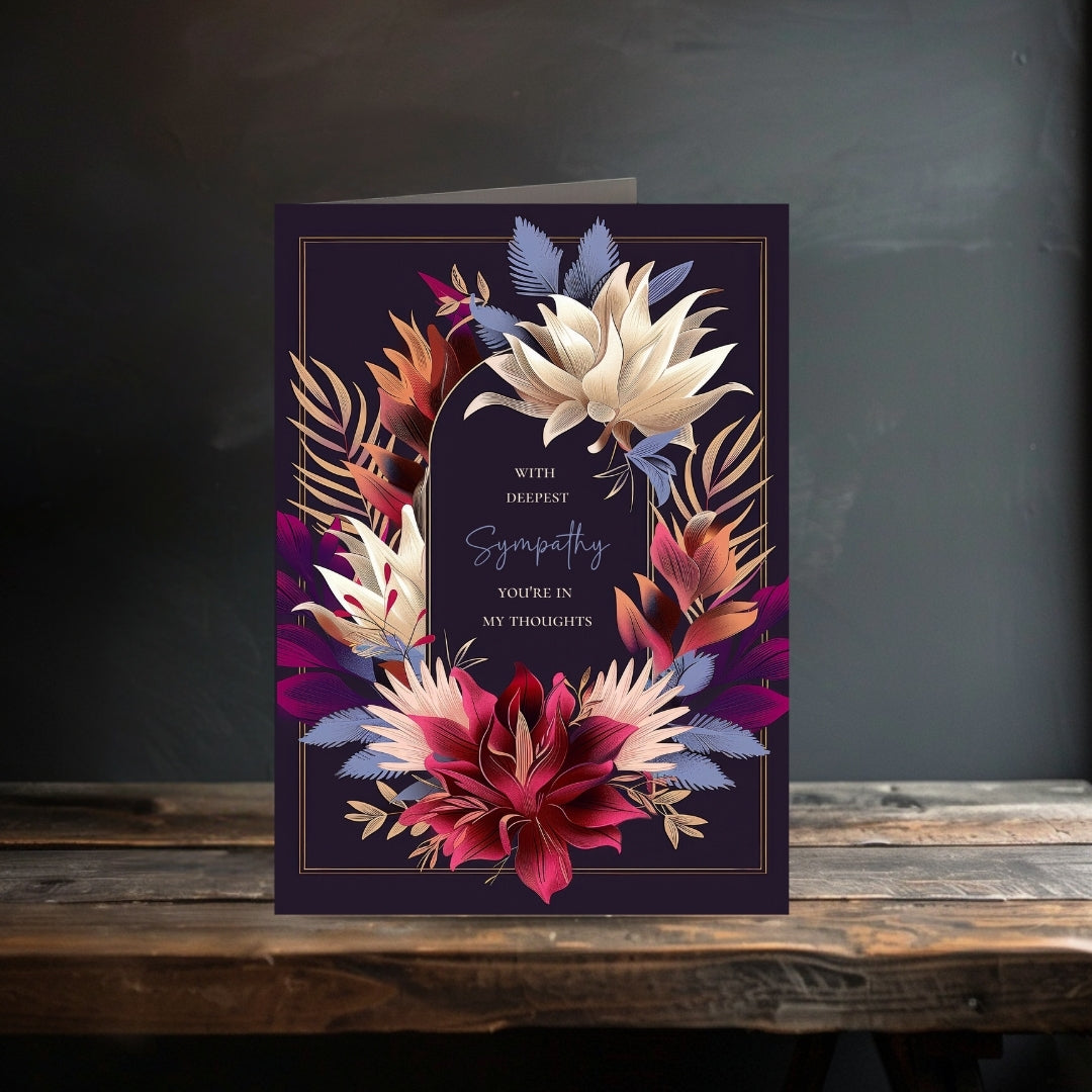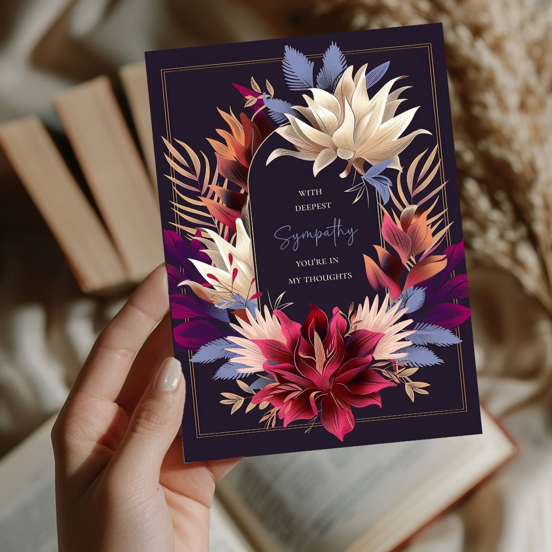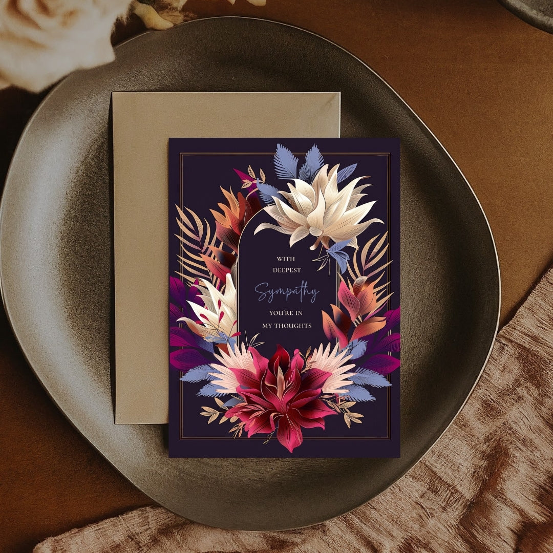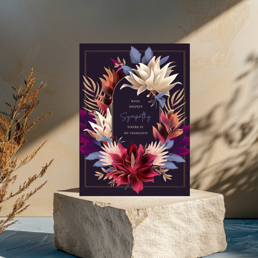 Our sympathy card features a dark navy background adorned with beautifully detailed floral elements in vibrant shades of red, cream, purple, and blue. The centralized text is framed by a symmetrical arrangement of flowers and leaves, adding a touch of nature-inspired elegance.