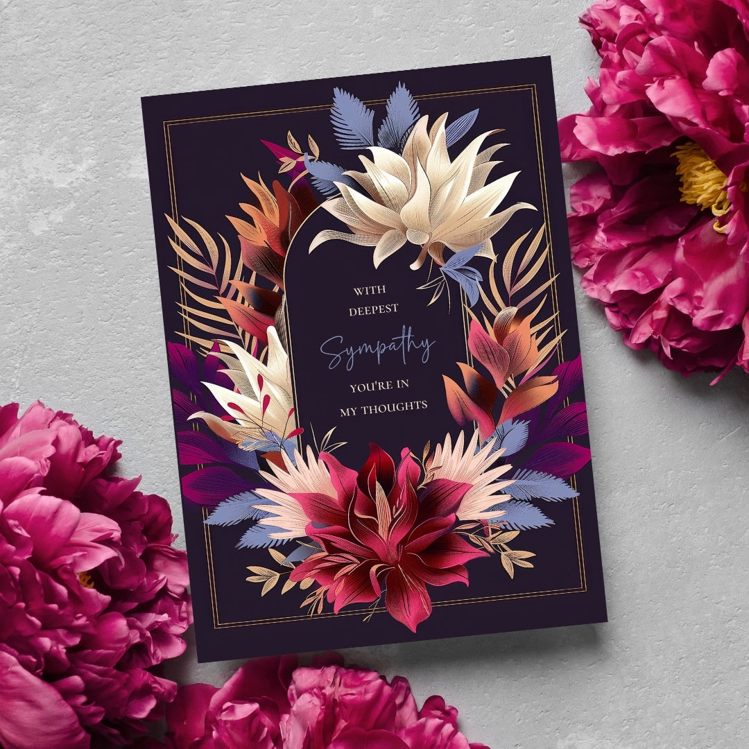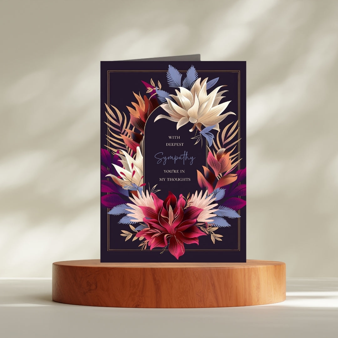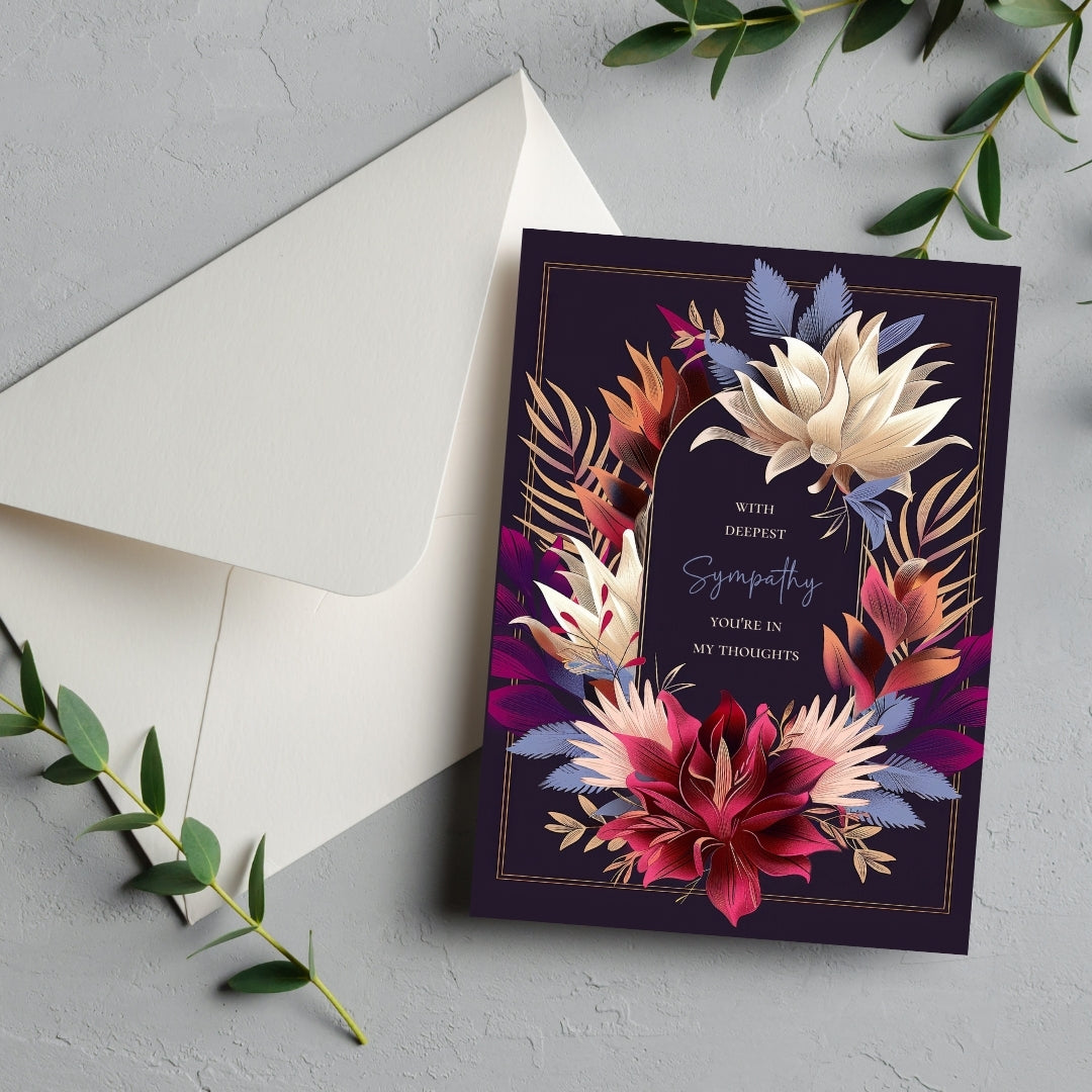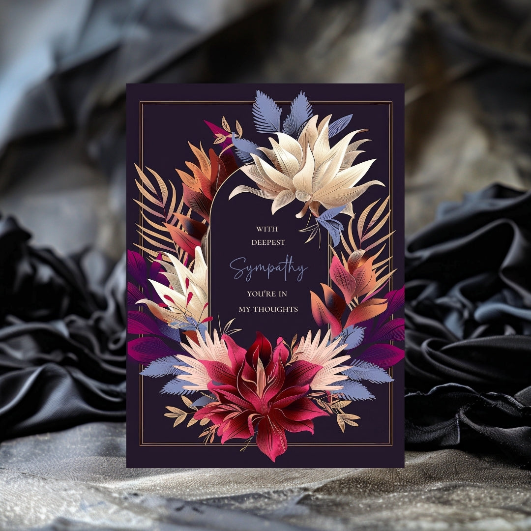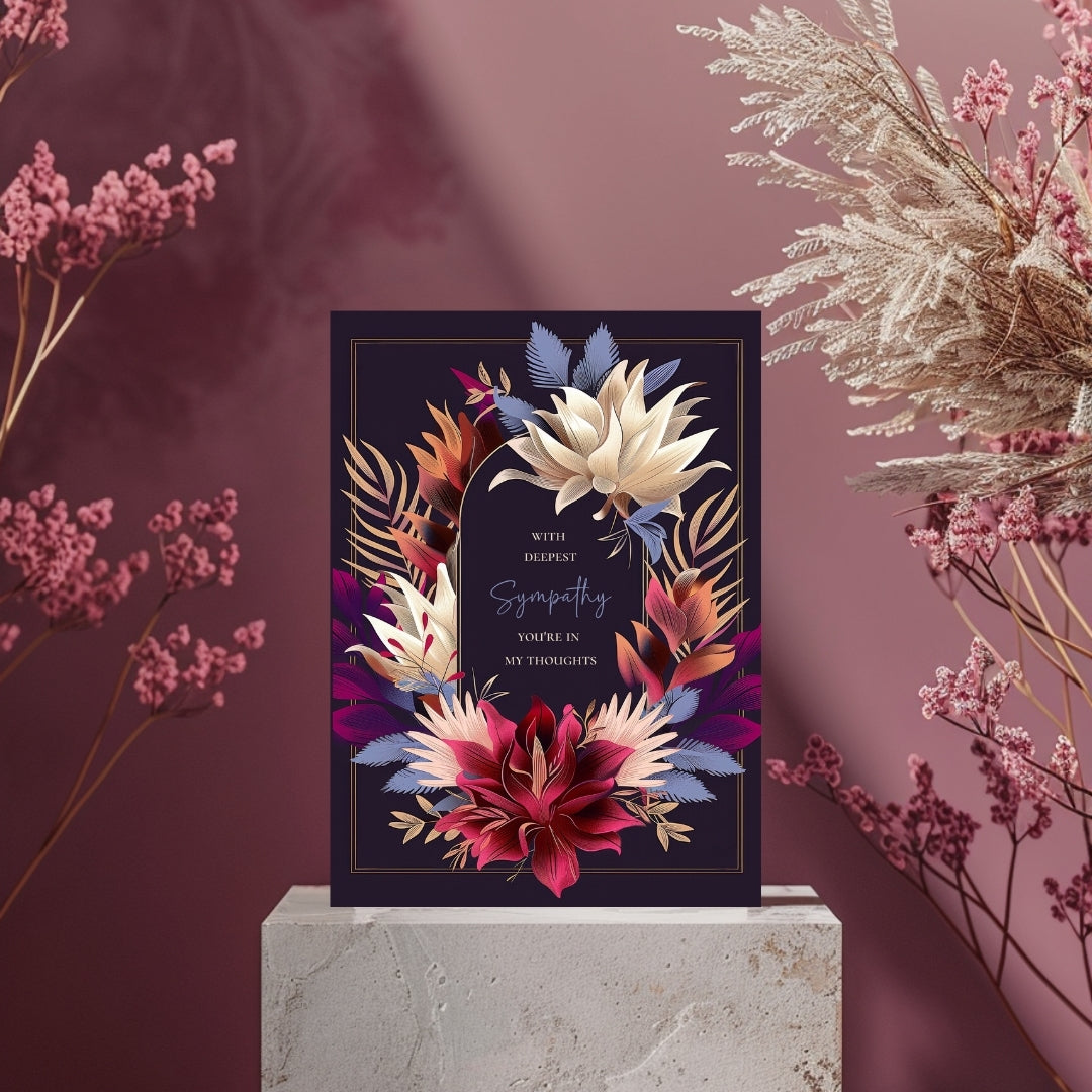 Our sympathy card features a dark navy background adorned with beautifully detailed floral elements in vibrant shades of red, cream, purple, and blue. The centralized text is framed by a symmetrical arrangement of flowers and leaves, adding a touch of nature-inspired elegance.