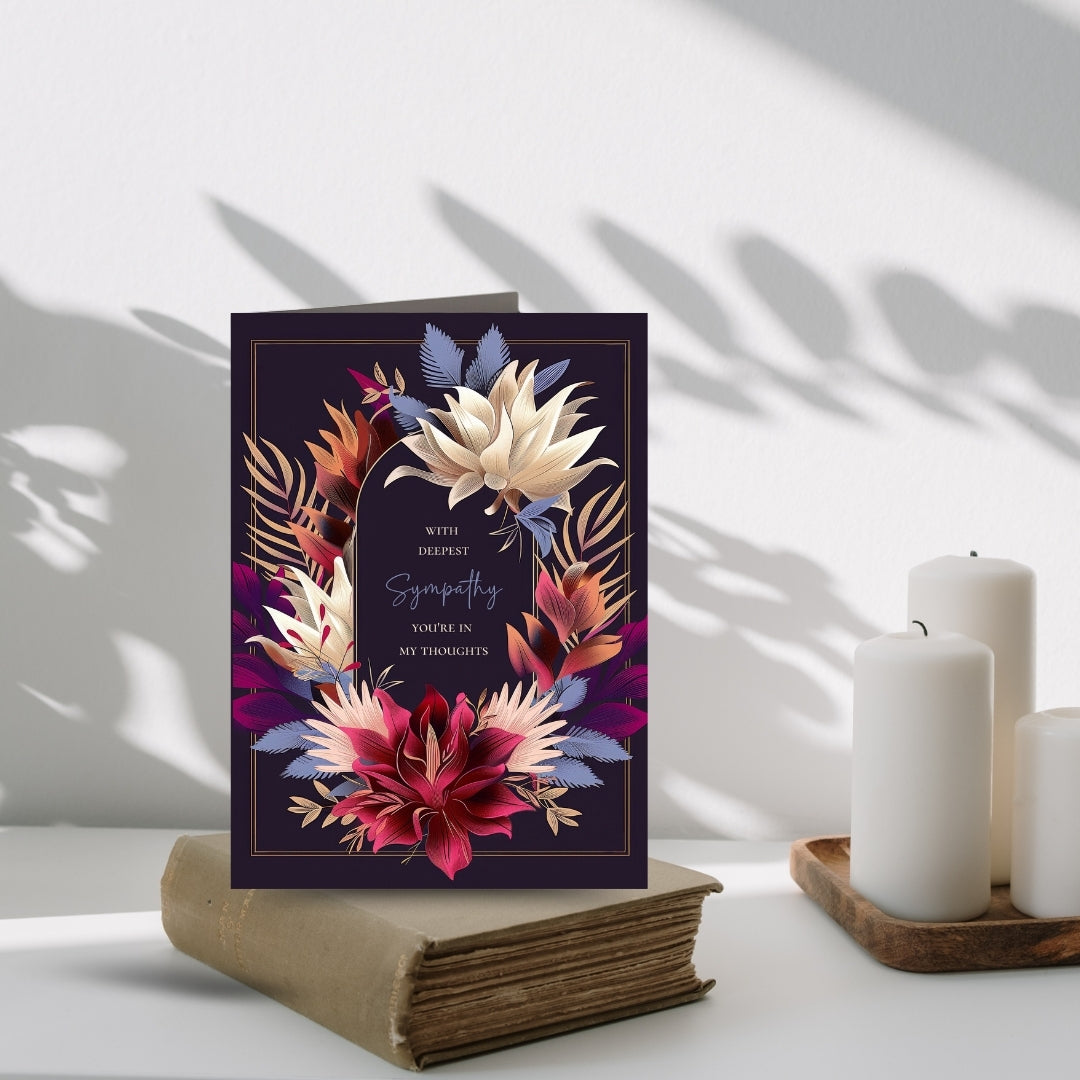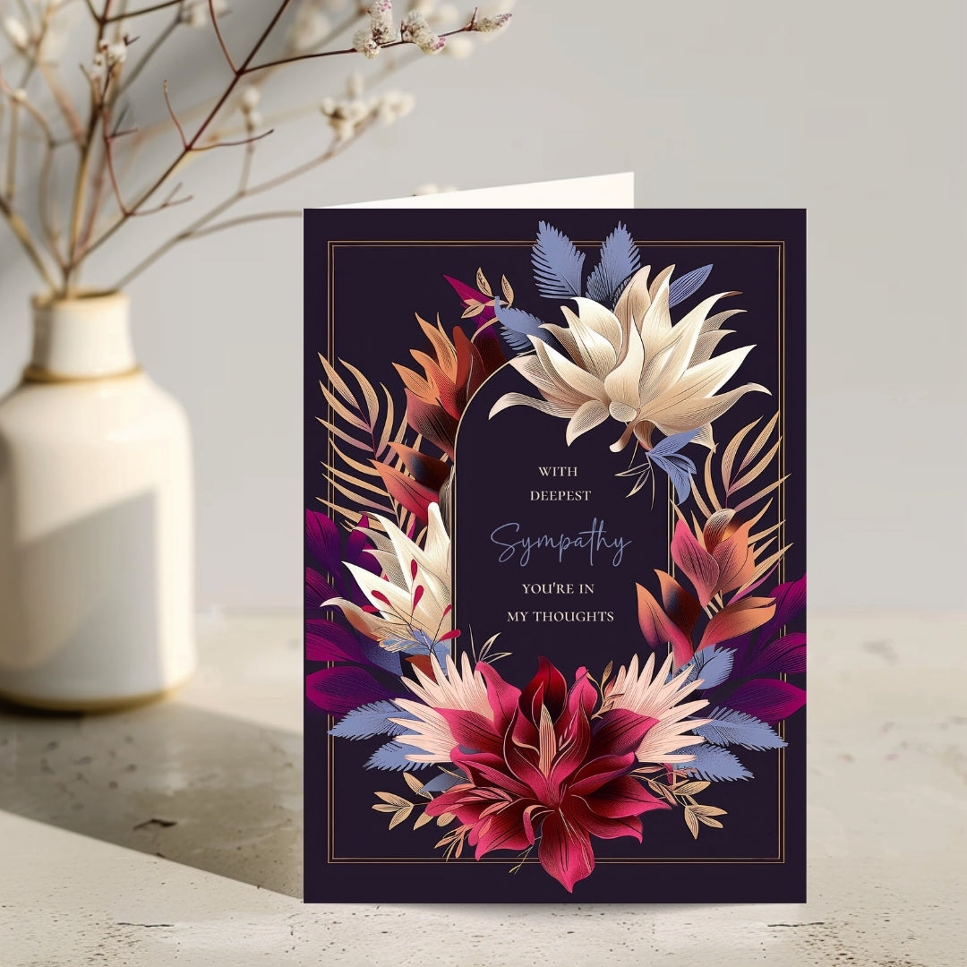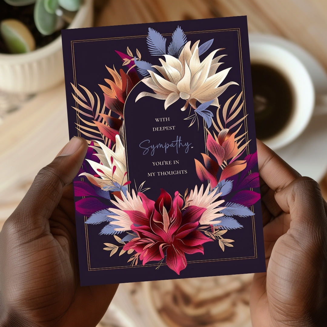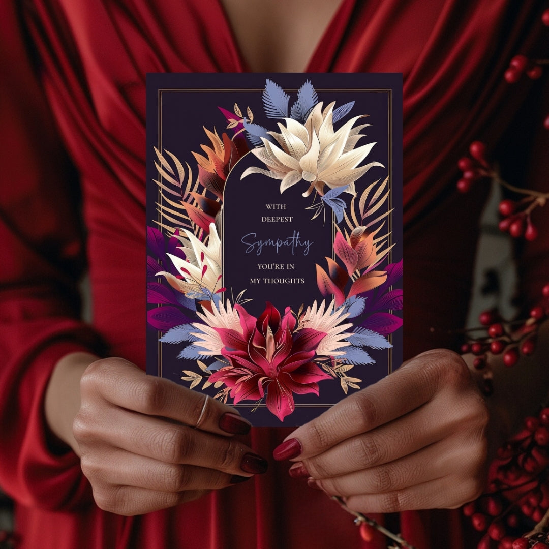 Our sympathy card features a dark navy background adorned with beautifully detailed floral elements in vibrant shades of red, cream, purple, and blue. The centralized text is framed by a symmetrical arrangement of flowers and leaves, adding a touch of nature-inspired elegance.