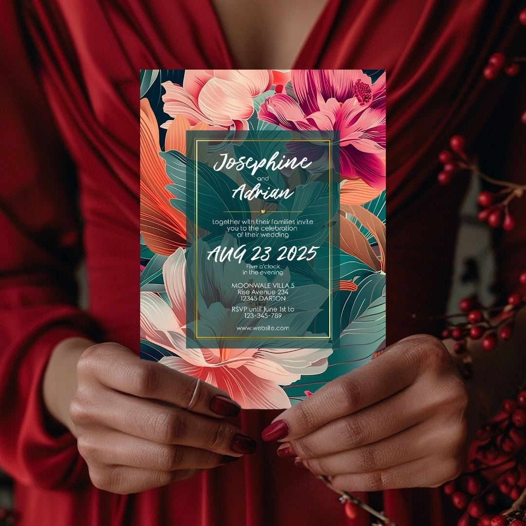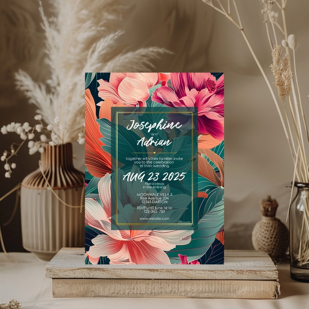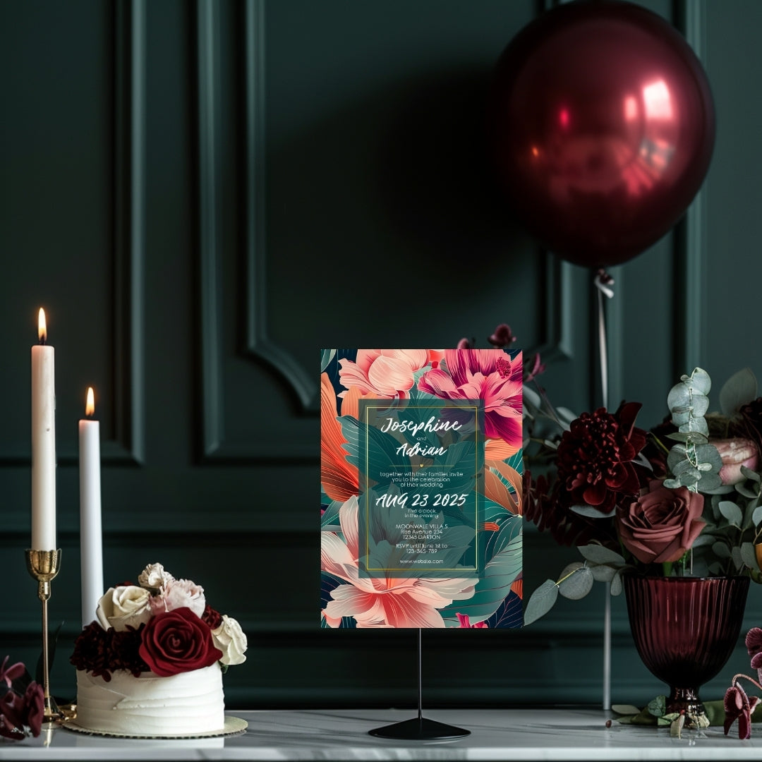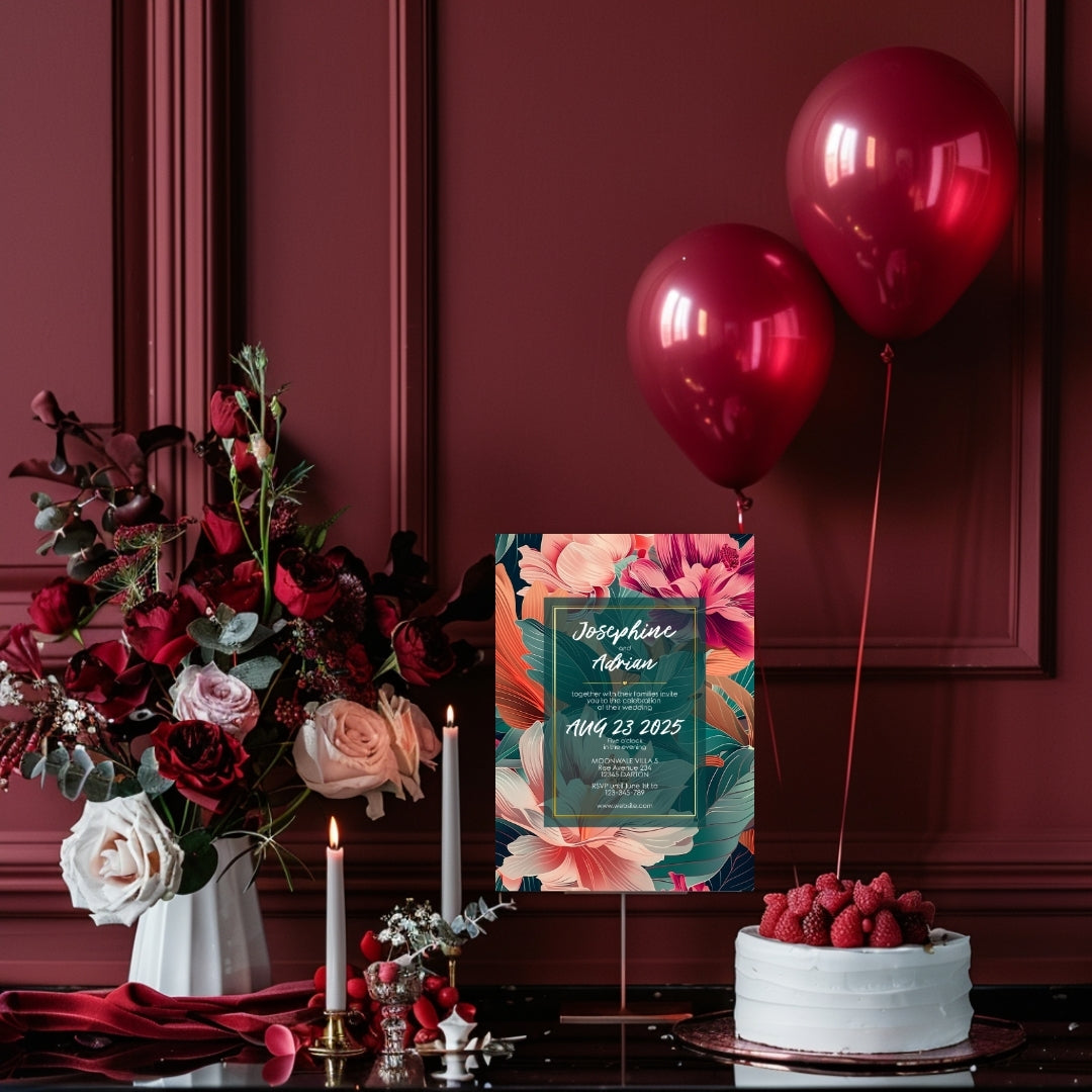 Inviting you to step into a garden of elegance with our Floral Garden Party Invitation, a digital template that is a perfect prelude to your chic soiree. Ideal for weddings, anniversaries, milestone birthdays, or any event that calls for a touch of class, this invitation marries the beauty of floral exuberance with a sophisticated aesthetic. Vivid flowers in shades of pink and coral bloom against a serene teal backdrop, framed by a sleek geometric border that whispers the glamour of a bygone era. Tailor the details with ease on Corjl and choose between a high-quality digital format to share via email or a print-ready file for a tangible memento of your upcoming festivity.