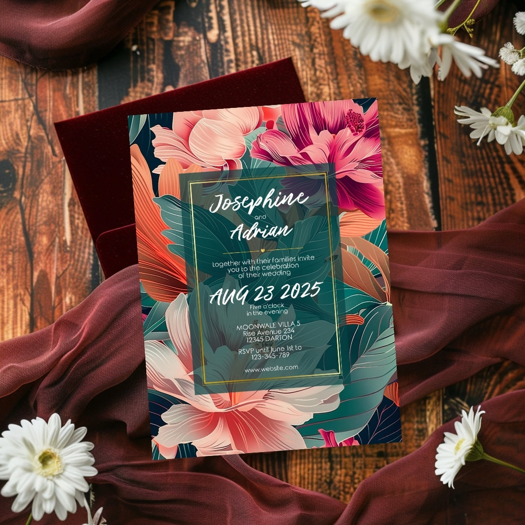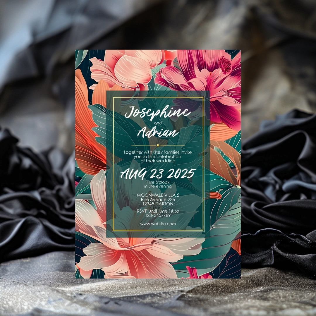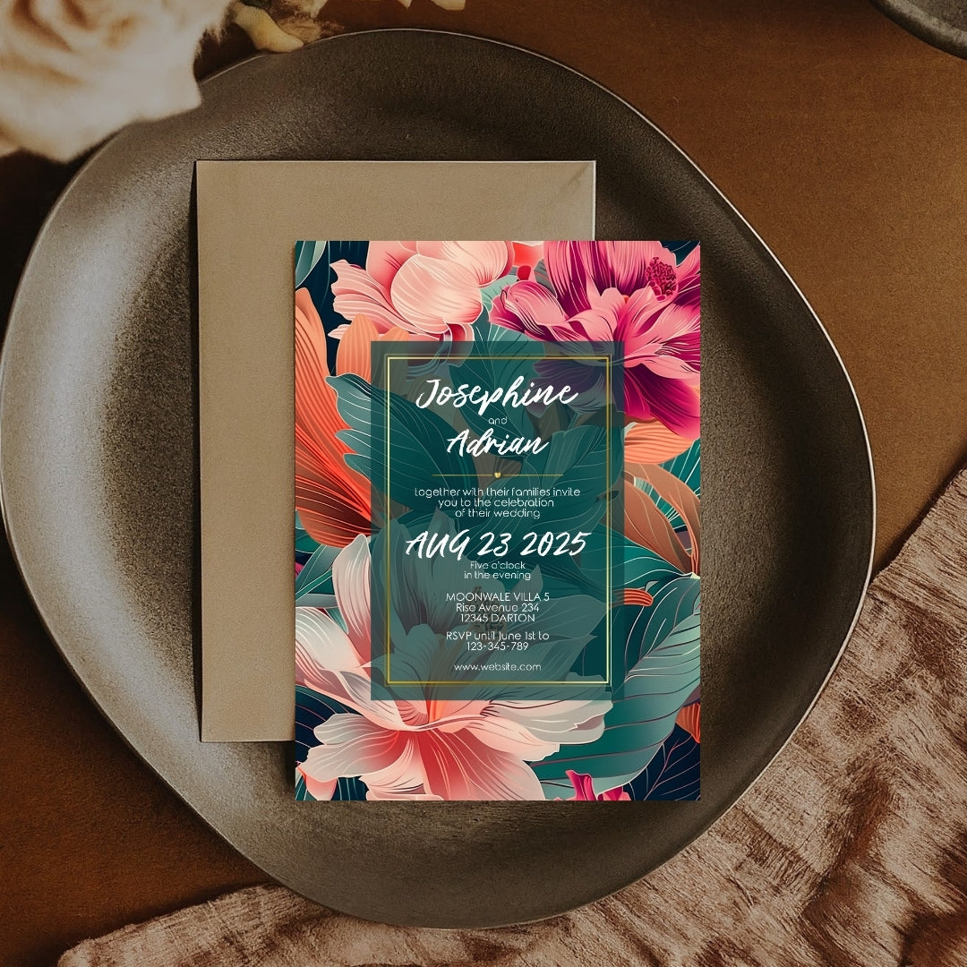 Inviting you to step into a garden of elegance with our Floral Garden Party Invitation, a digital template that is a perfect prelude to your chic soiree. Ideal for weddings, anniversaries, milestone birthdays, or any event that calls for a touch of class, this invitation marries the beauty of floral exuberance with a sophisticated aesthetic. Vivid flowers in shades of pink and coral bloom against a serene teal backdrop, framed by a sleek geometric border that whispers the glamour of a bygone era. Tailor the details with ease on Corjl and choose between a high-quality digital format to share via email or a print-ready file for a tangible memento of your upcoming festivity.