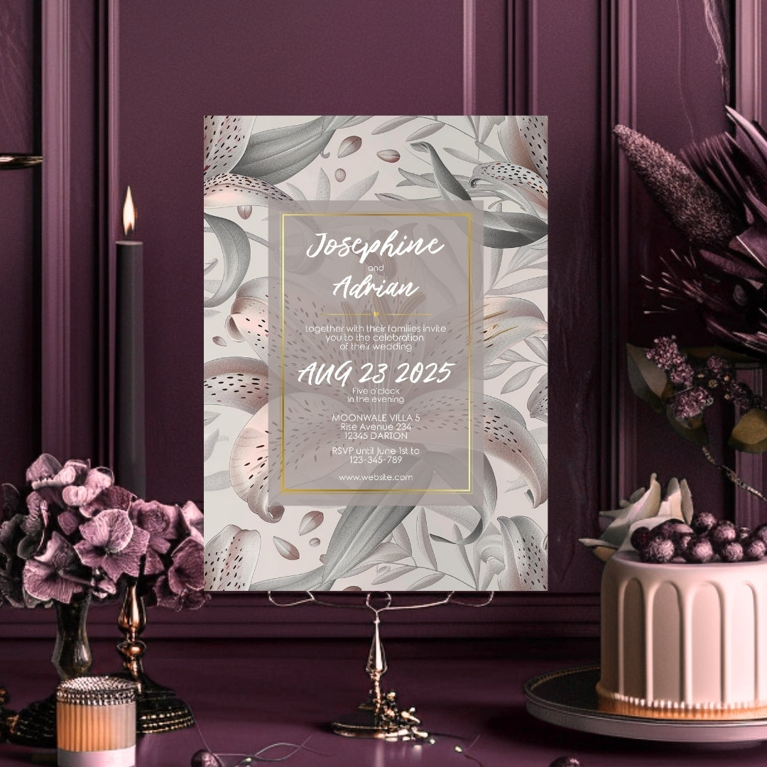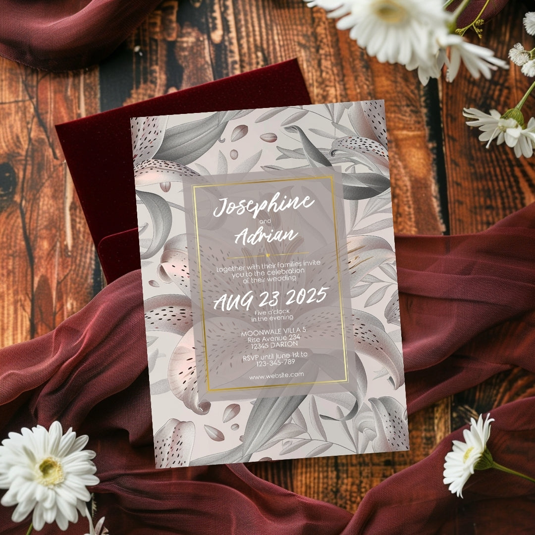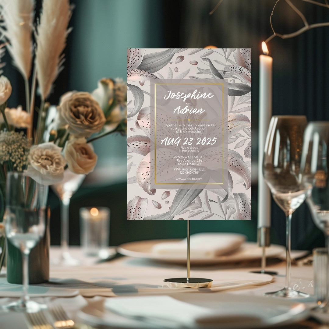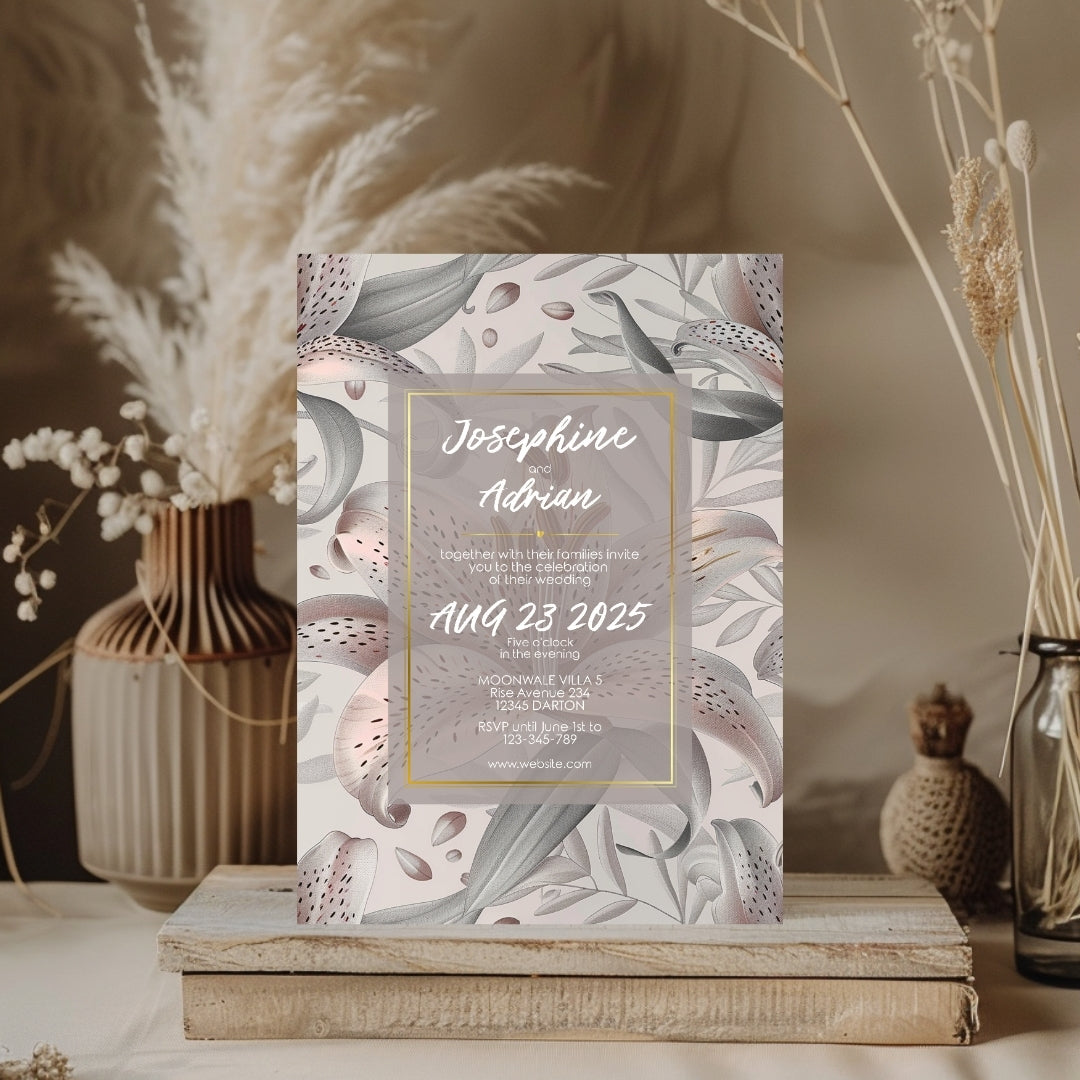 Discover the serene charm of our Lily Harmony Invitation, a digital template designed to convey the sophisticated essence of your special occasion. Perfect for weddings, anniversaries, or any refined celebration, this invitation features delicate lily illustrations with soft grey tones and subtle pink accents. The lilies' elegance, symbolizing purity and devotion, is beautifully framed by a contemporary geometric border, offering a modern twist to the classic floral theme. Customizable via Corjl for a seamless experience, you can personalize every detail, from text to layout, and opt for a digital version or a printable file to encapsulate the grace of your event.