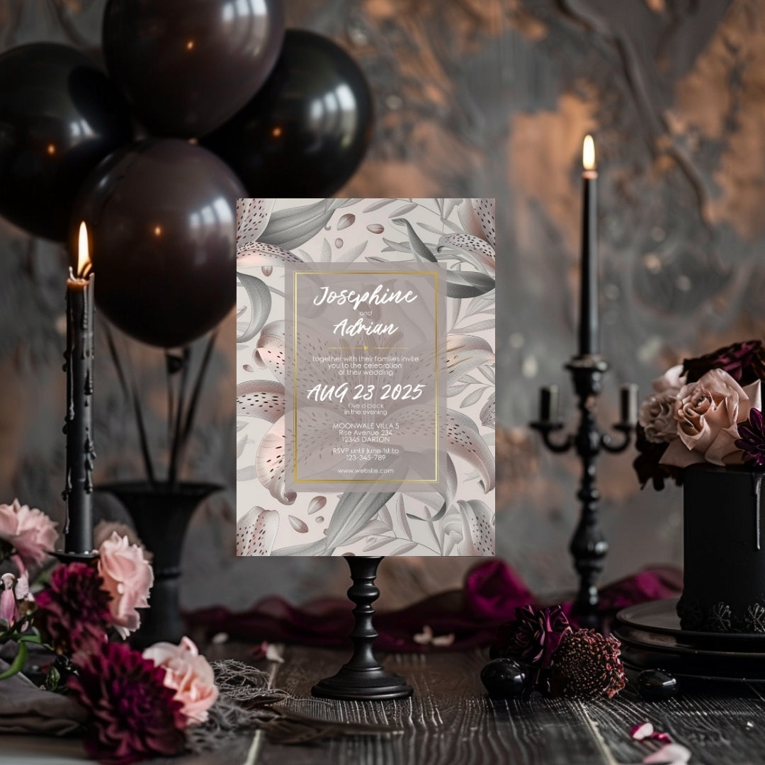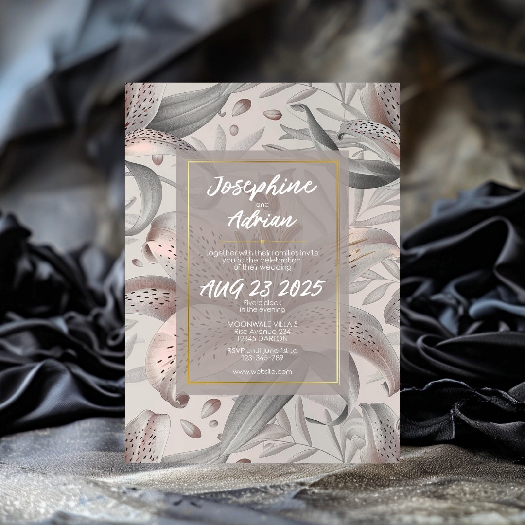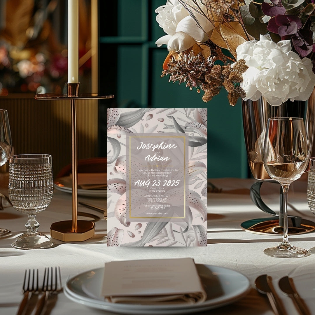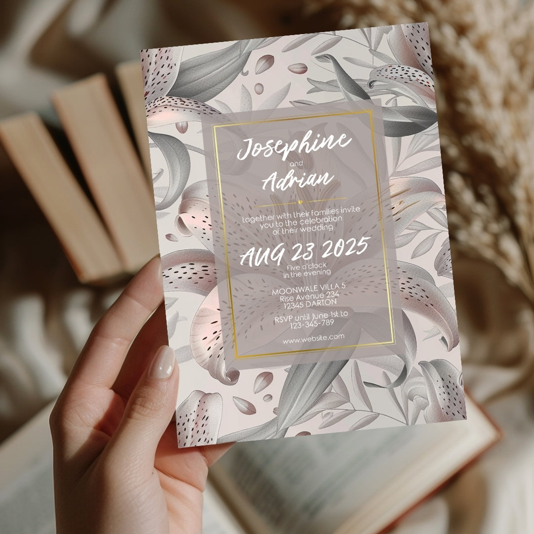 Discover the serene charm of our Lily Harmony Invitation, a digital template designed to convey the sophisticated essence of your special occasion. Perfect for weddings, anniversaries, or any refined celebration, this invitation features delicate lily illustrations with soft grey tones and subtle pink accents. The lilies' elegance, symbolizing purity and devotion, is beautifully framed by a contemporary geometric border, offering a modern twist to the classic floral theme. Customizable via Corjl for a seamless experience, you can personalize every detail, from text to layout, and opt for a digital version or a printable file to encapsulate the grace of your event.