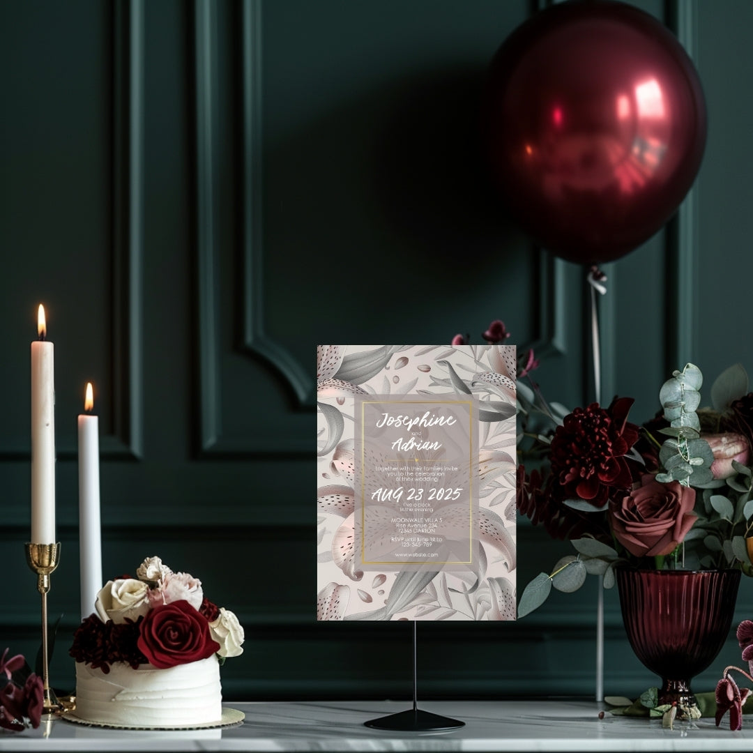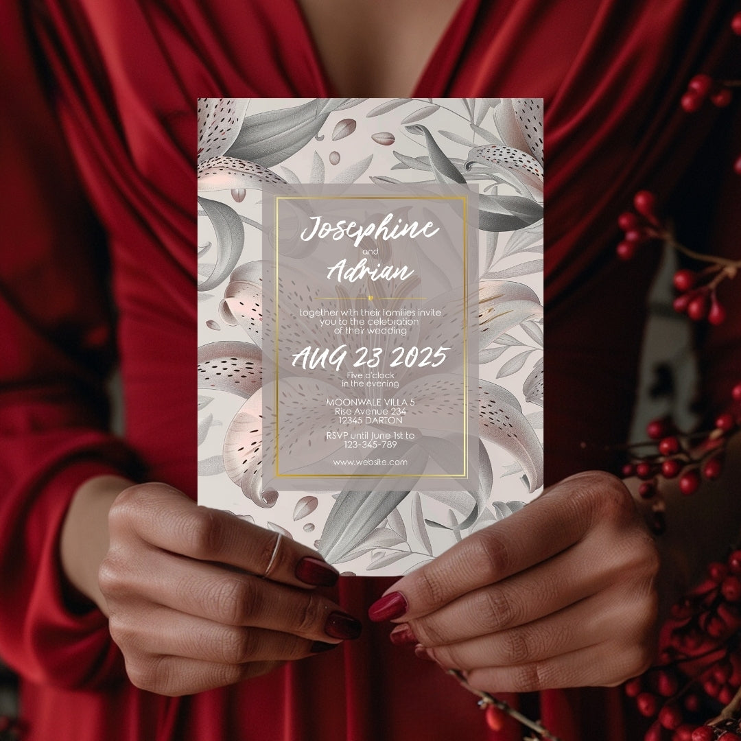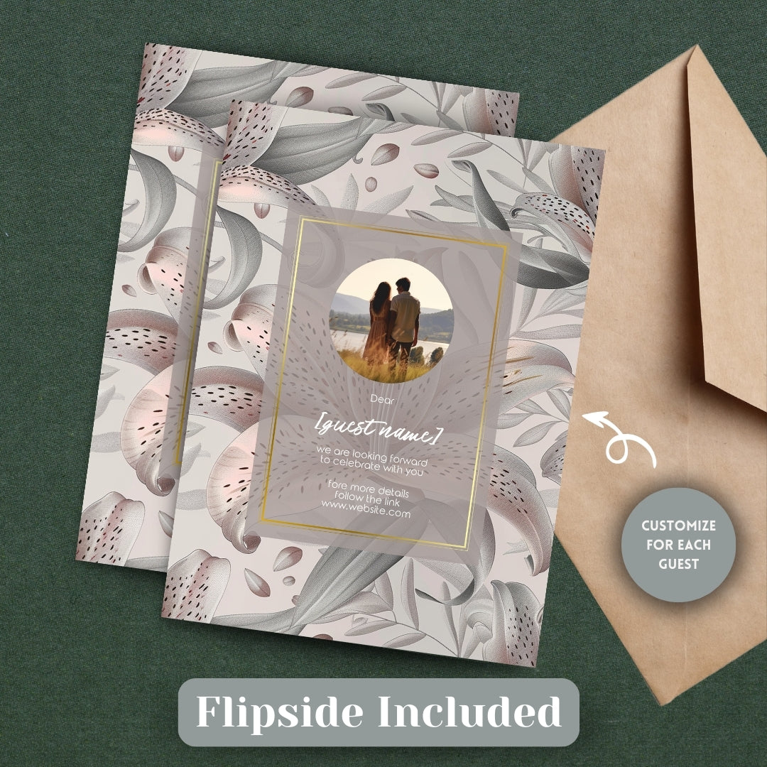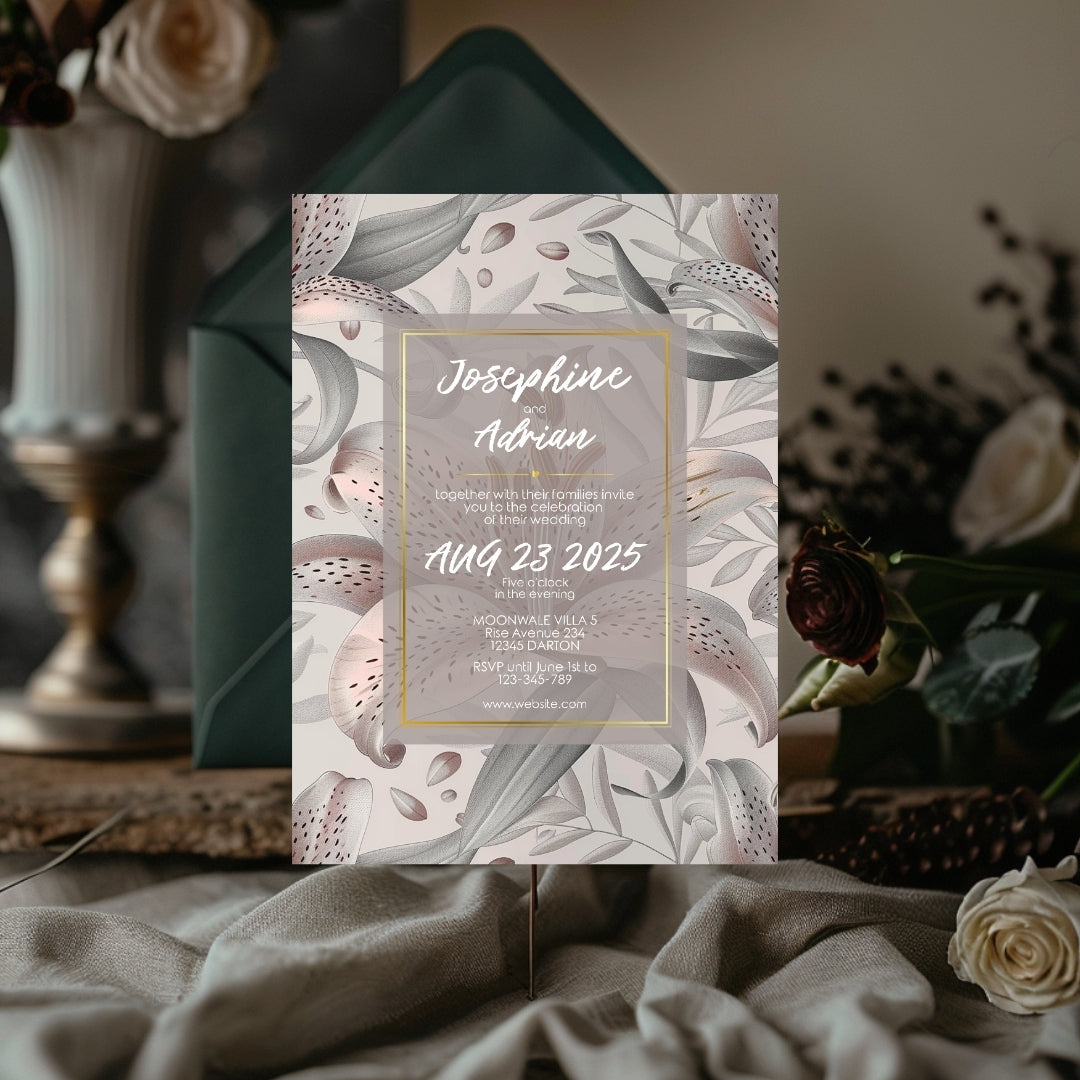 Discover the serene charm of our Lily Harmony Invitation, a digital template designed to convey the sophisticated essence of your special occasion. Perfect for weddings, anniversaries, or any refined celebration, this invitation features delicate lily illustrations with soft grey tones and subtle pink accents. The lilies' elegance, symbolizing purity and devotion, is beautifully framed by a contemporary geometric border, offering a modern twist to the classic floral theme. Customizable via Corjl for a seamless experience, you can personalize every detail, from text to layout, and opt for a digital version or a printable file to encapsulate the grace of your event.