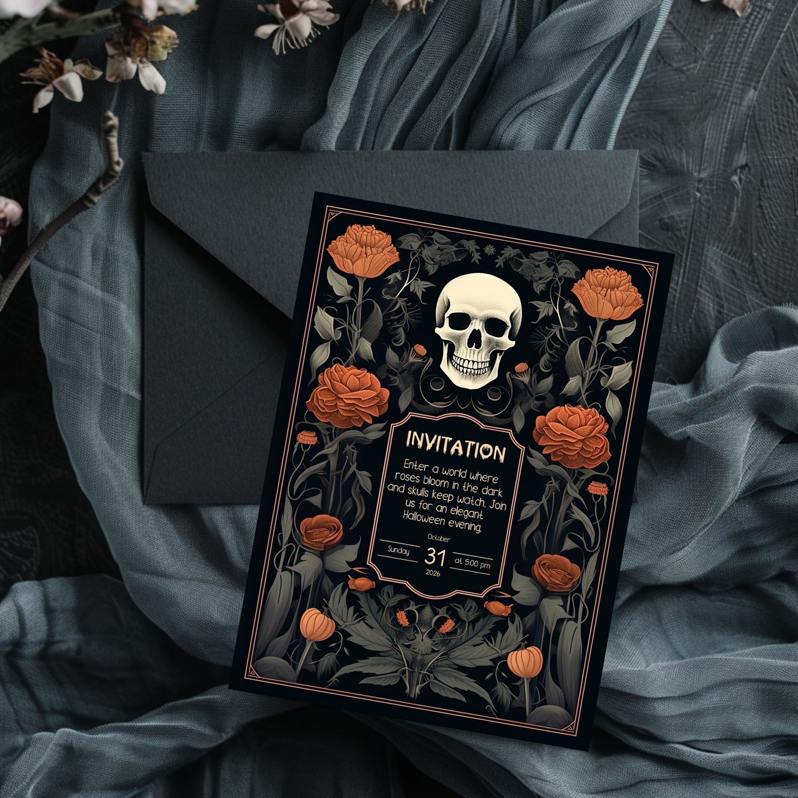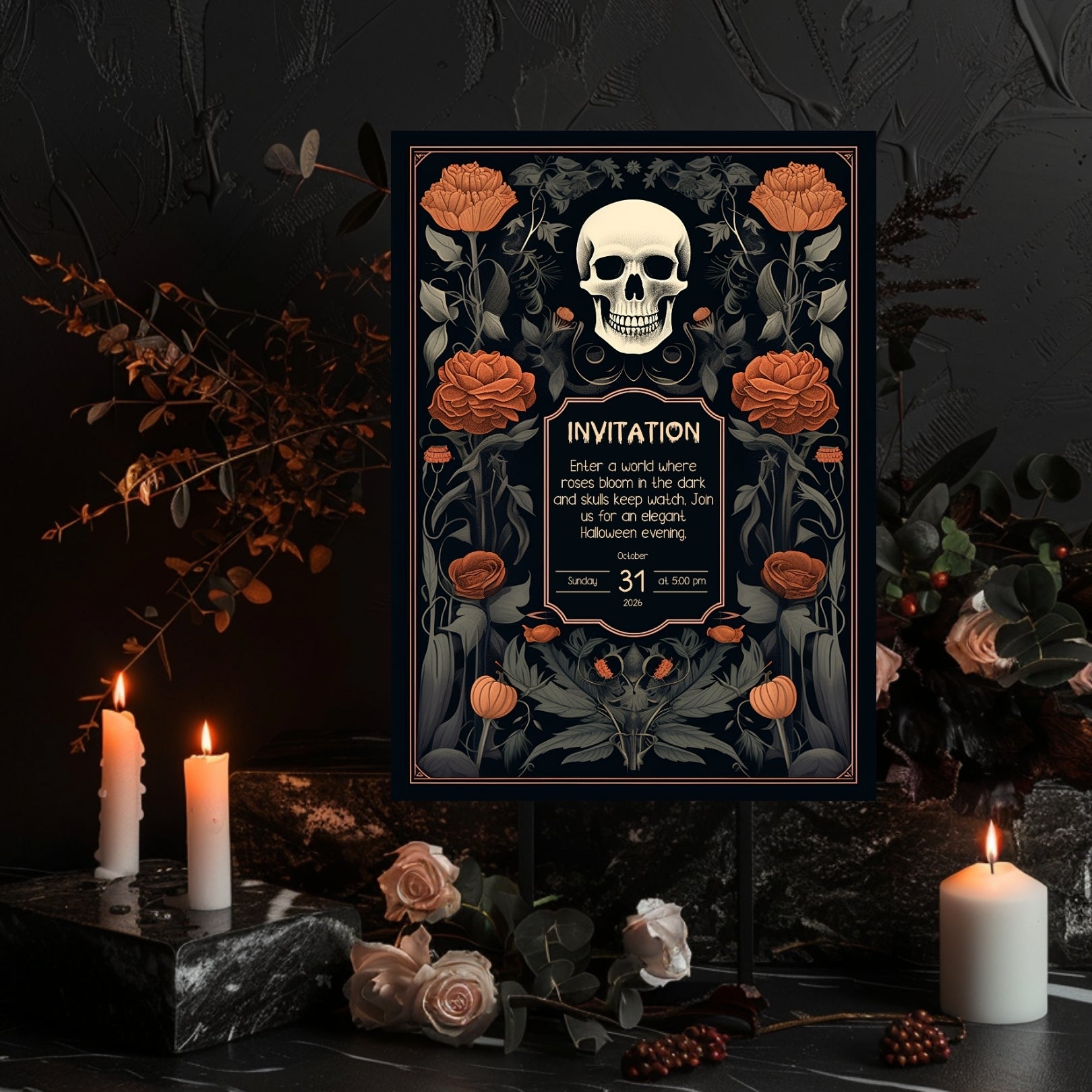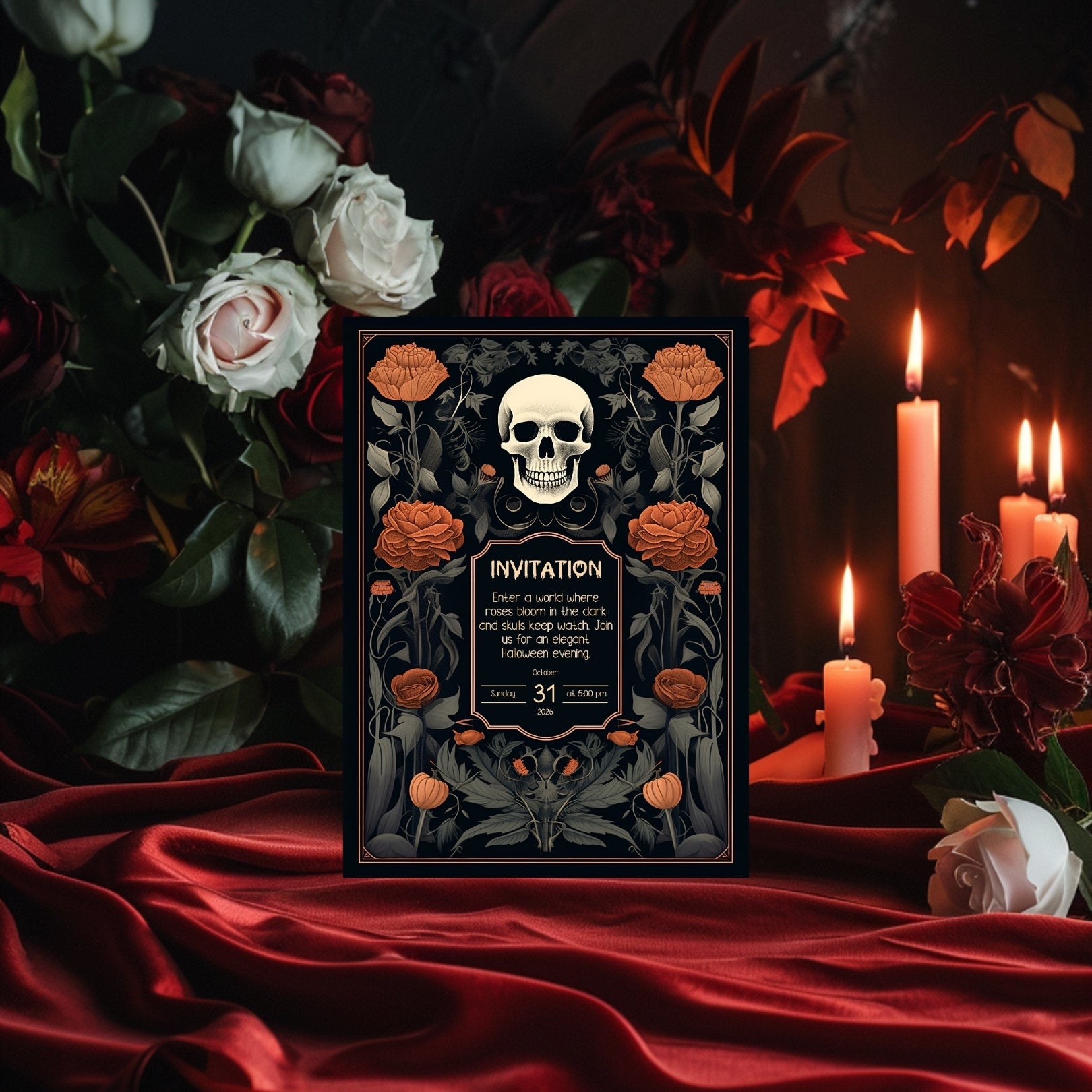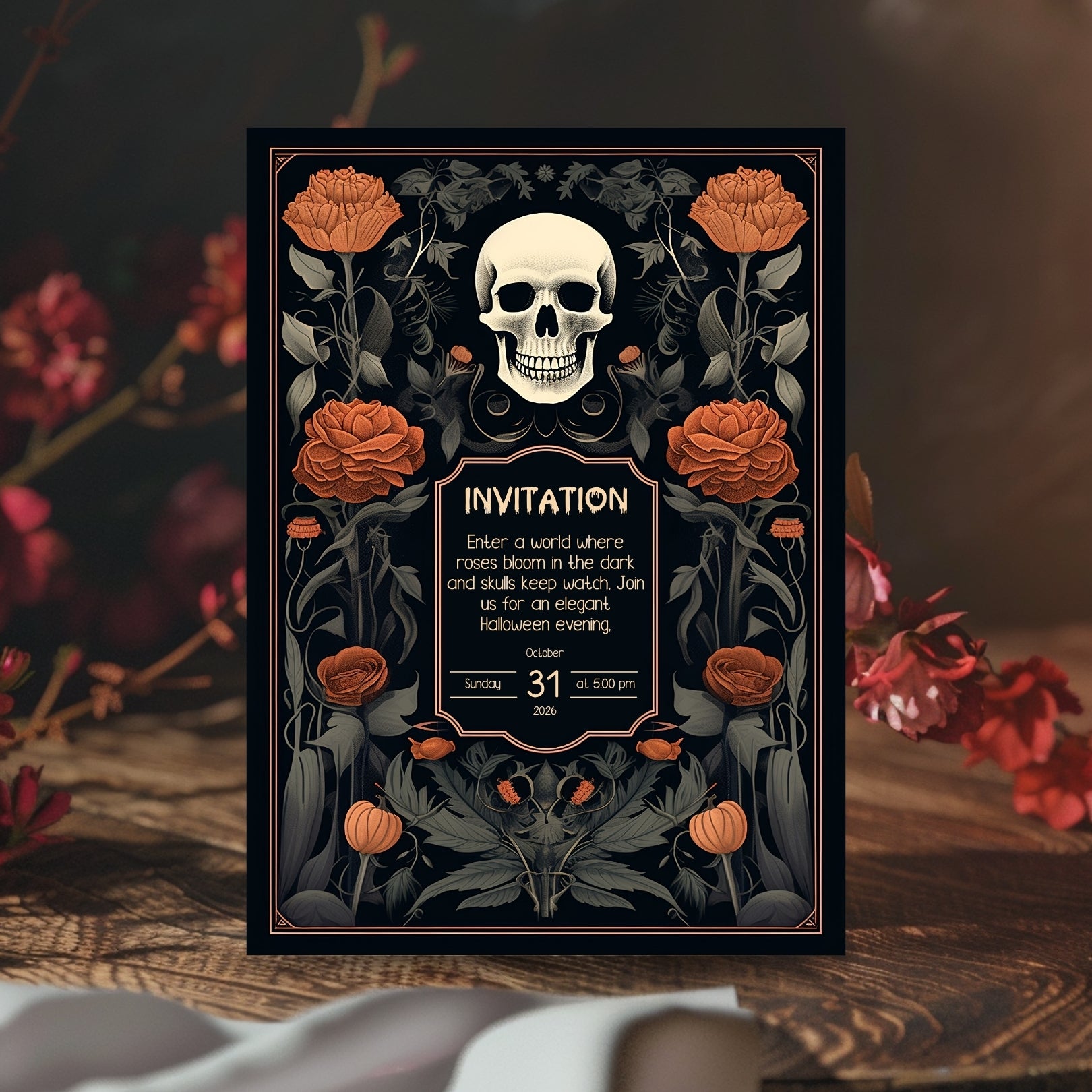 ✔️𝙎𝙩𝙪𝙣𝙣𝙞𝙣𝙜 𝘿𝙚𝙨𝙞𝙜𝙣: This invitation masterfully blends gothic elements with floral elegance, featuring a bold skull centerpiece framed by lush, vibrant roses. The intricate details and rich color palette make it a striking piece for any Halloween celebration.