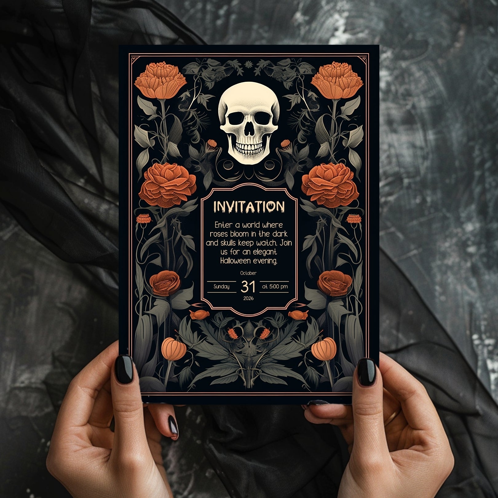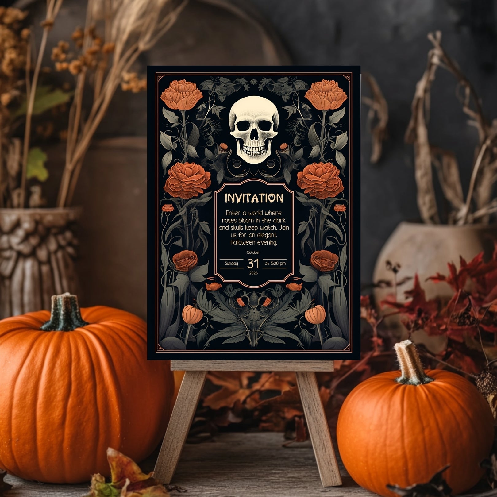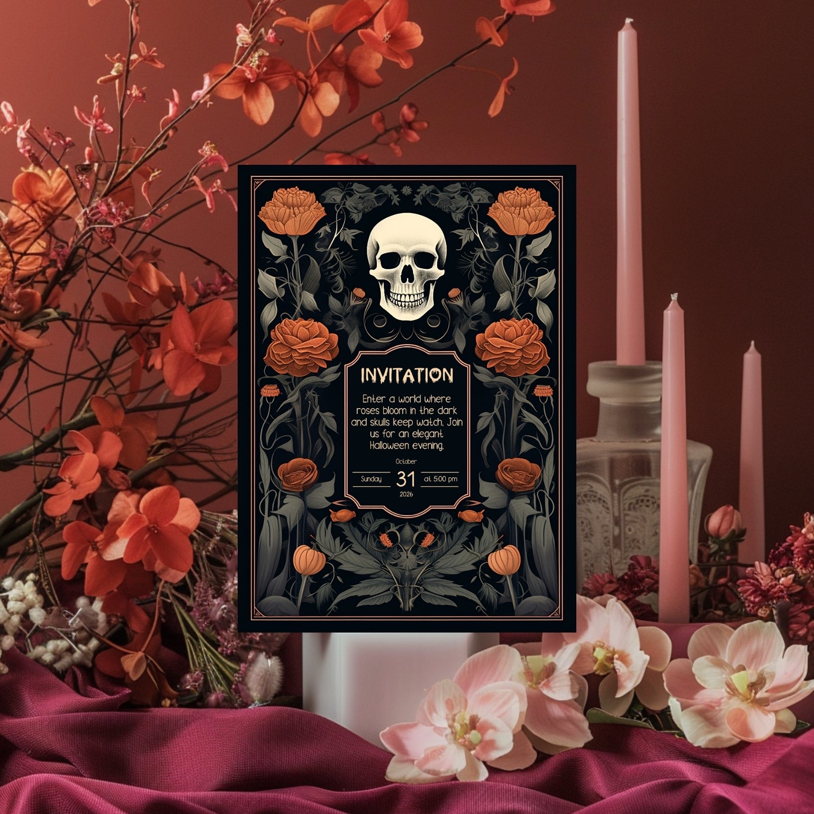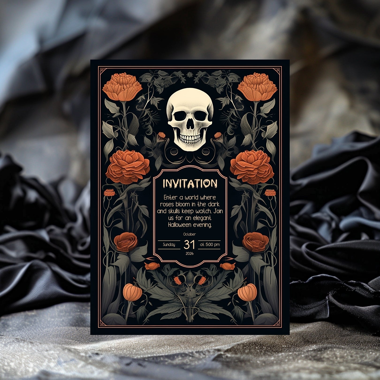 ✔️𝙎𝙩𝙪𝙣𝙣𝙞𝙣𝙜 𝘿𝙚𝙨𝙞𝙜𝙣: This invitation masterfully blends gothic elements with floral elegance, featuring a bold skull centerpiece framed by lush, vibrant roses. The intricate details and rich color palette make it a striking piece for any Halloween celebration.