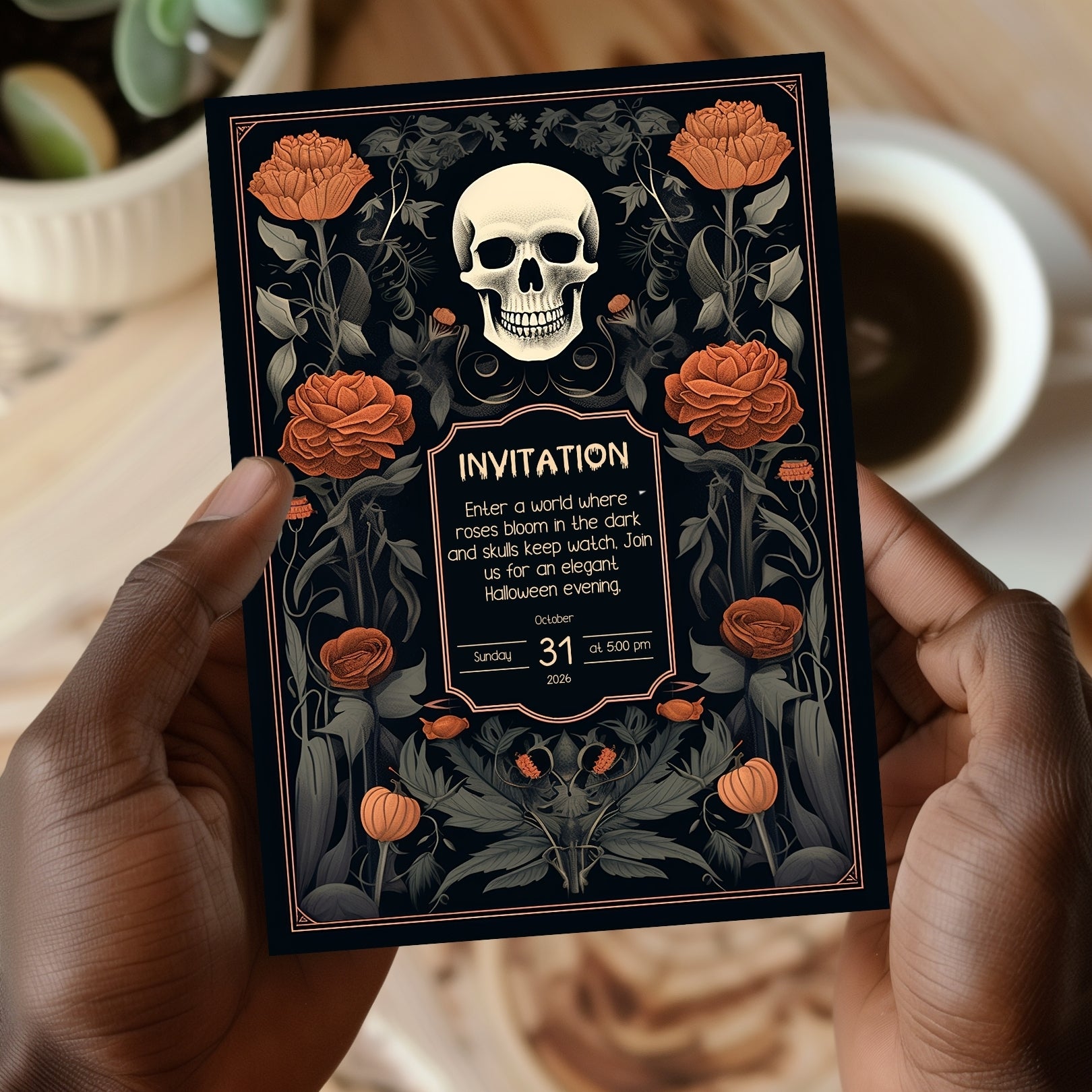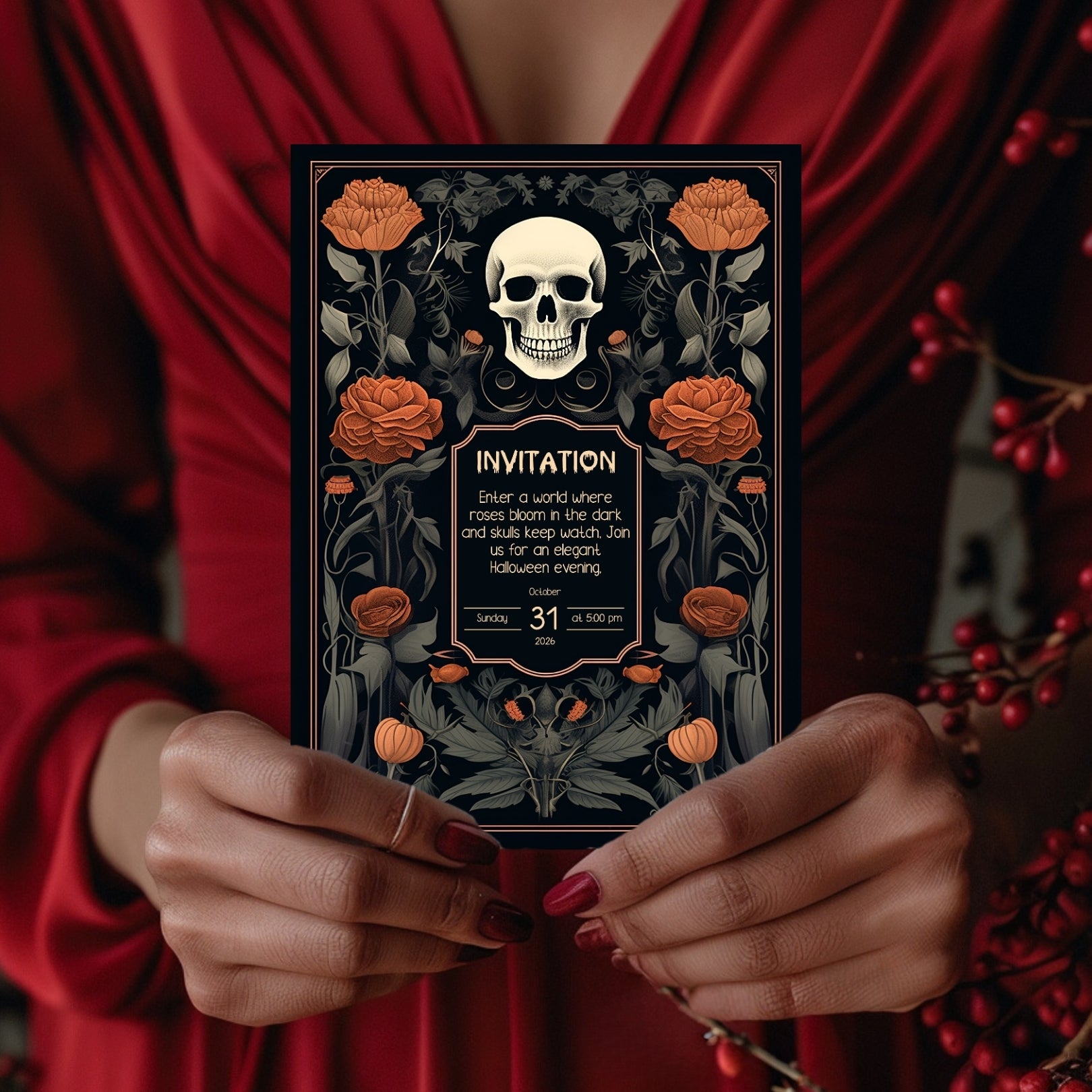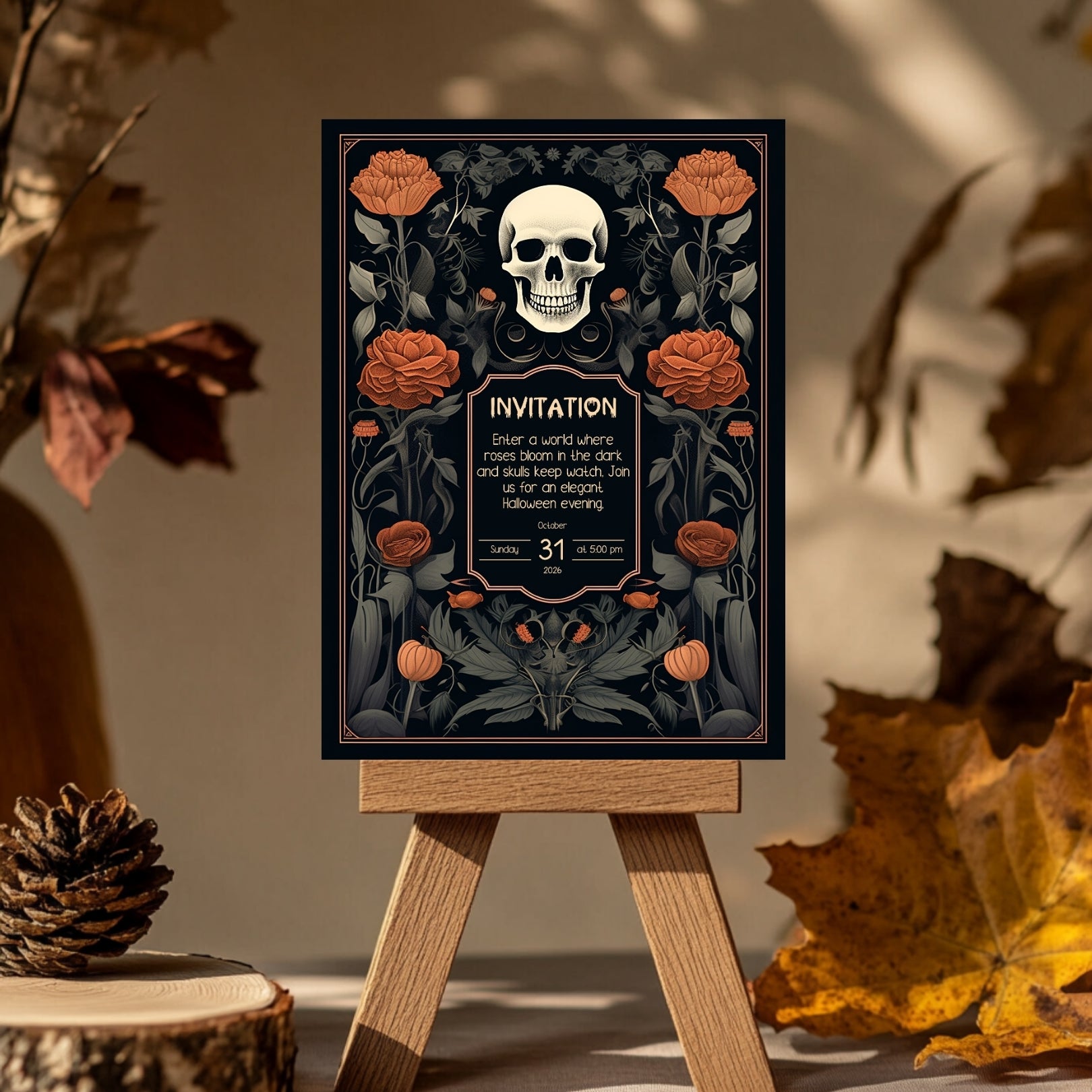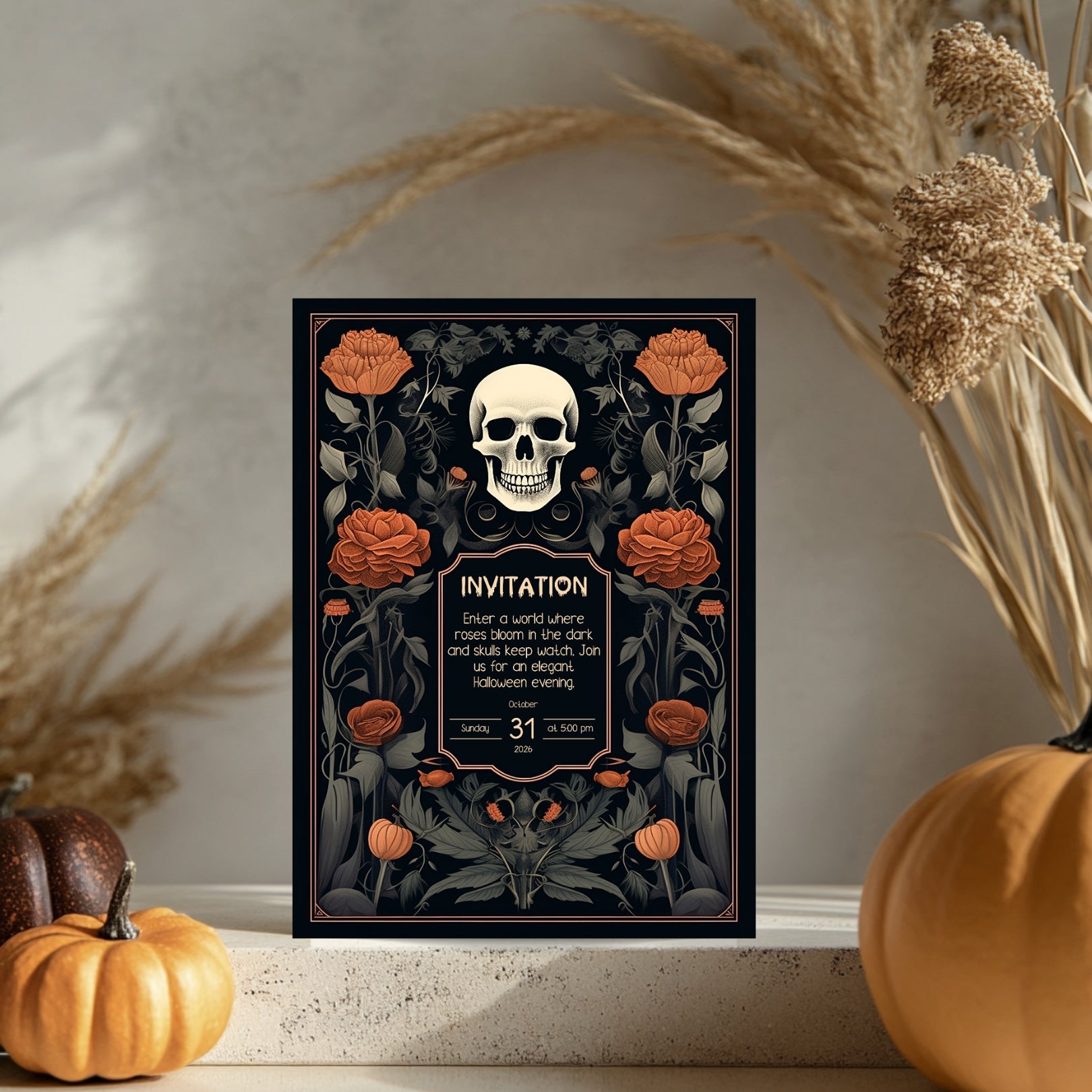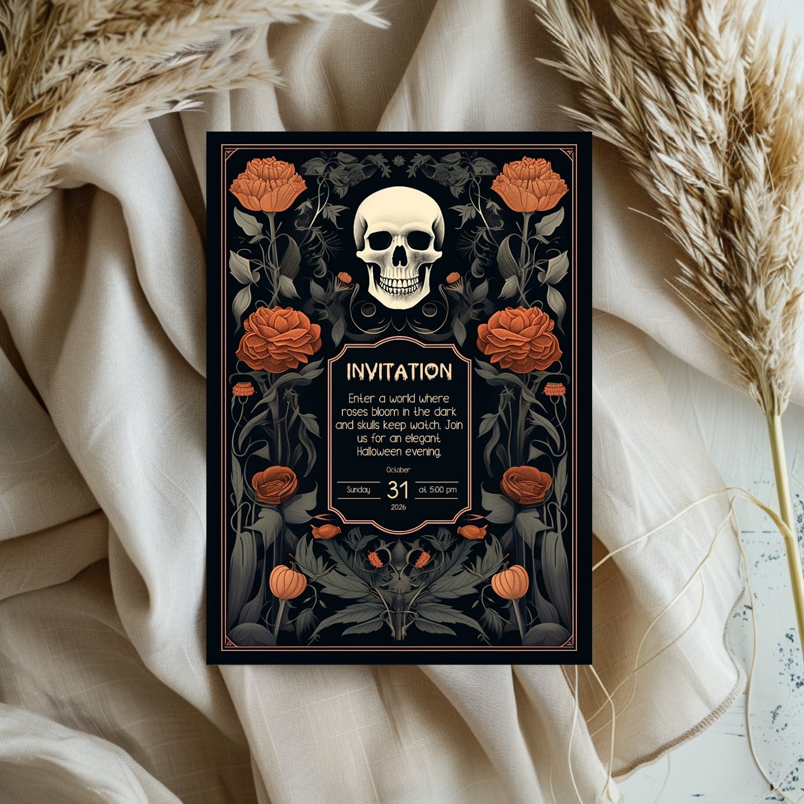✔️𝙎𝙩𝙪𝙣𝙣𝙞𝙣𝙜 𝘿𝙚𝙨𝙞𝙜𝙣: This invitation masterfully blends gothic elements with floral elegance, featuring a bold skull centerpiece framed by lush, vibrant roses. The intricate details and rich color palette make it a striking piece for any Halloween celebration.