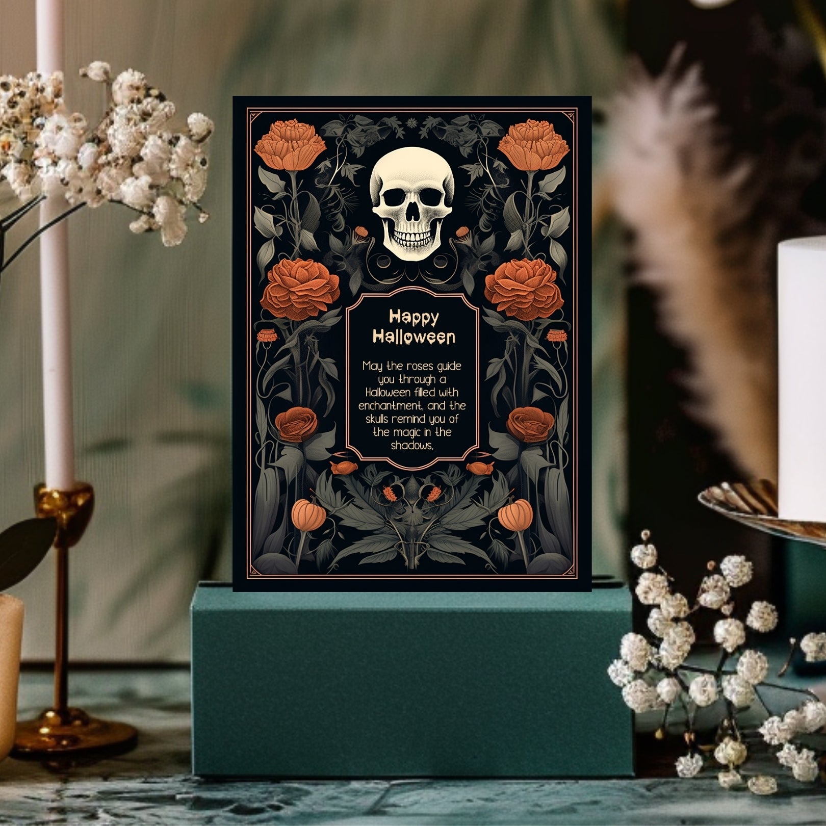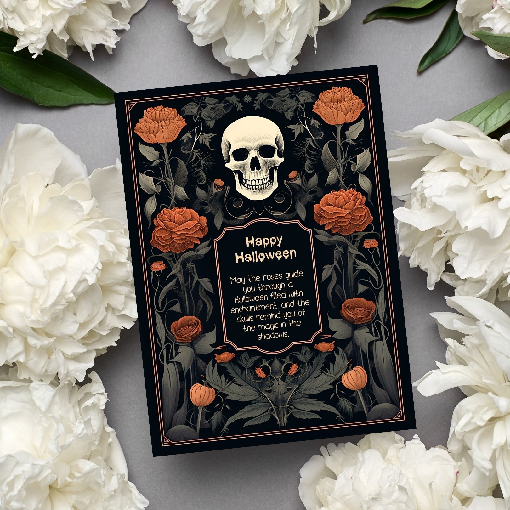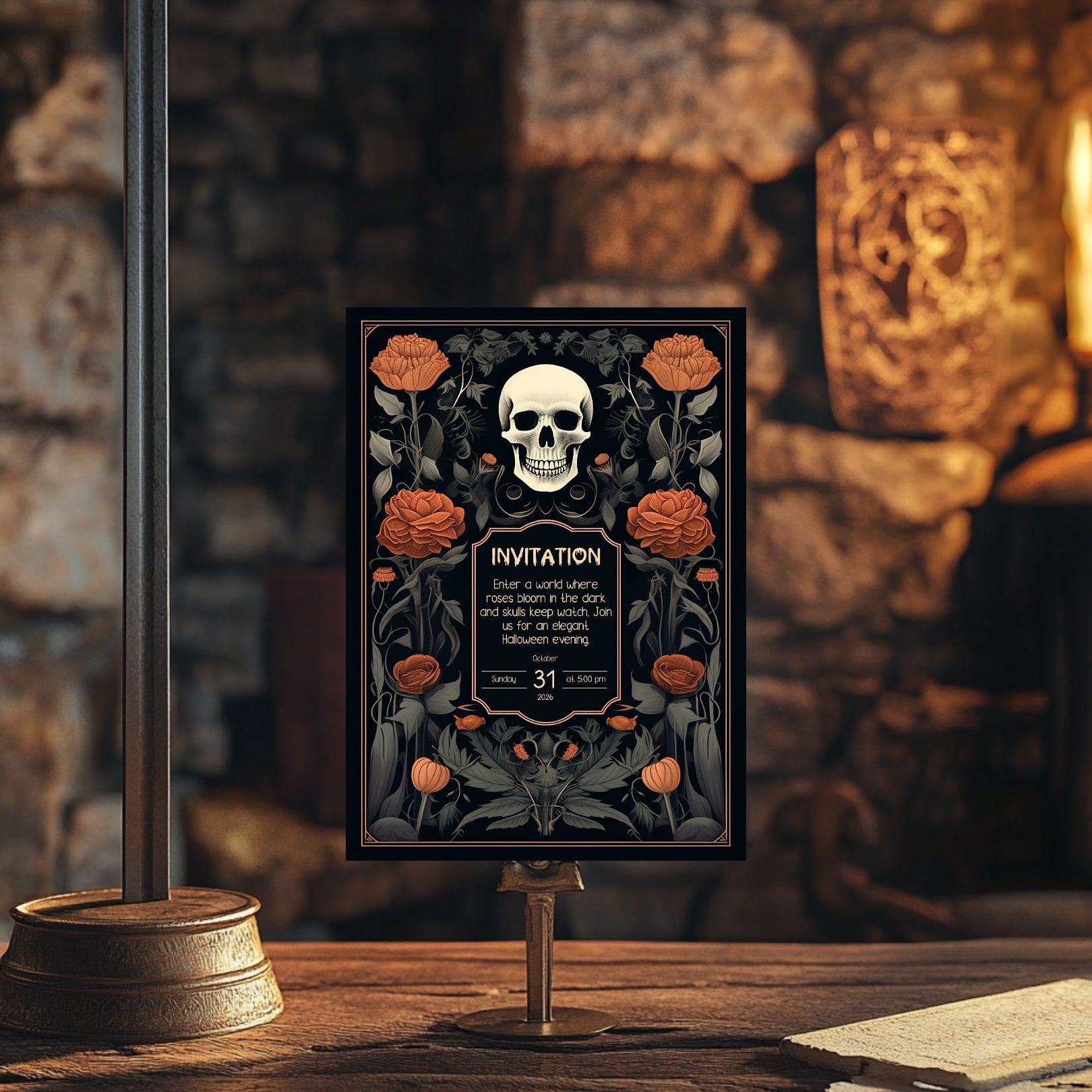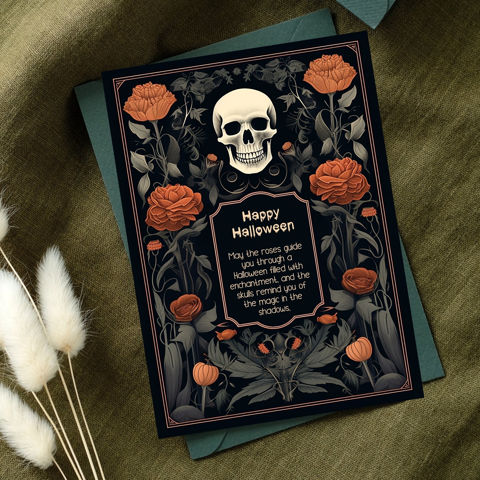 ✔️𝙎𝙩𝙪𝙣𝙣𝙞𝙣𝙜 𝘿𝙚𝙨𝙞𝙜𝙣: This invitation masterfully blends gothic elements with floral elegance, featuring a bold skull centerpiece framed by lush, vibrant roses. The intricate details and rich color palette make it a striking piece for any Halloween celebration.