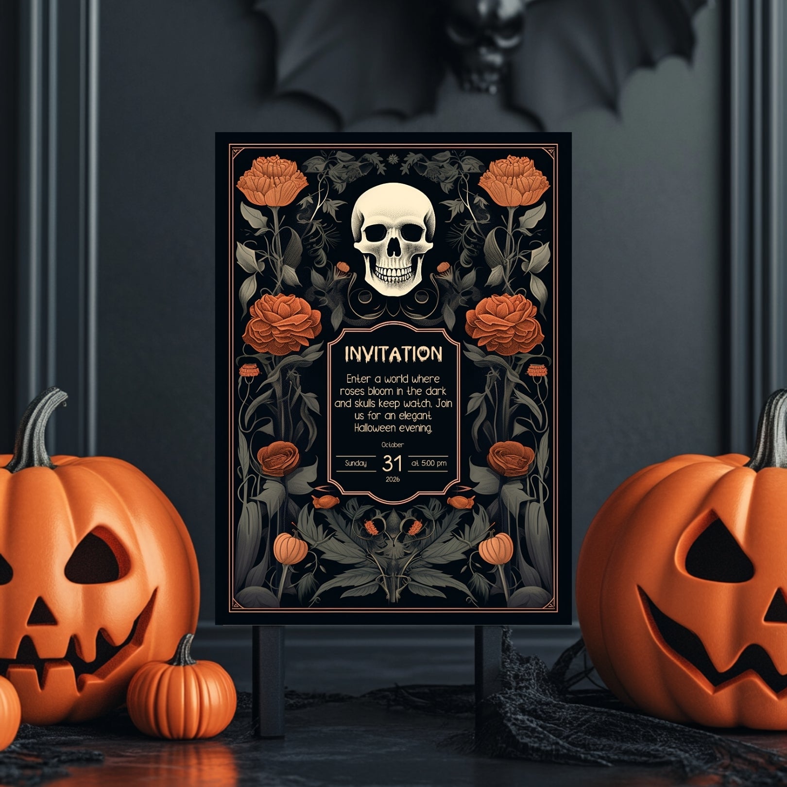 Enter a world where roses bloom in the dark and skulls keep watch with this Gothic Halloween Invitation. Perfect for an elegant Halloween evening, this invitation features a central skull surrounded by vibrant orange roses and delicate botanical elements. The dark floral design creates a stunning contrast against the deep black background, making this the ideal choice for a sophisticated Halloween event.