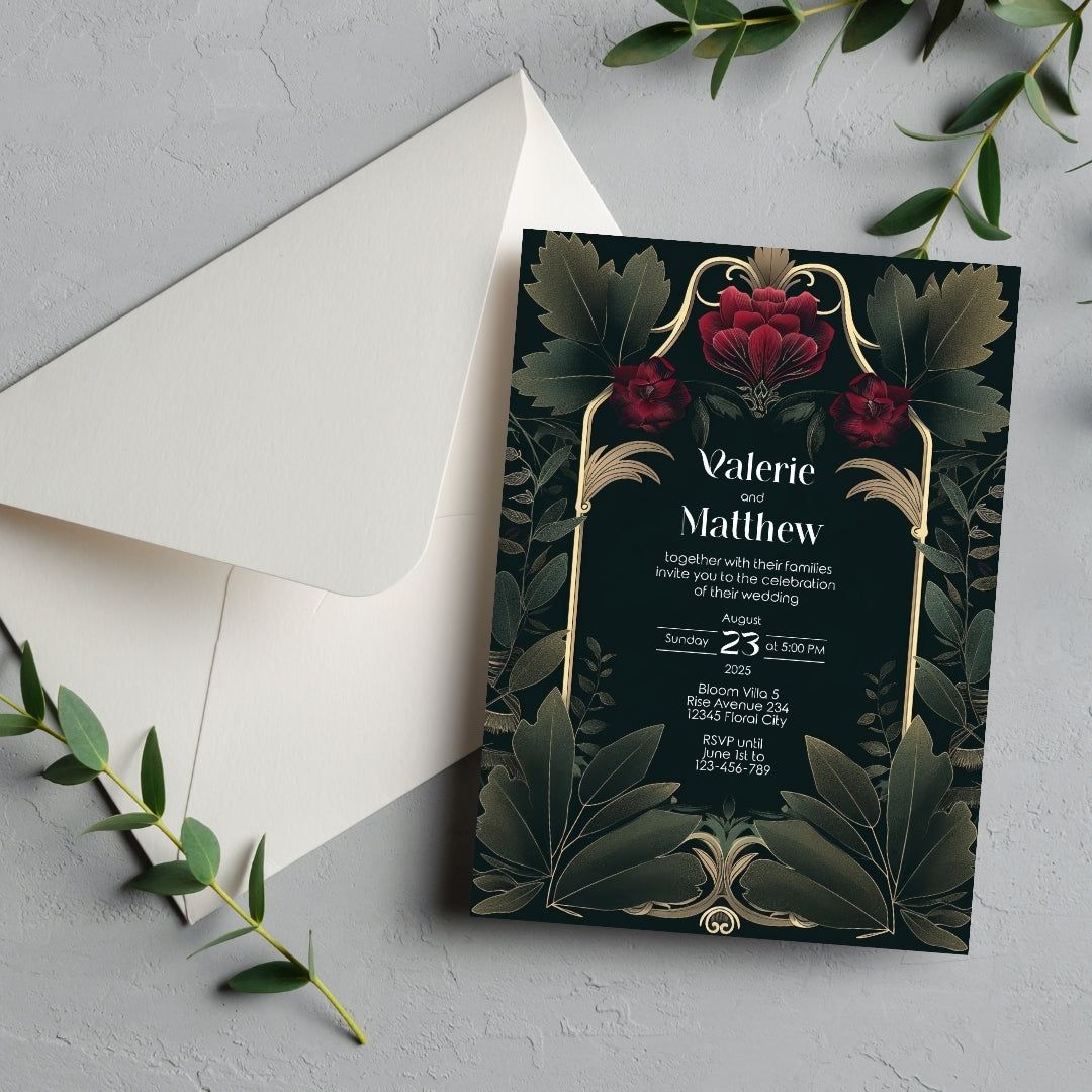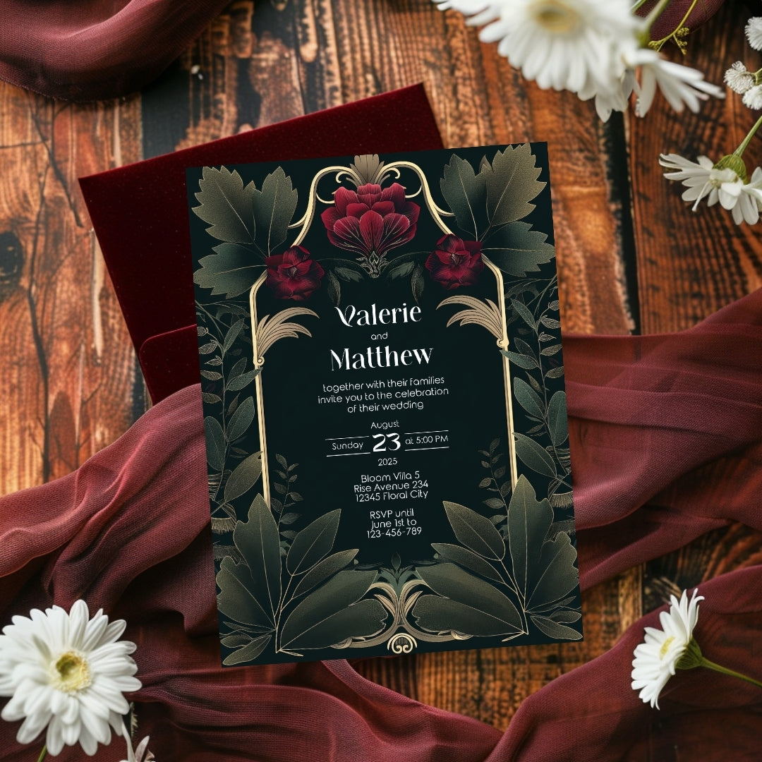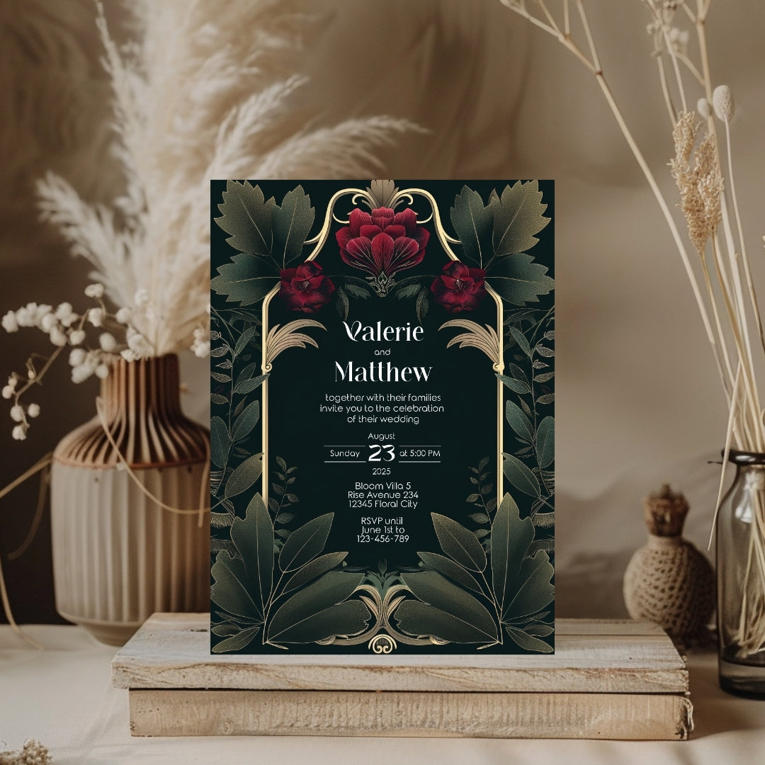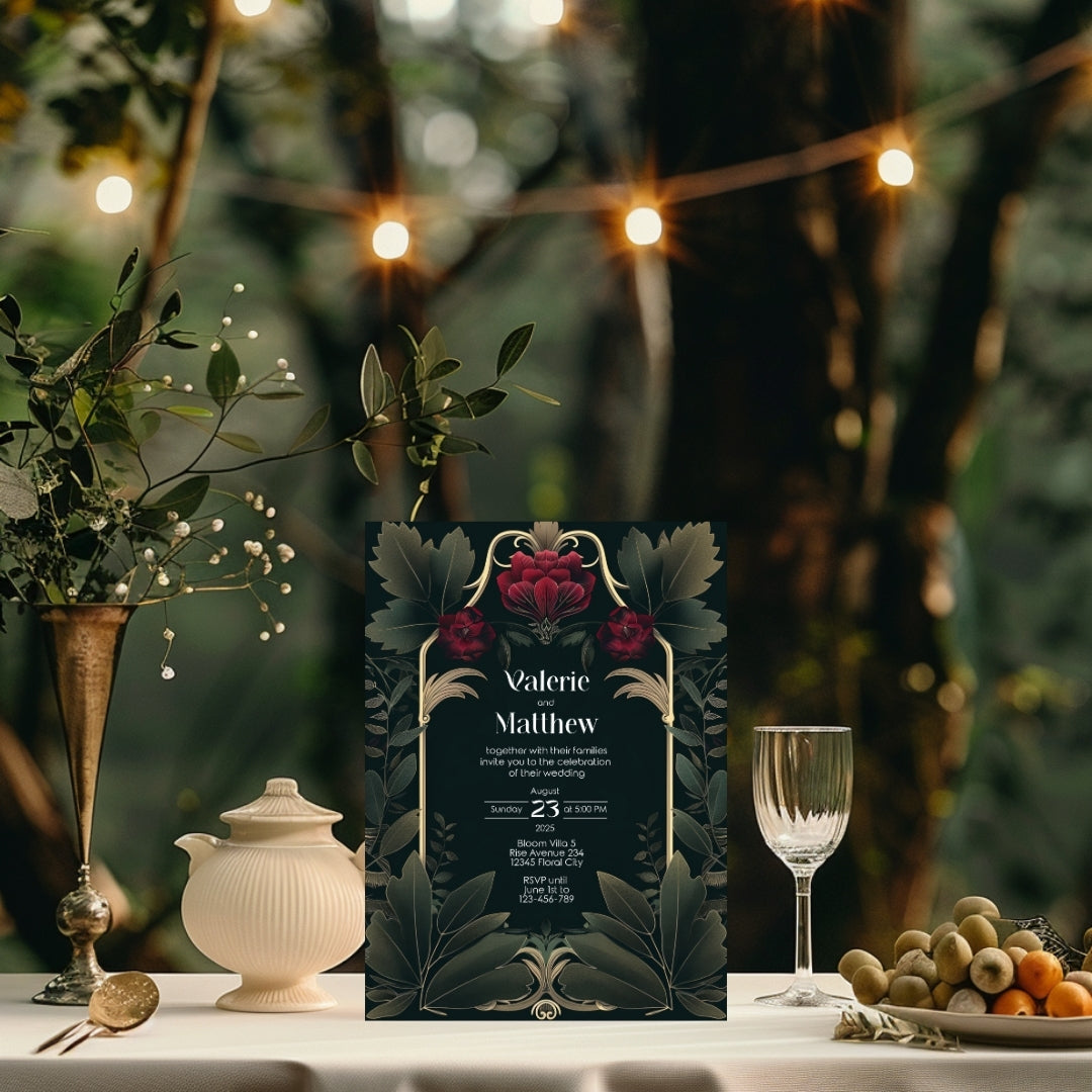 Encapsulate the essence of your special day with our Opulent Botanical Frame Wedding Invitation, designed to imbue your announcement with a blend of luxury and natural elegance. The dark, sumptuous backdrop serves as the perfect contrast to the radiant floral highlights and the refined gold foliage that frames your event's details. Ideal for setting an enchanting atmosphere for a wedding, significant anniversary, or a grand birthday festivity, this template is replete with the charm of a sophisticated gala. Fully customizable with Corjl, you can tailor this template to your event's specifics and opt for a digital send-out or a printed keepsake. This invitation isn't just a mere announcement; it's the opening chapter to the unforgettable story you're about to tell.