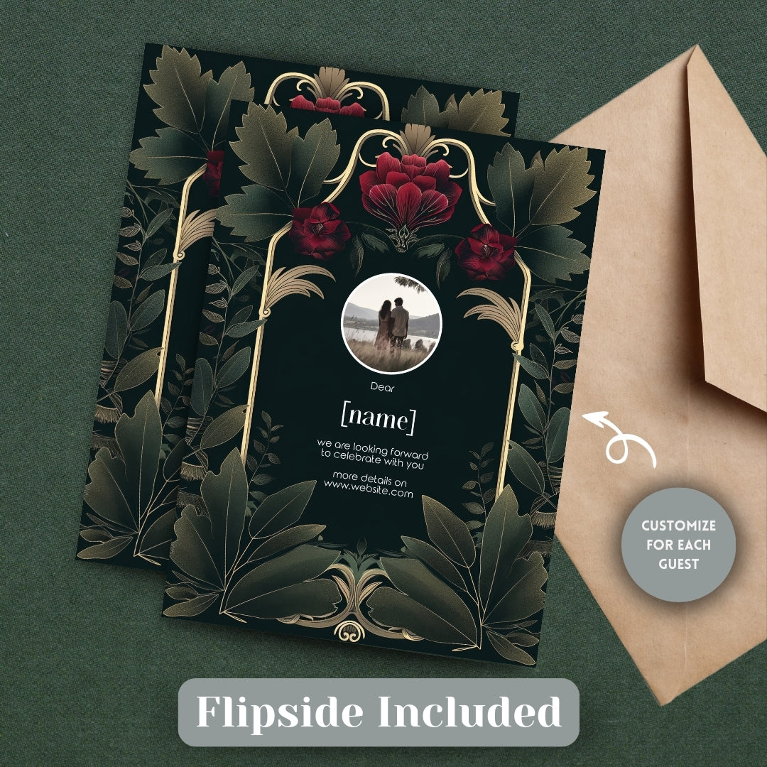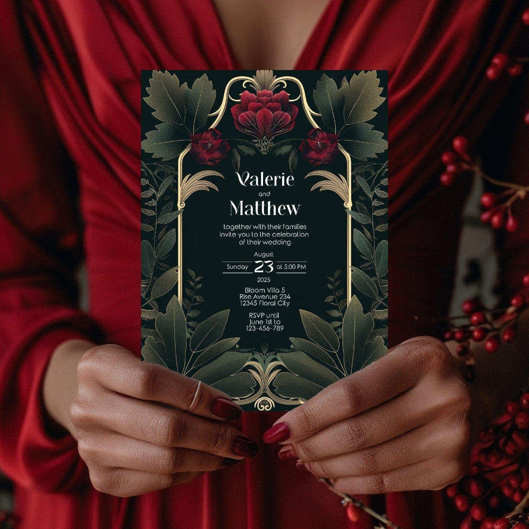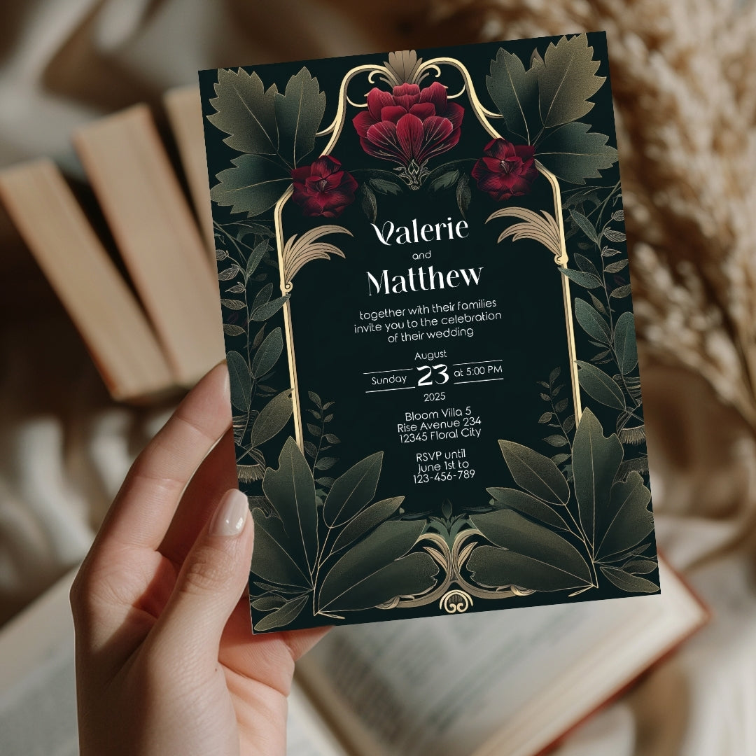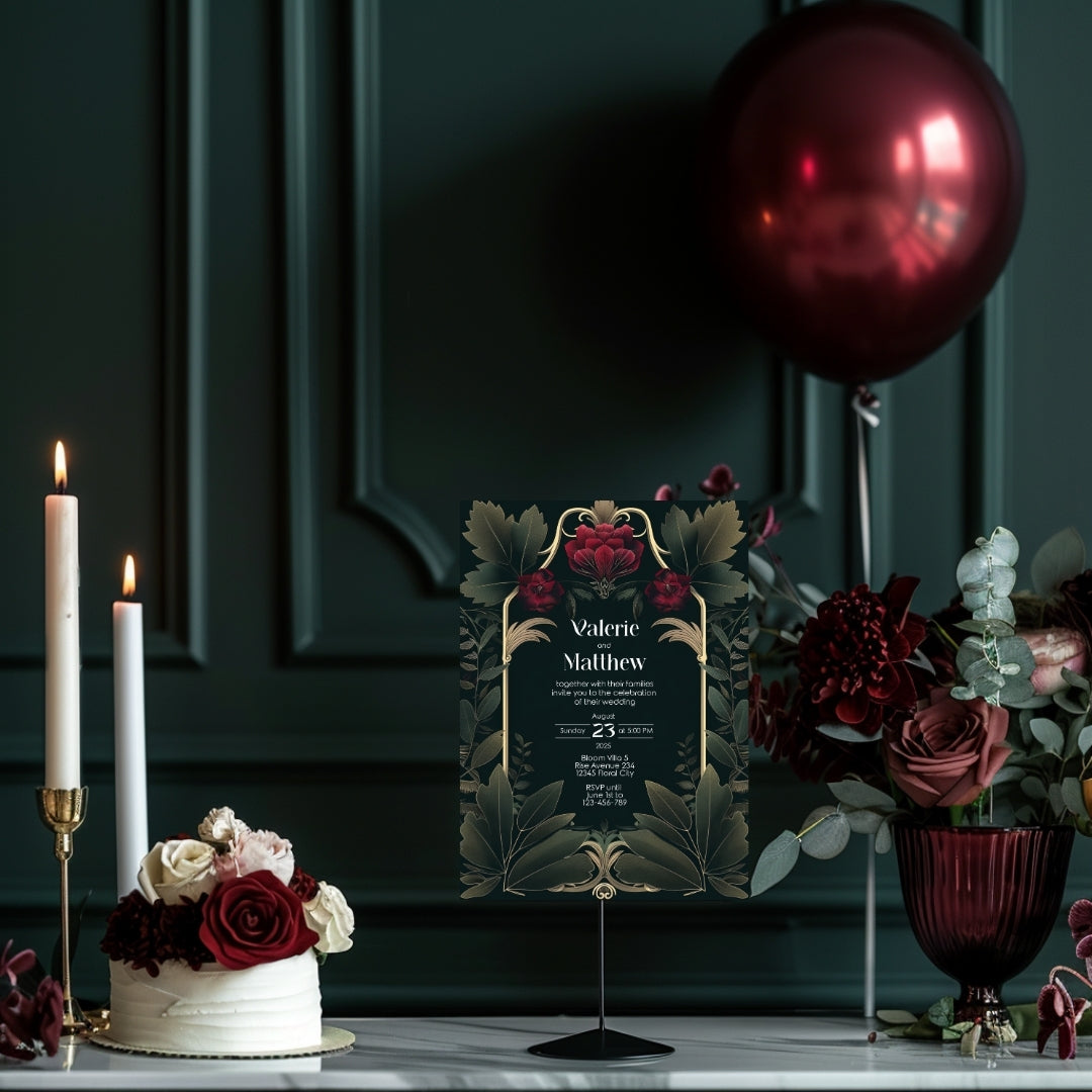Encapsulate the essence of your special day with our Opulent Botanical Frame Wedding Invitation, designed to imbue your announcement with a blend of luxury and natural elegance. The dark, sumptuous backdrop serves as the perfect contrast to the radiant floral highlights and the refined gold foliage that frames your event's details. Ideal for setting an enchanting atmosphere for a wedding, significant anniversary, or a grand birthday festivity, this template is replete with the charm of a sophisticated gala. Fully customizable with Corjl, you can tailor this template to your event's specifics and opt for a digital send-out or a printed keepsake. This invitation isn't just a mere announcement; it's the opening chapter to the unforgettable story you're about to tell.