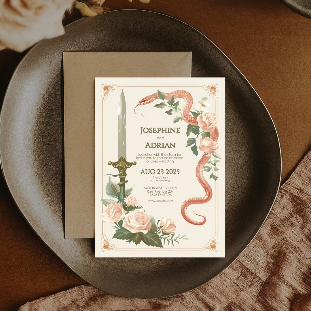Step into a realm of historic charm with our Serpent and Sword Invitation Template, a digital masterpiece ready for your customization on Corjl. Perfect for weddings, bridal showers, and a myriad of special events, its blend of a noble sword and entwining serpent amidst vintage florals conjures an ambiance of enchanting tales. This invitation offers a romantic, elegant aesthetic, ensuring a memorable first impression. Edit with ease and print right at home for a personalized touch to your timeless event.