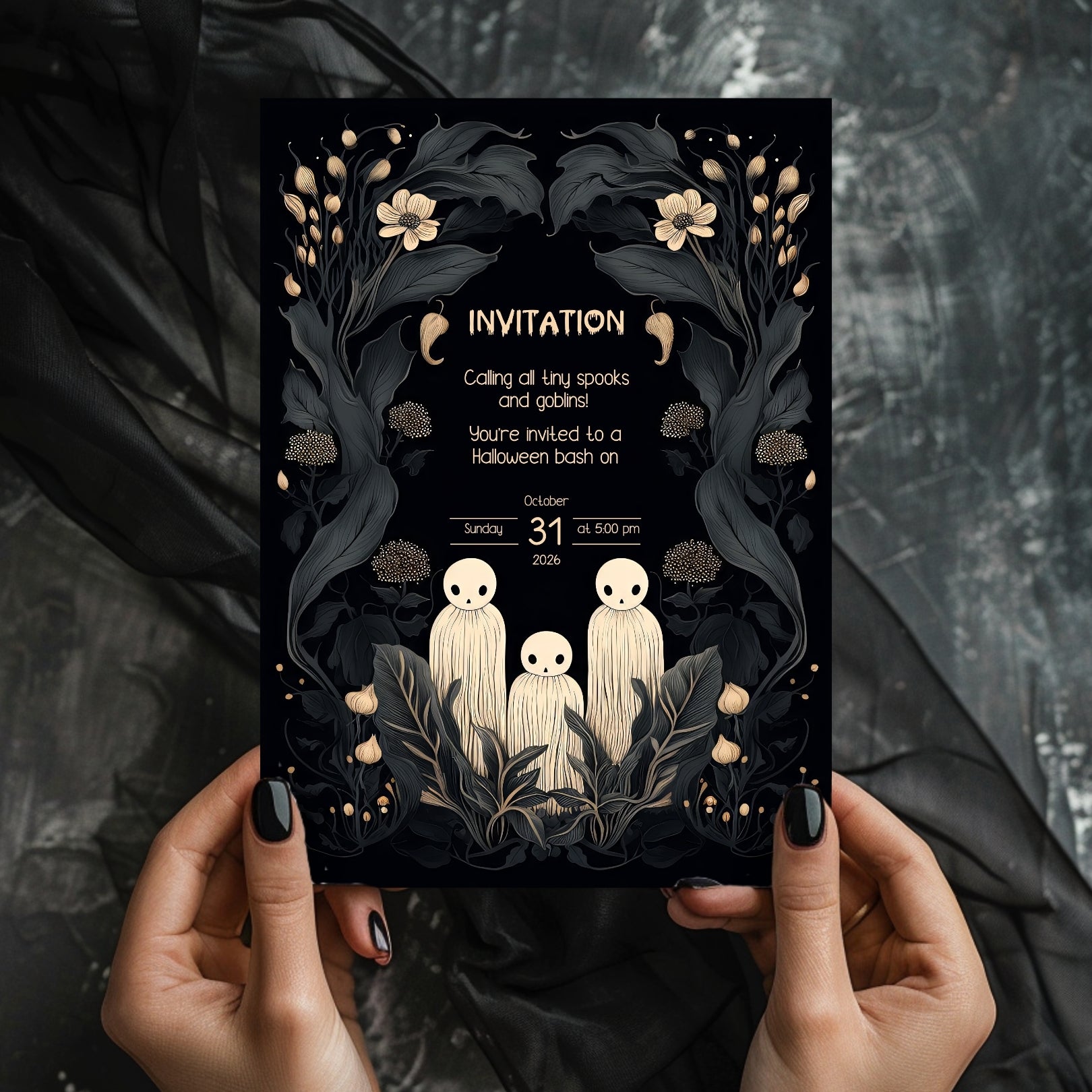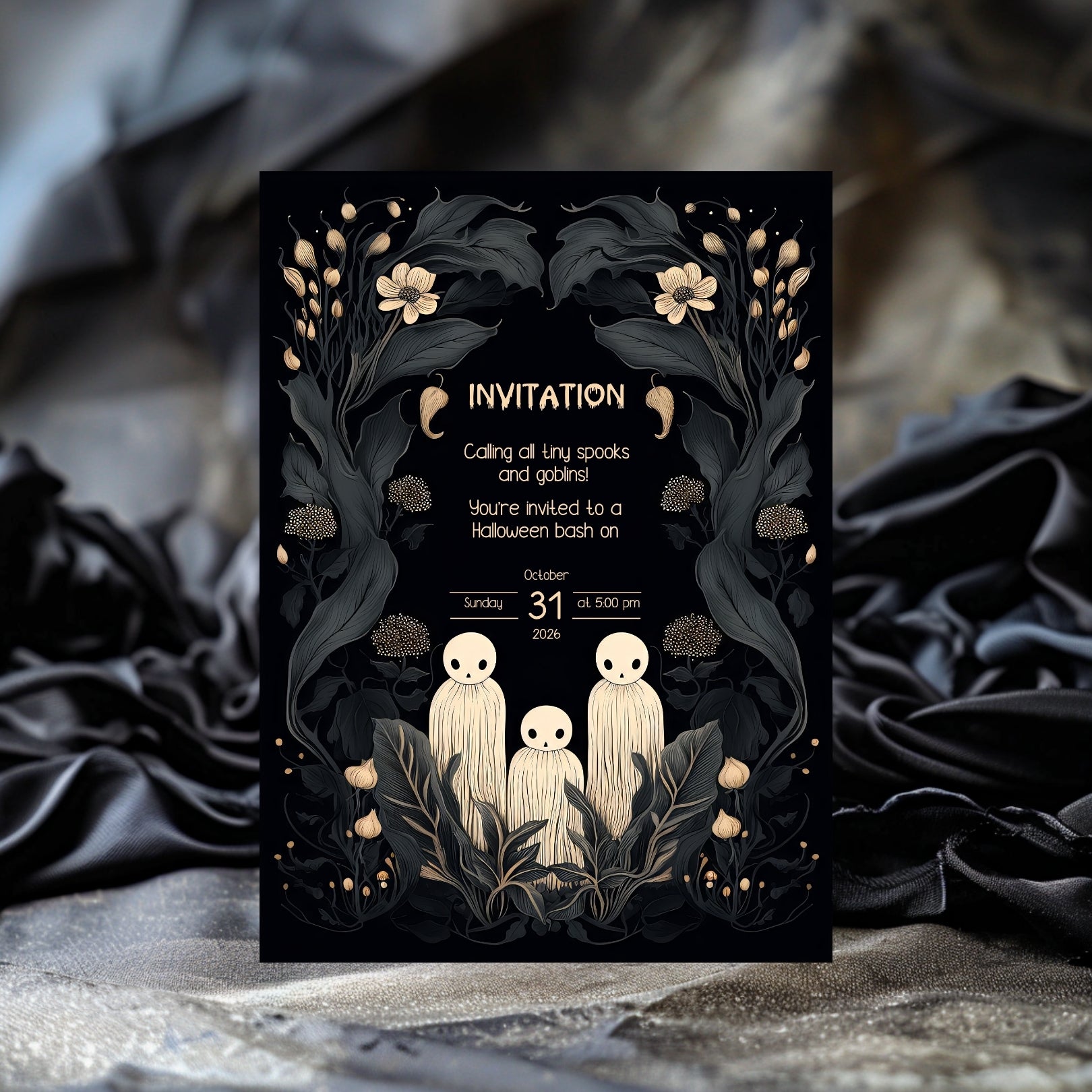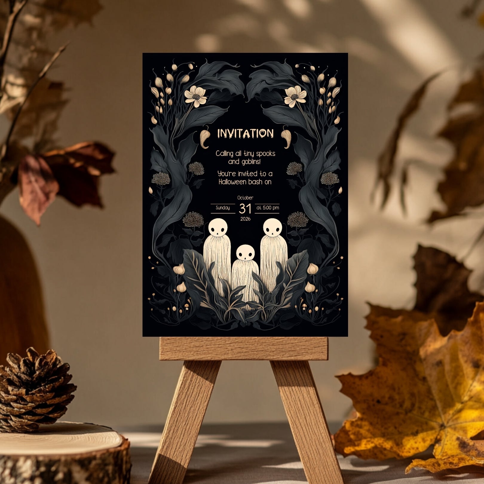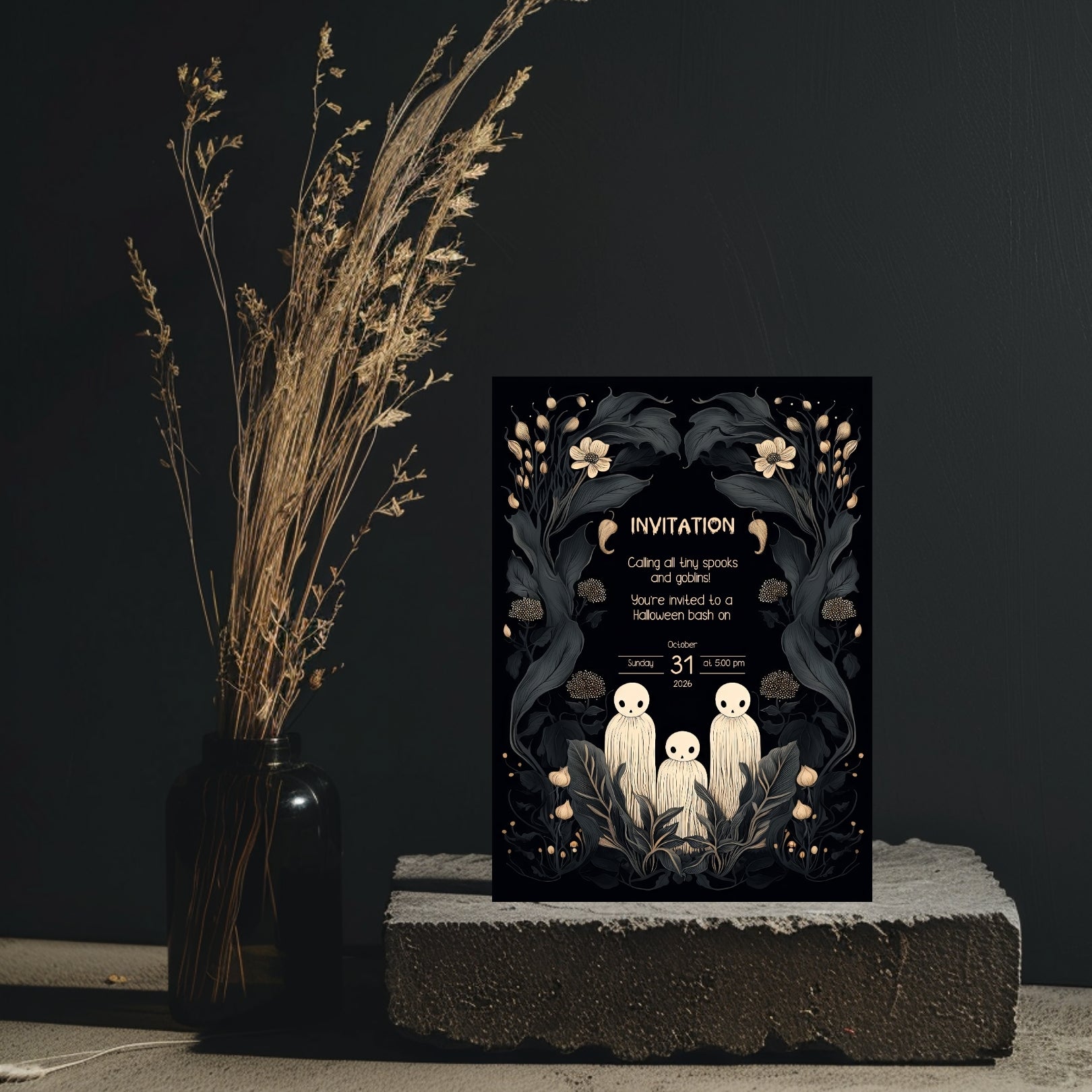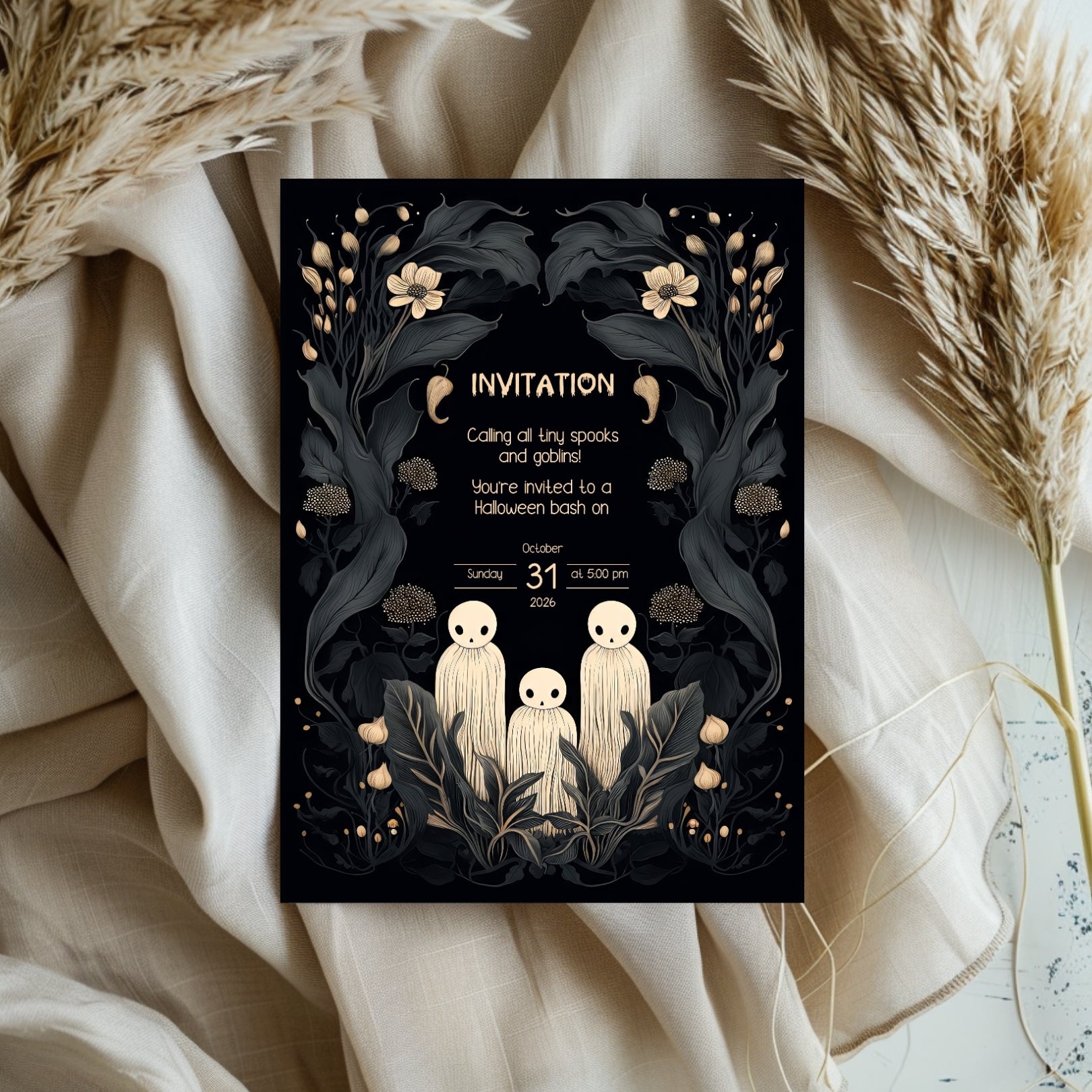 Whimsical Gothic Halloween Invitation - Cute Ghost and Botanical Design
